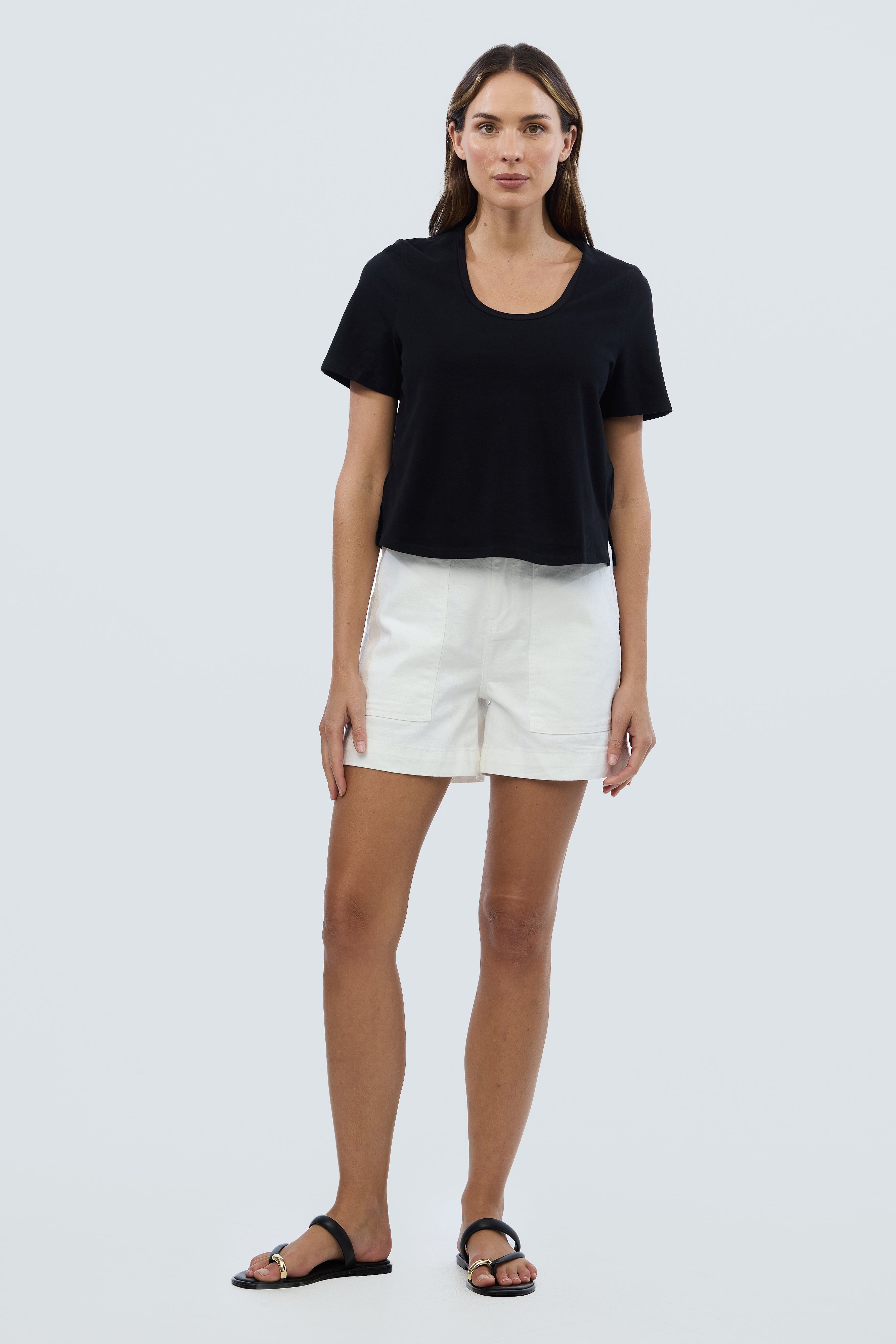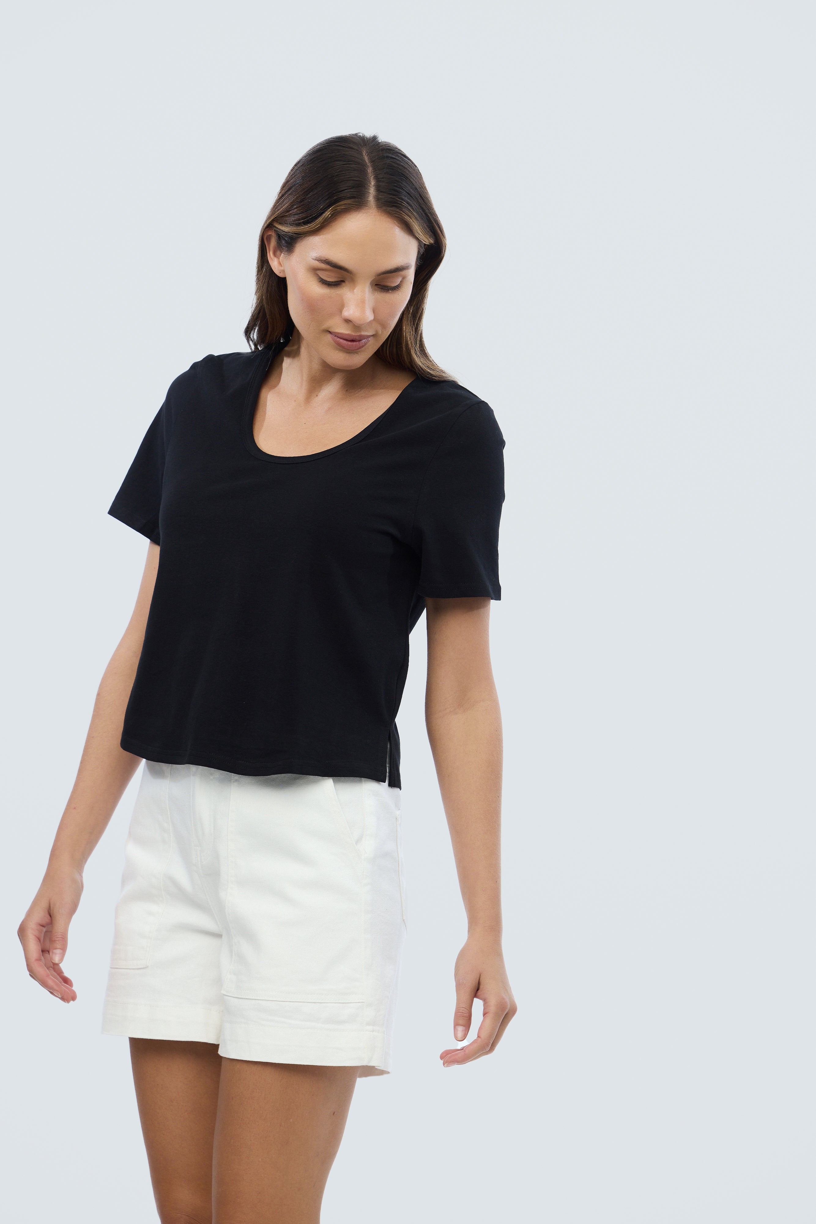 An everyday staple, the Scoop Neck T-Shirt in Black is a regular-fit, mid-length style crafted in mid-weight stretch jersey, designed to pair effortlessly with everything in your wardrobe.