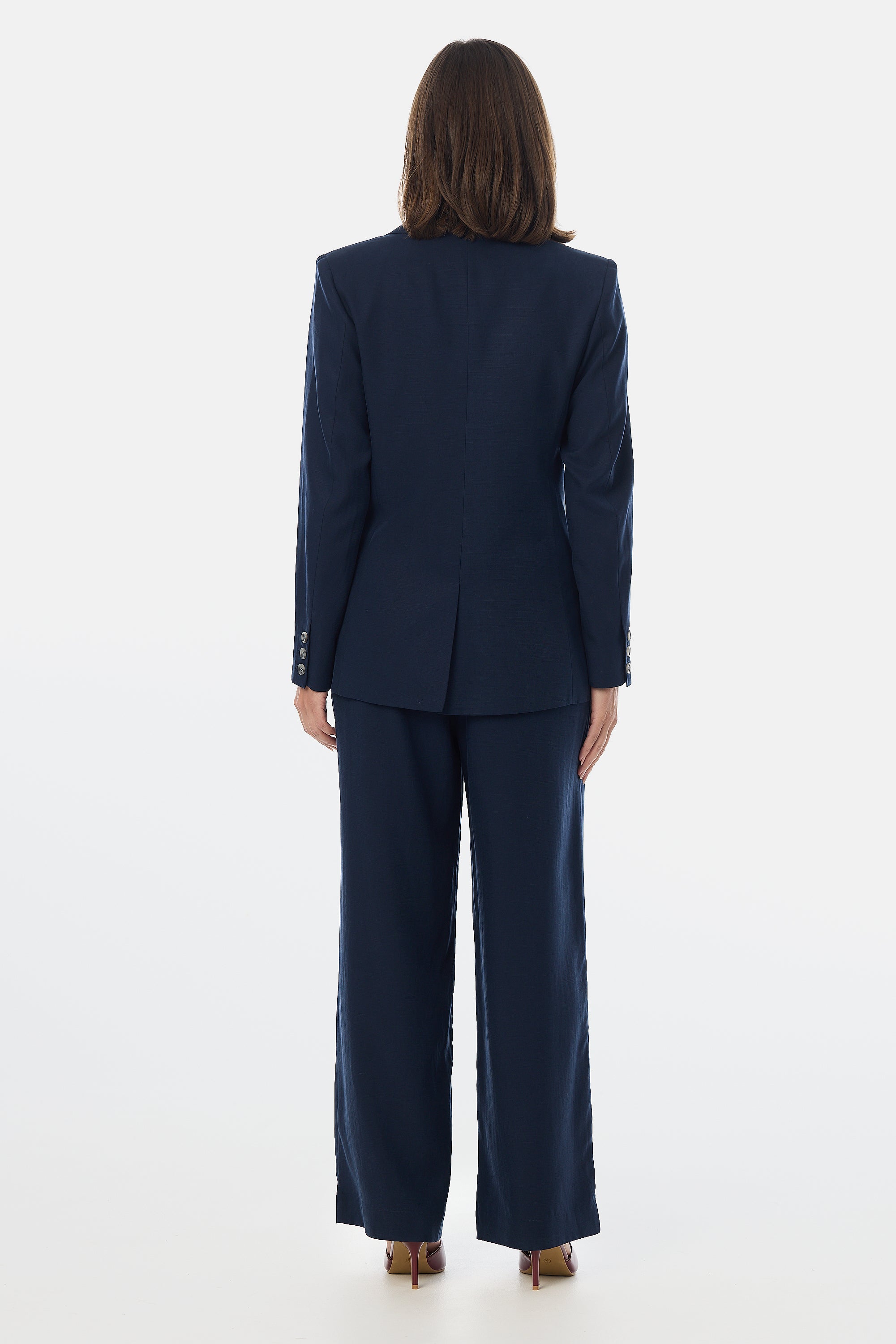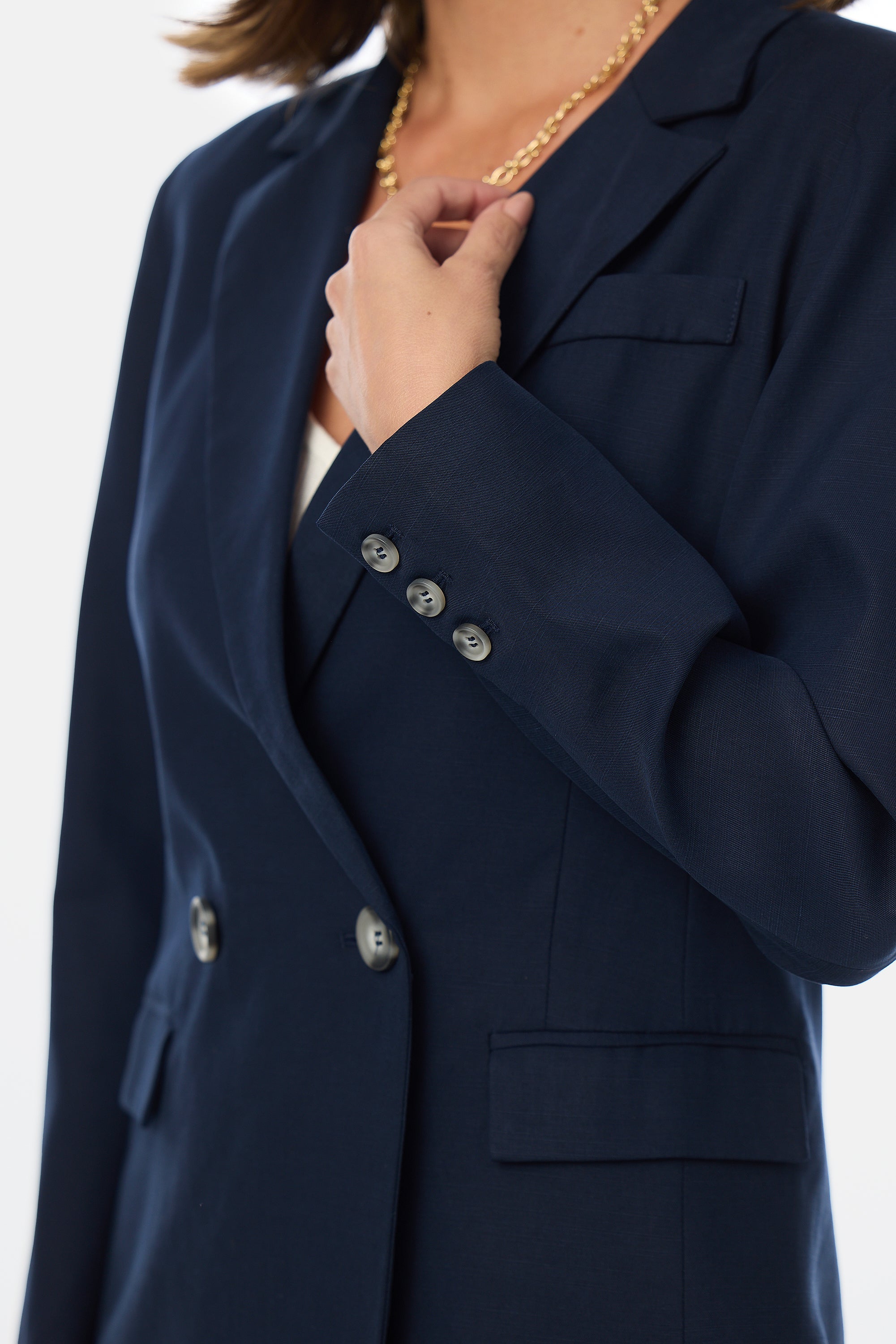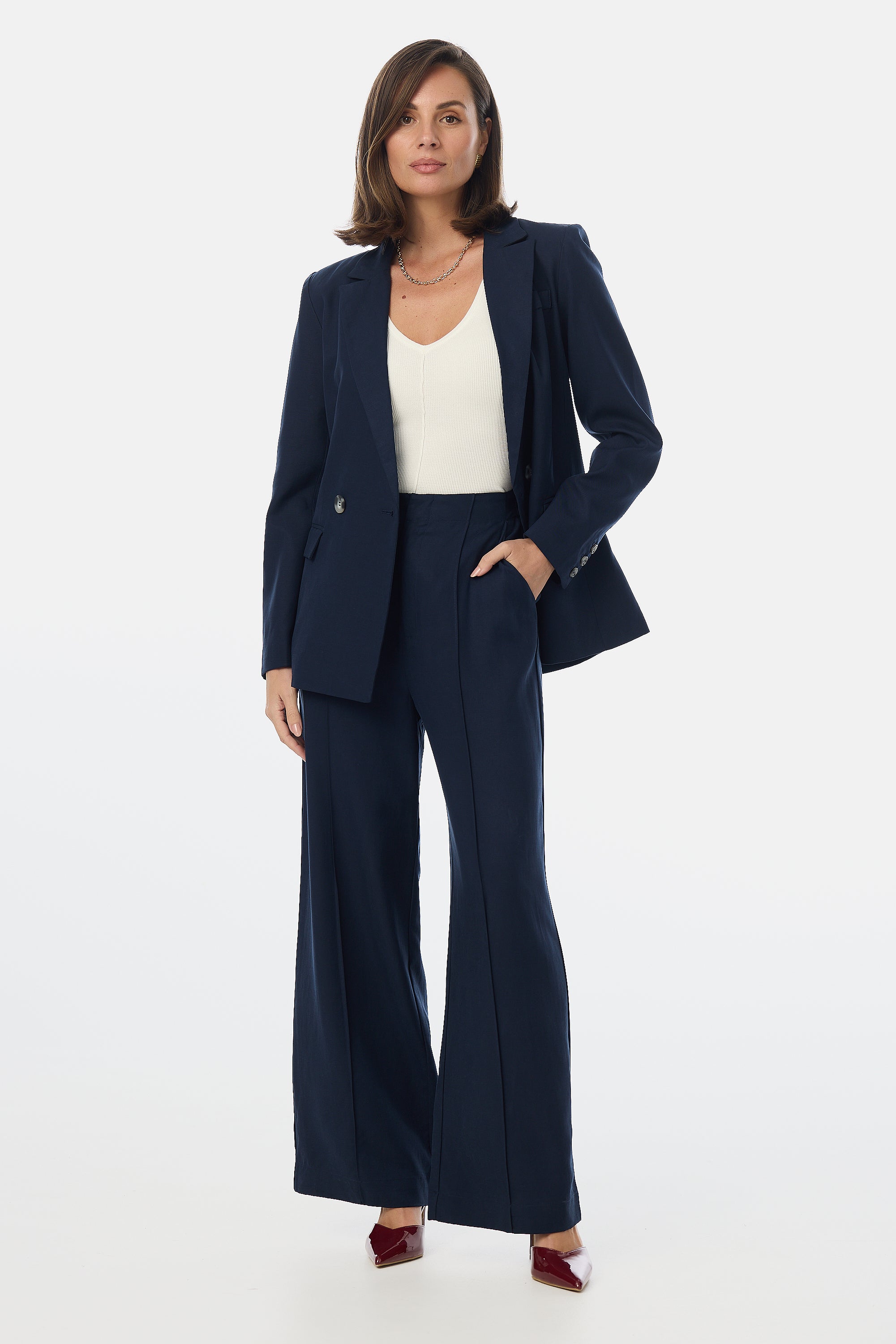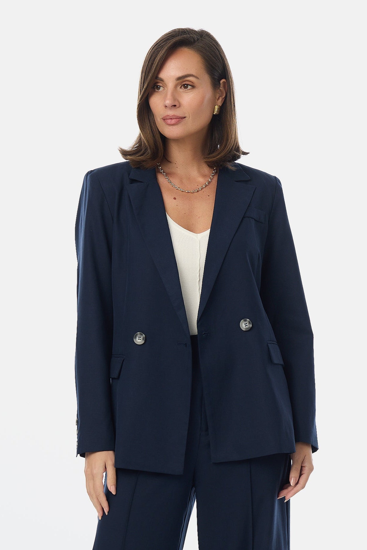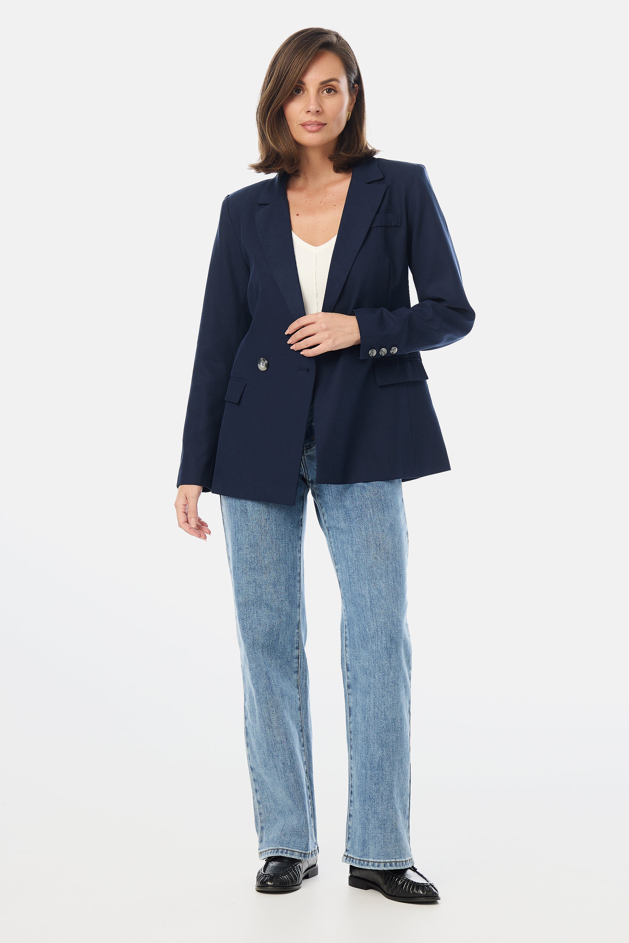 A fresh perspective on tailoring, the Tailored Double Breasted Blazer in Navy is your go-to for sleek layering. With its tailored shape, soft drape, and smart details, it works just as well styled with matching suiting as it does over denim.