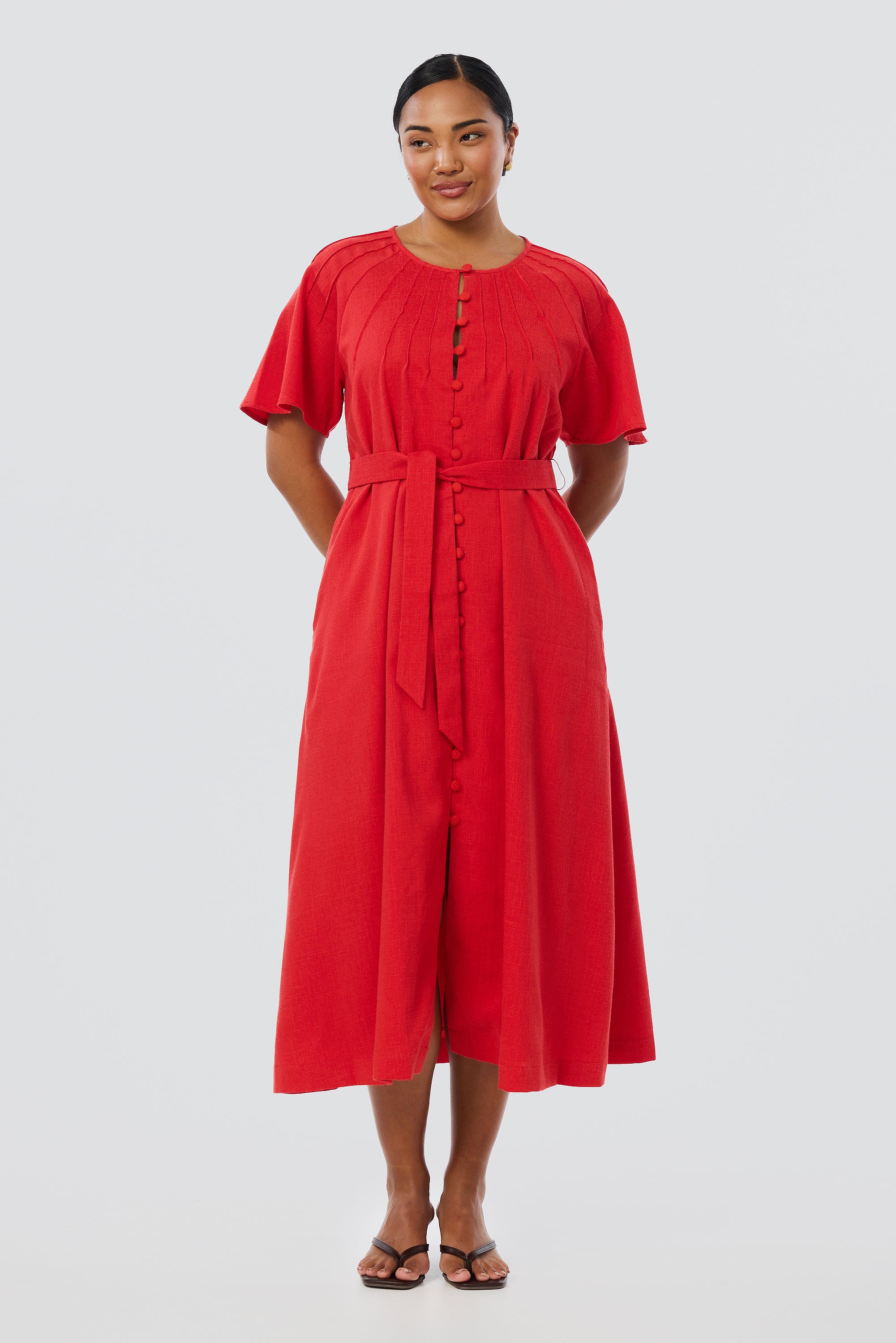 Pintuck Buttoned Midi Dress - Crimson (Pre Order)