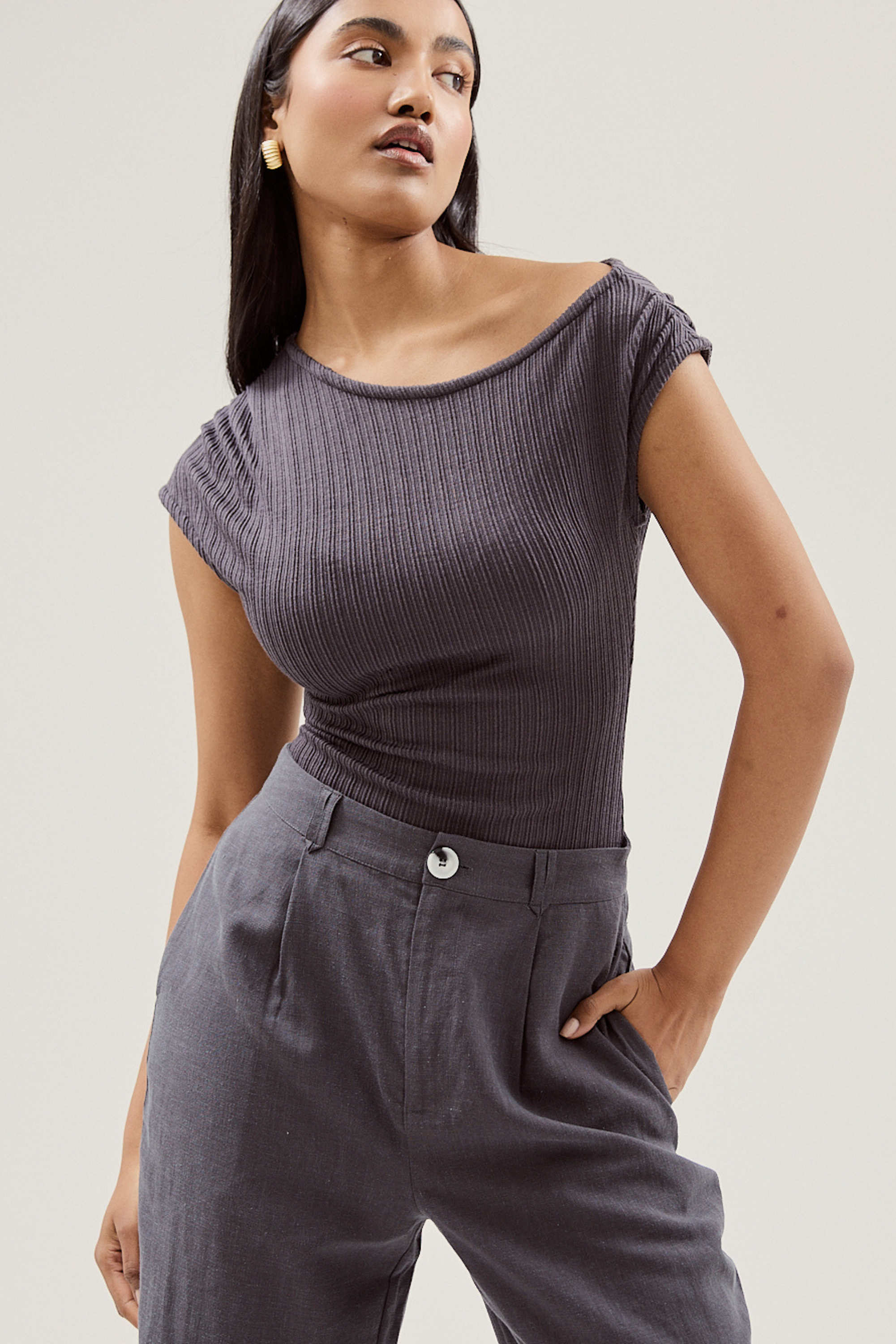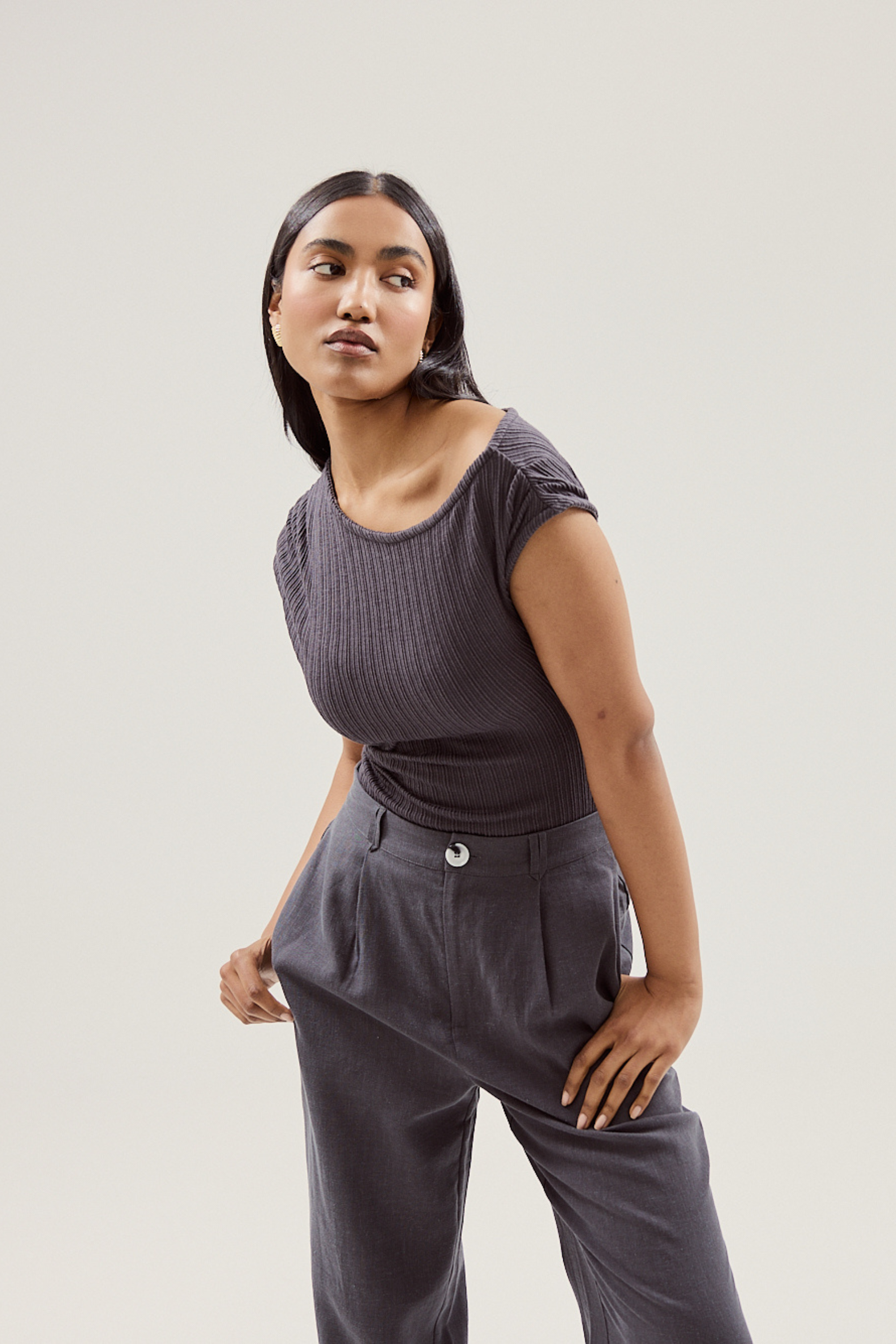 Minimalist with a twist, the Asymmetric Top in Charcoal brings a directional update to your wardrobe staples. Designed with an off-shoulder neckline and shoulder tuck detailing, it’s cut for a close, flattering fit in a soft ribbed jersey. A go-to for dressing up denim or balancing out a statement skirt.