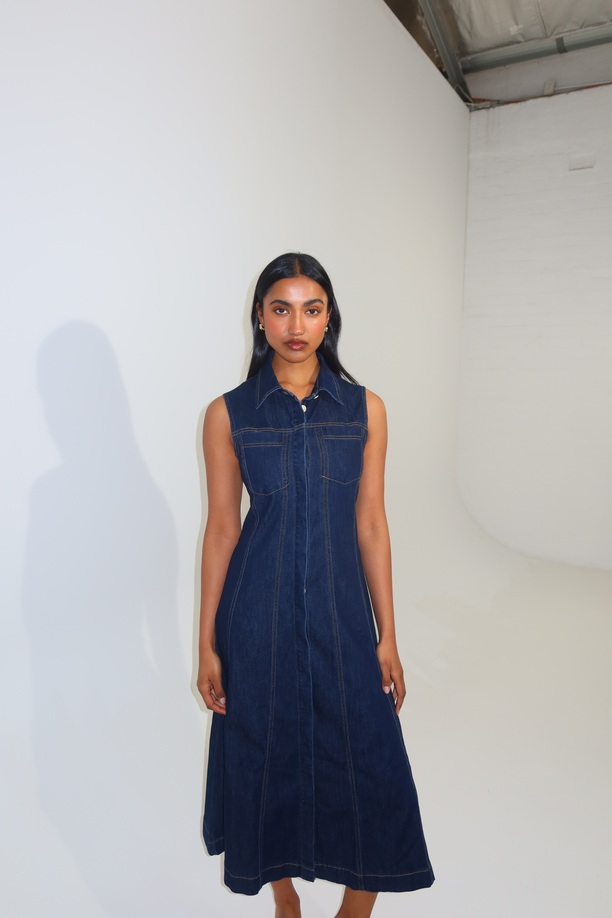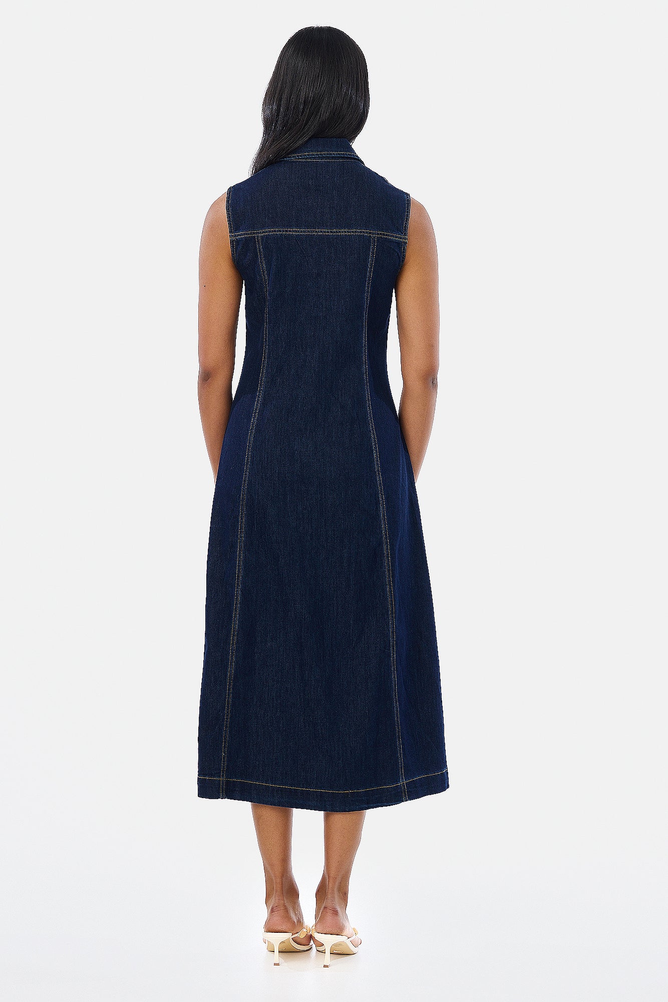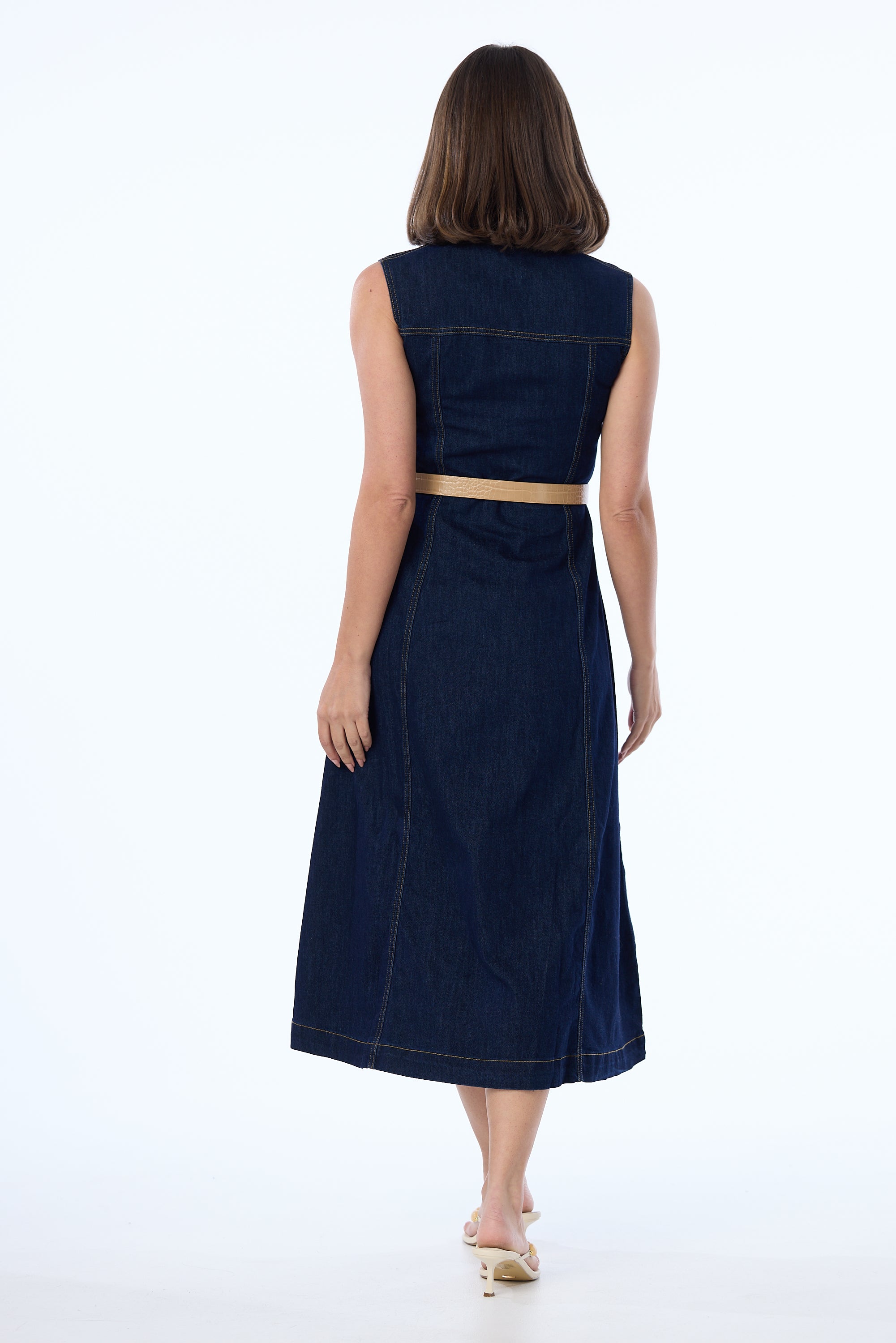 Polished yet practical, the Denim Sleeveless Midi Dress in Indigo redefines everyday dressing. Featuring a collared neckline and tailored A-line silhouette, it’s detailed with topstitching, a concealed hook-and-eye at the bust, and stretch denim for all-day comfort. Wear it with sneakers or sandals - it’s endlessly versatile.