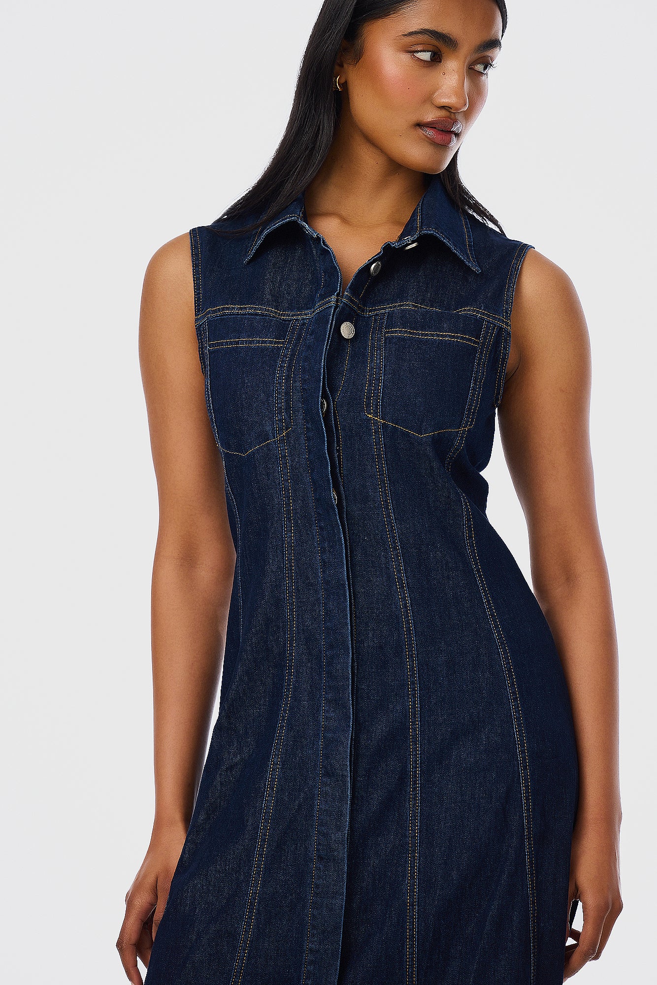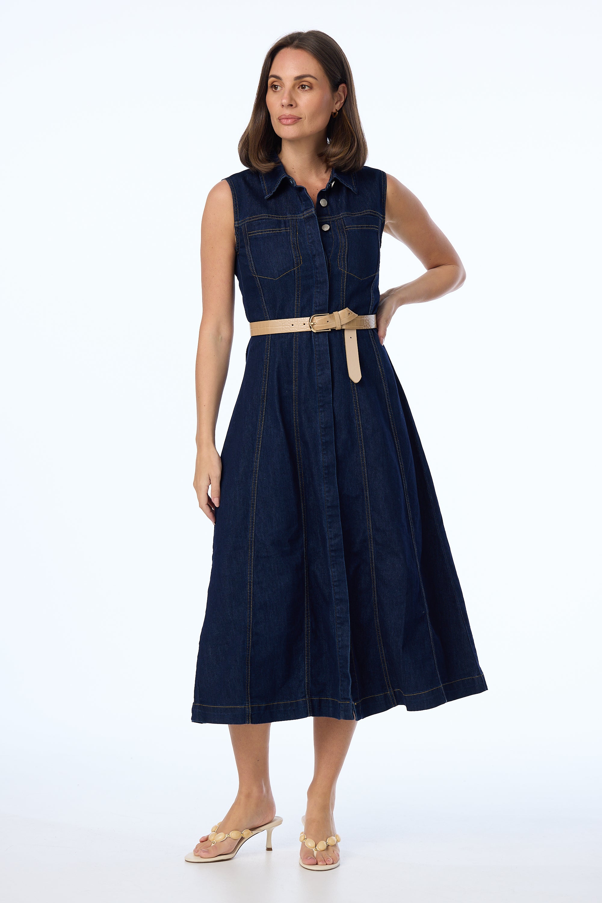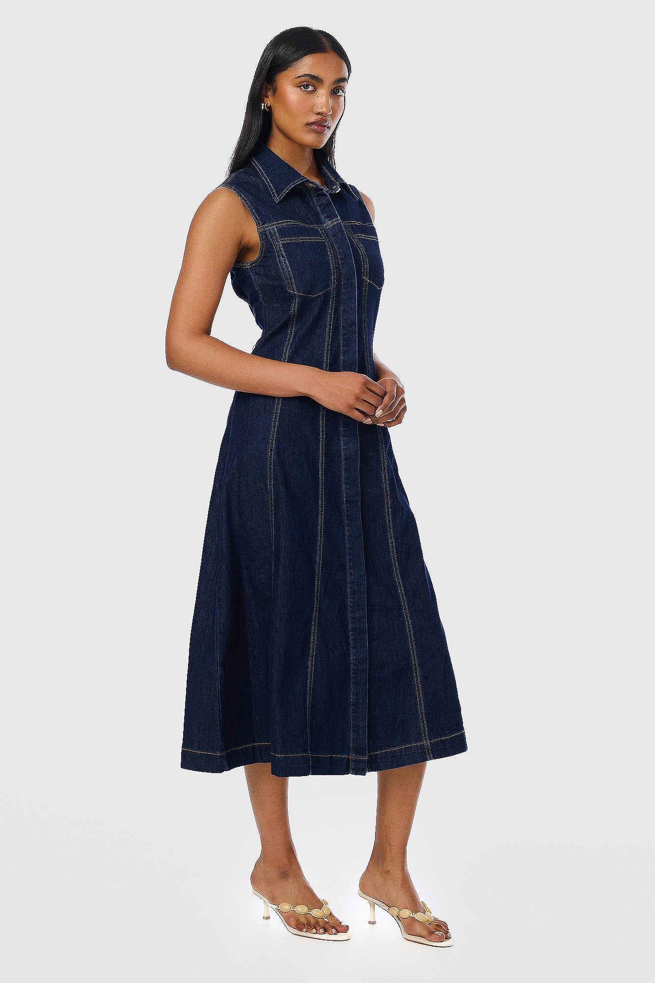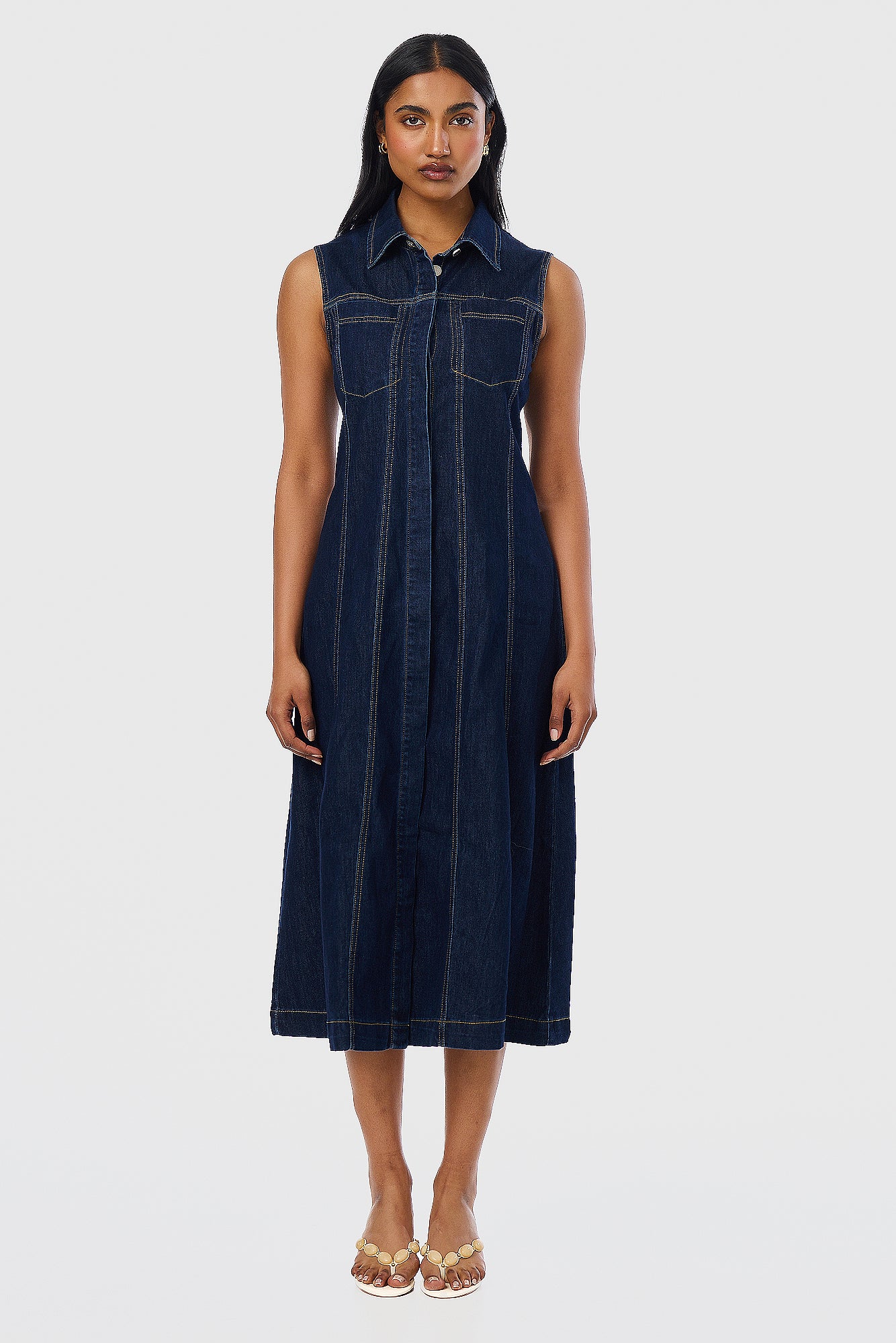 Polished yet practical, the Denim Sleeveless Midi Dress in Indigo redefines everyday dressing. Featuring a collared neckline and tailored A-line silhouette, it’s detailed with topstitching, a concealed hook-and-eye at the bust, and stretch denim for all-day comfort. Wear it with sneakers or sandals - it’s endlessly versatile.