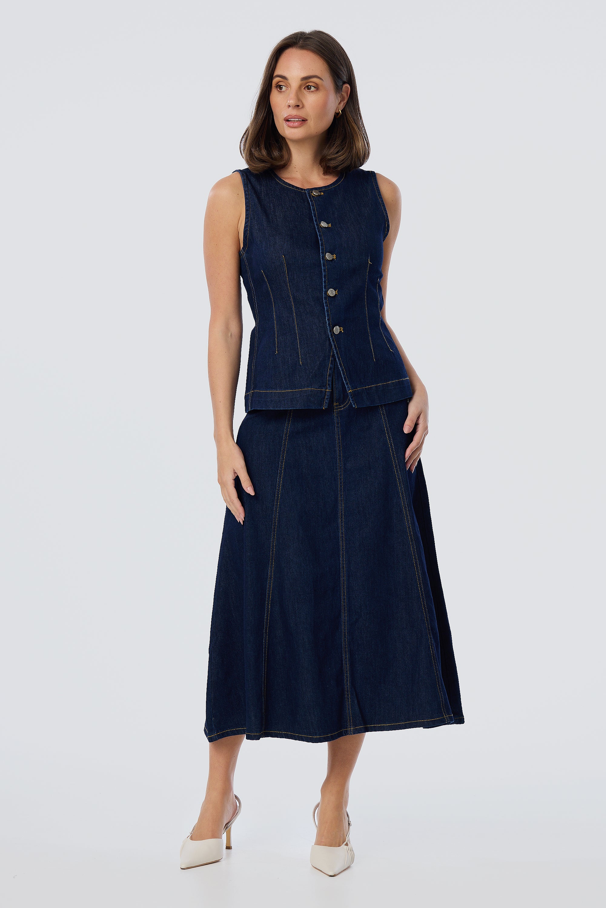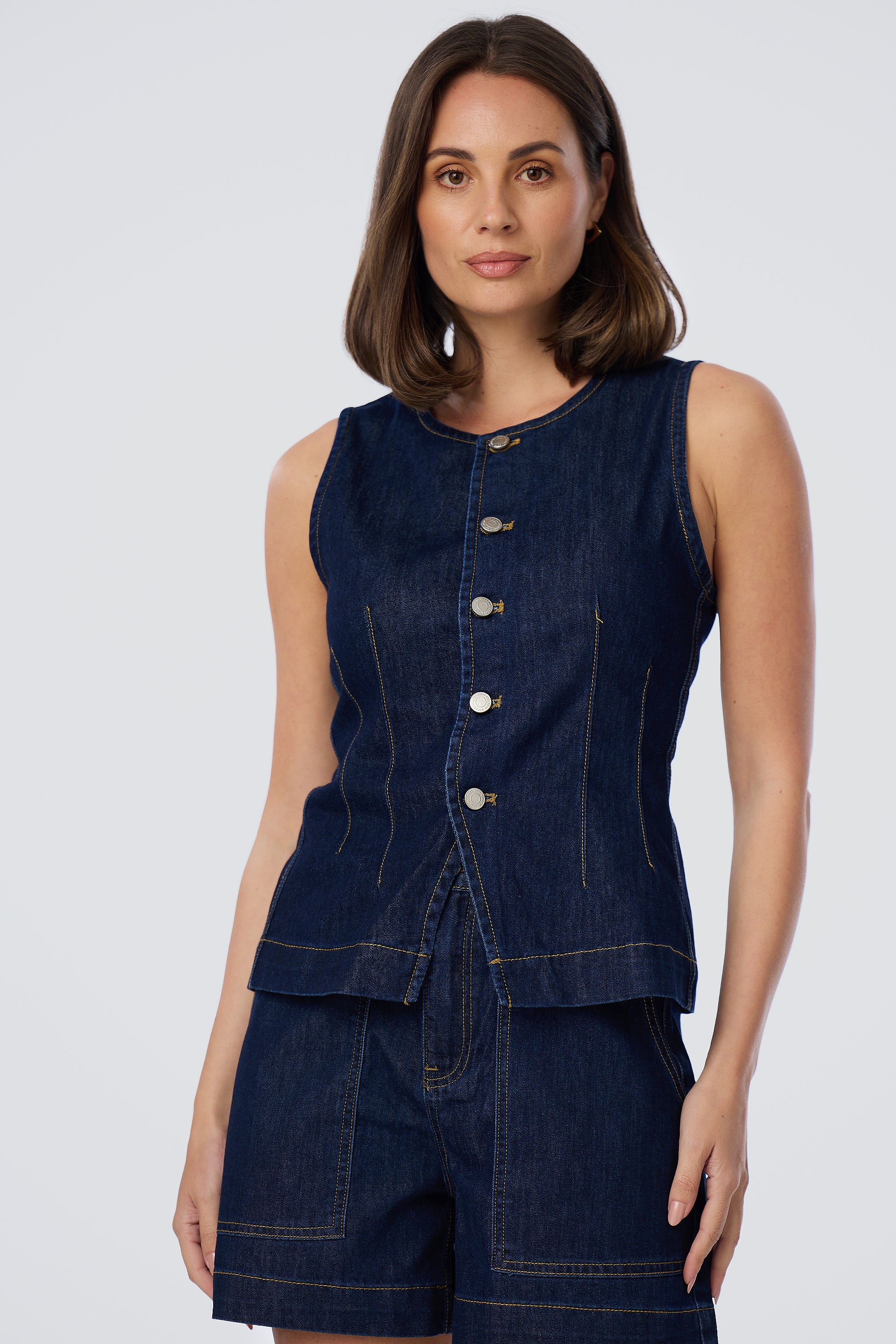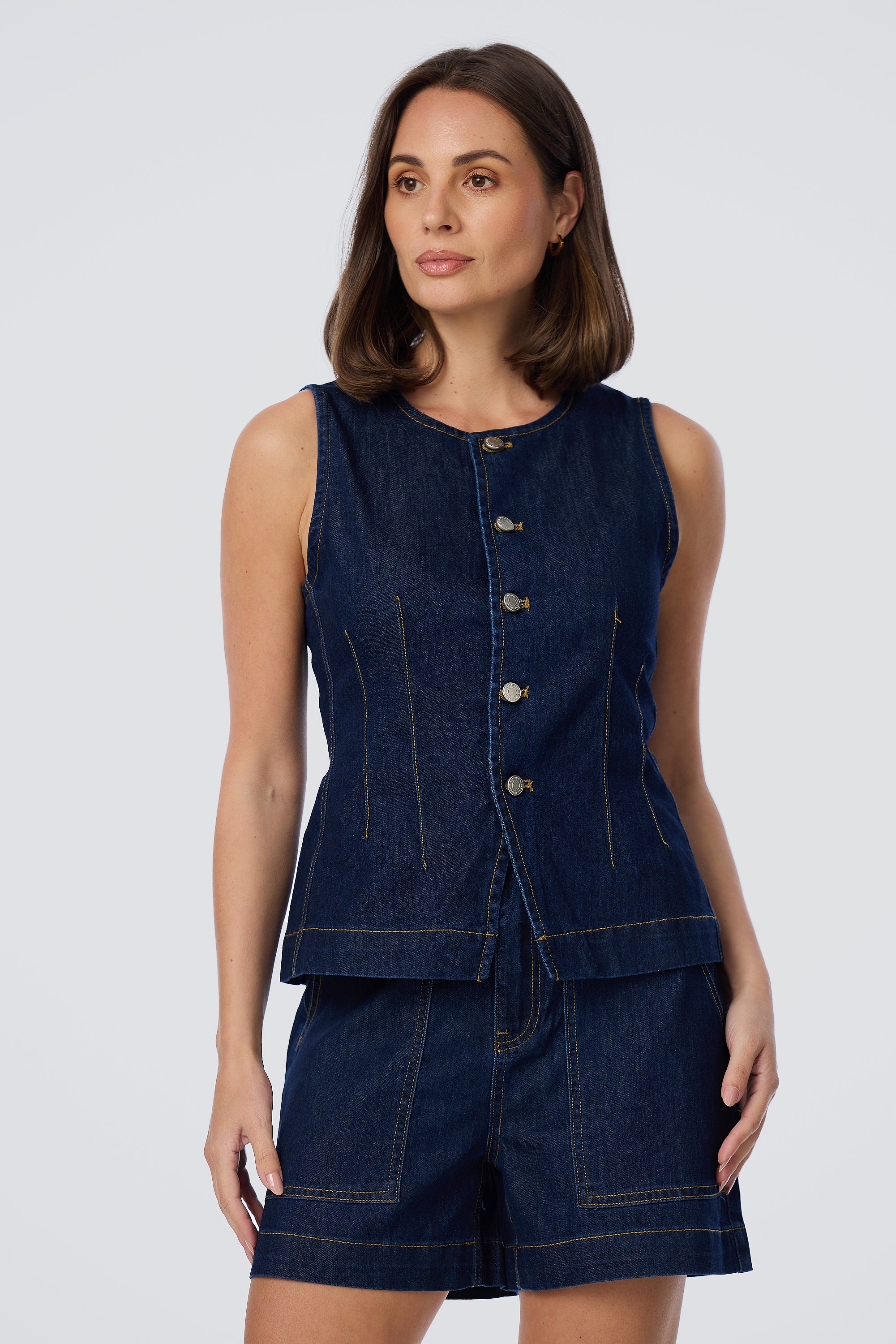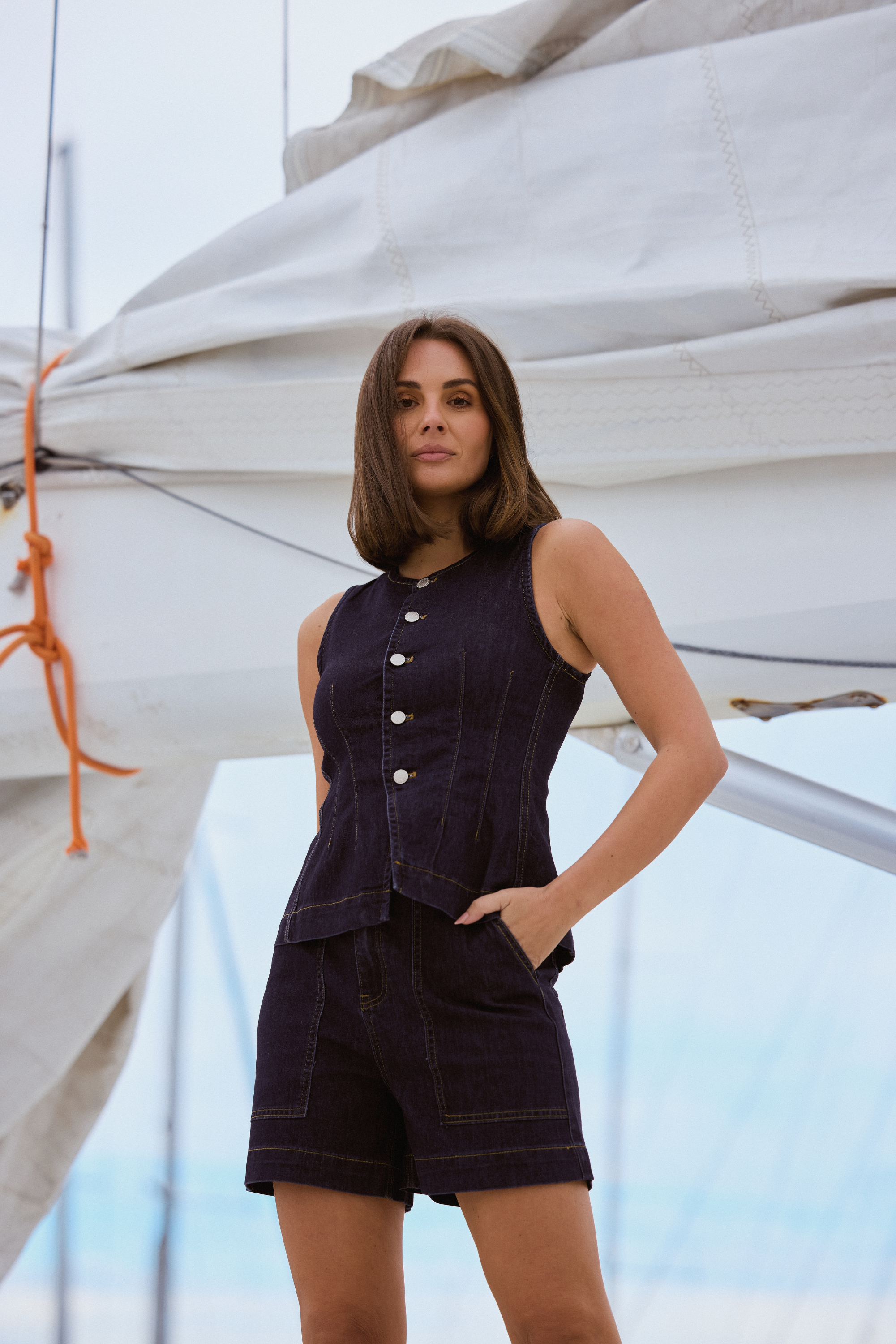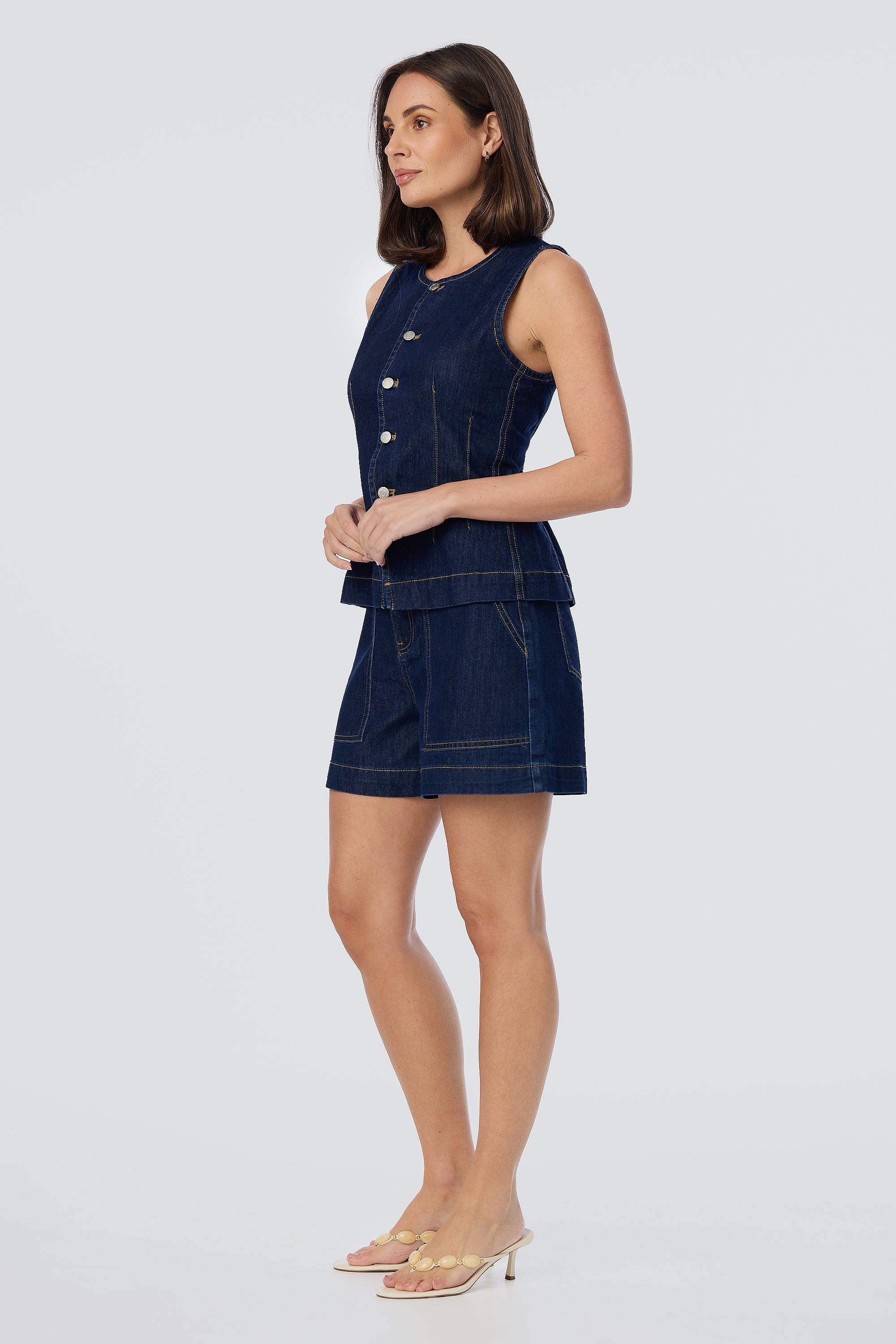 A refined layering essential, the Denim Vest in Indigo delivers a structured fit with subtle tailoring details. Designed in stretch denim for comfort, it features an adjustable back waist belt for a personalised silhouette. Pair with the matching Denim Patch Pocket Shorts for an effortless look.