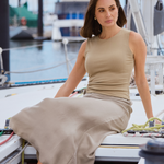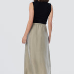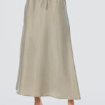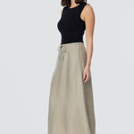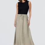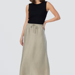 Relaxed and comfortable, the Elastic Waist Midi Skirt in Dusty Olive is cut in a soft A-line shape with an elasticated waistband for ease. A drawstring tie adds adjustable detail for a personalised fit.