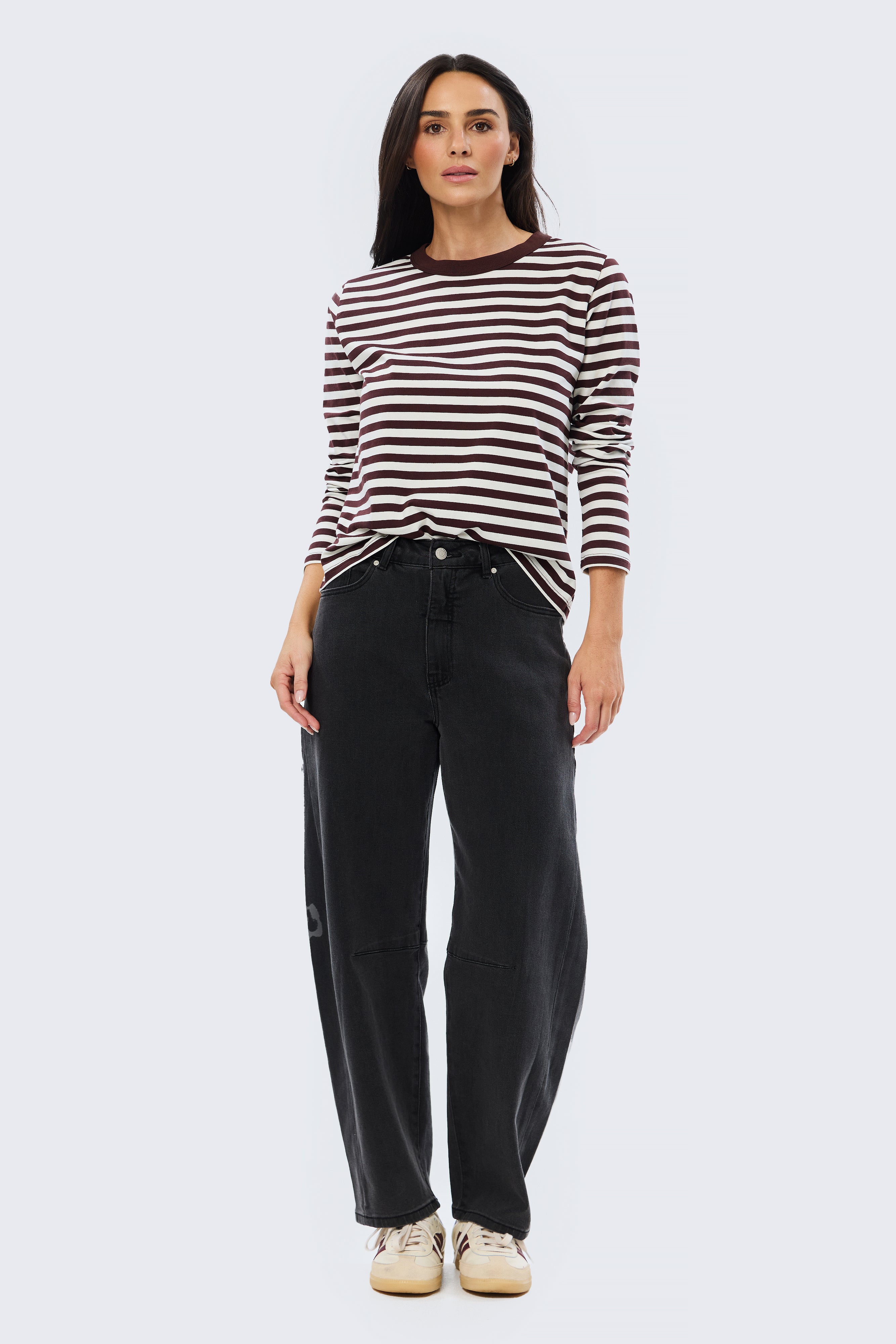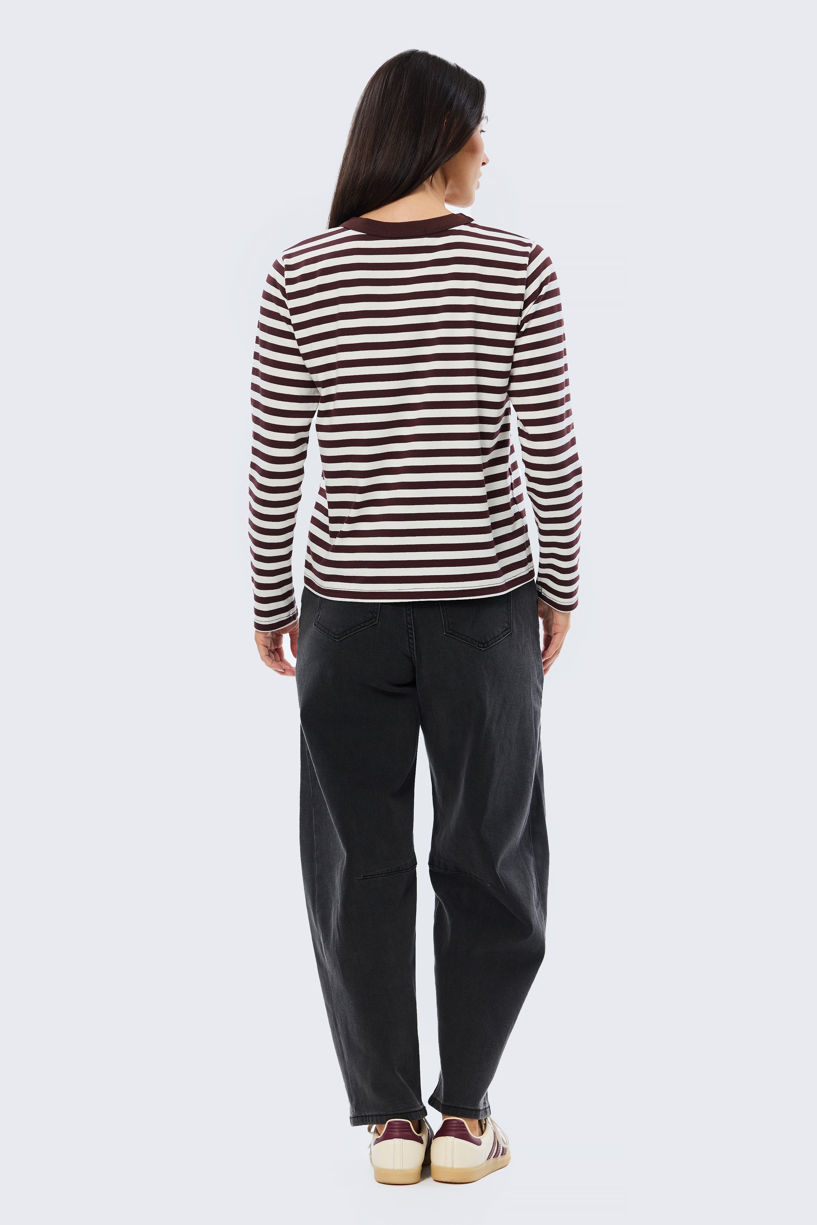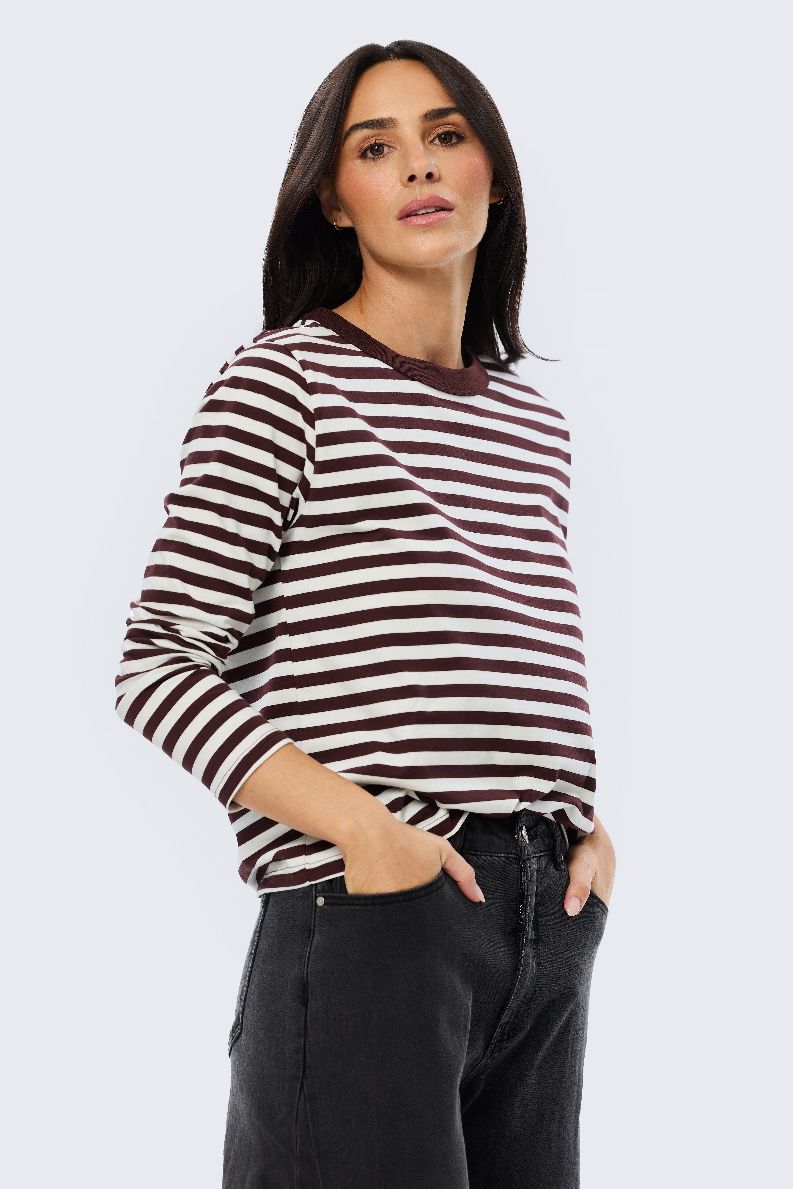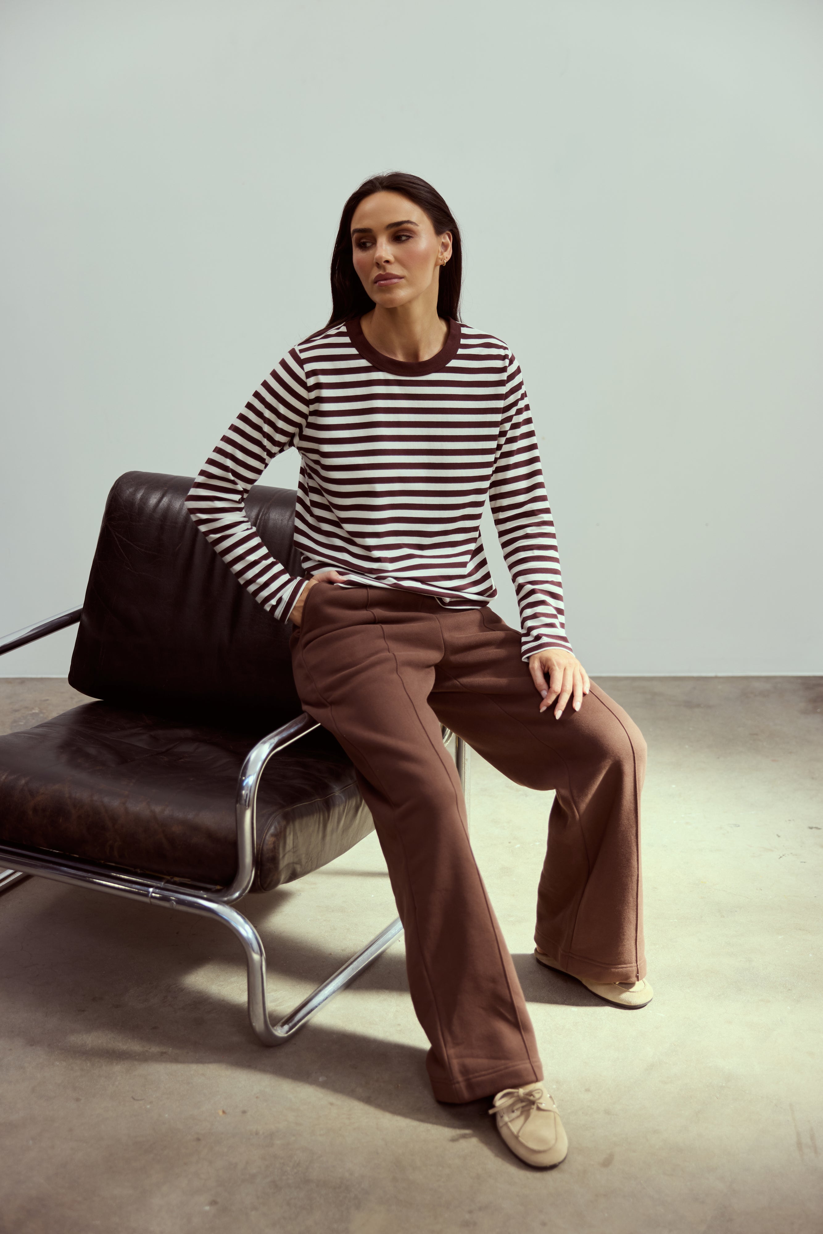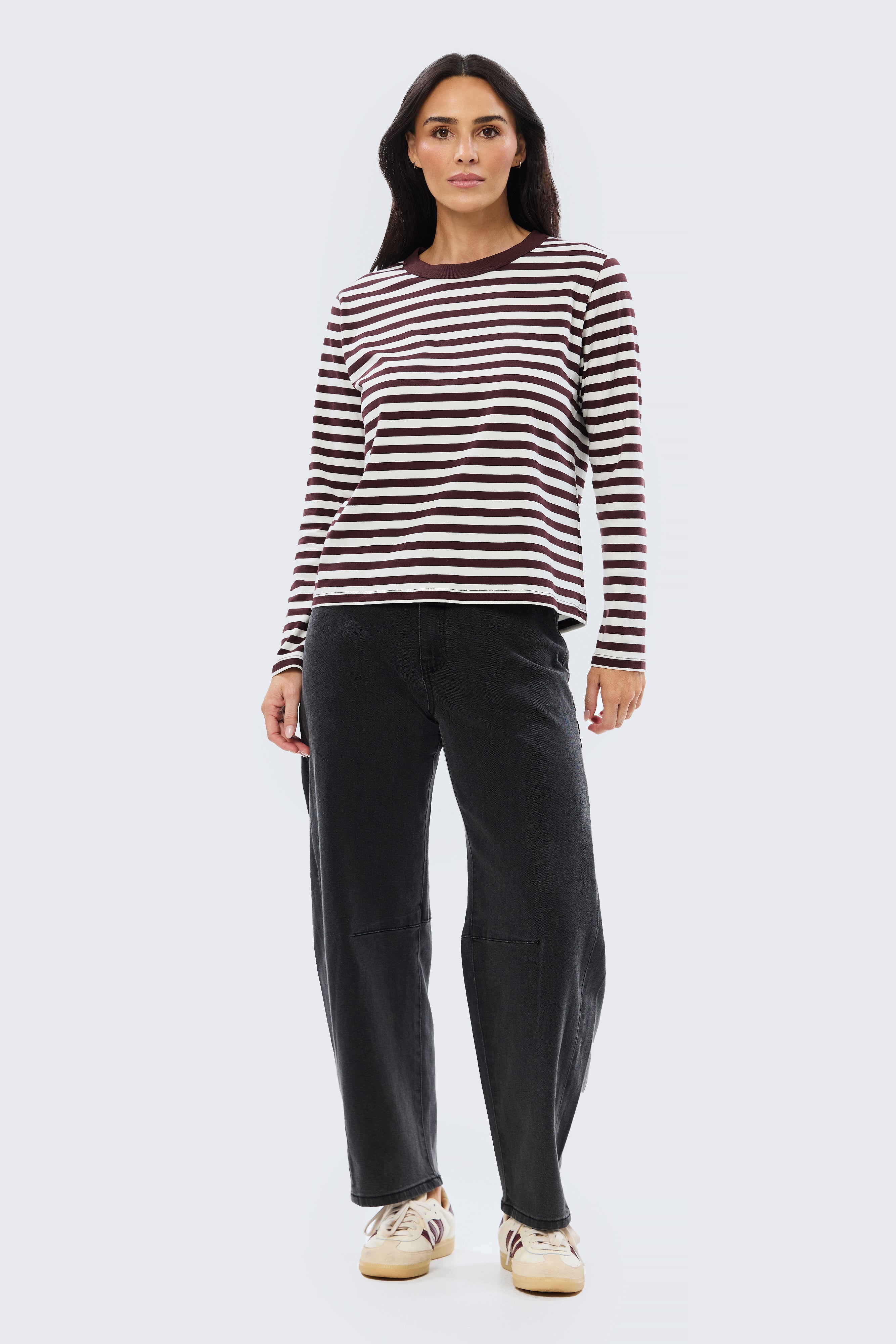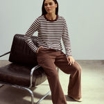 A relaxed everyday essential, the Long Sleeve T-Shirt in Cappuccino Stripe features a crew neckline with contrast rib and full-length sleeves. Crafted from mid-weight stretch jersey, it sits as a comfortable, relaxed fit, making it perfect for layering or wearing on its own.