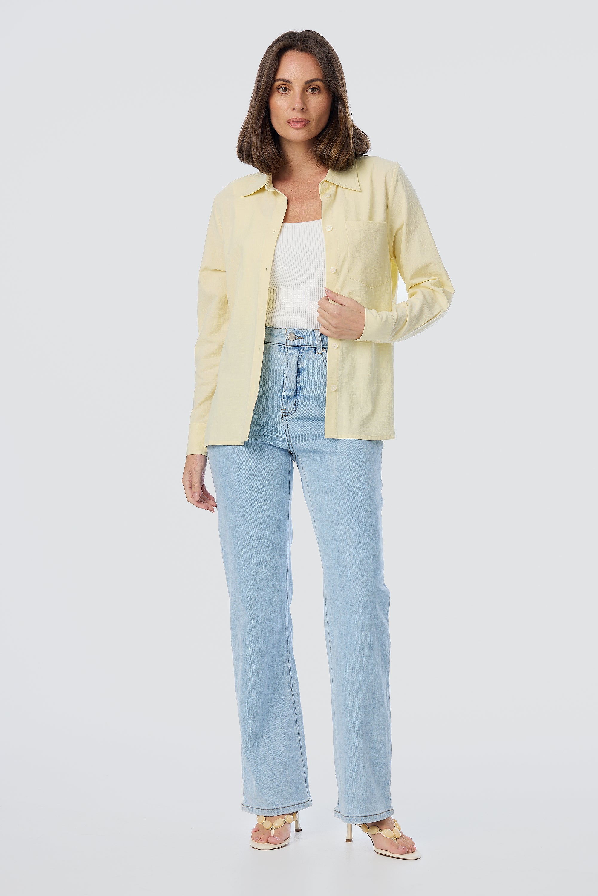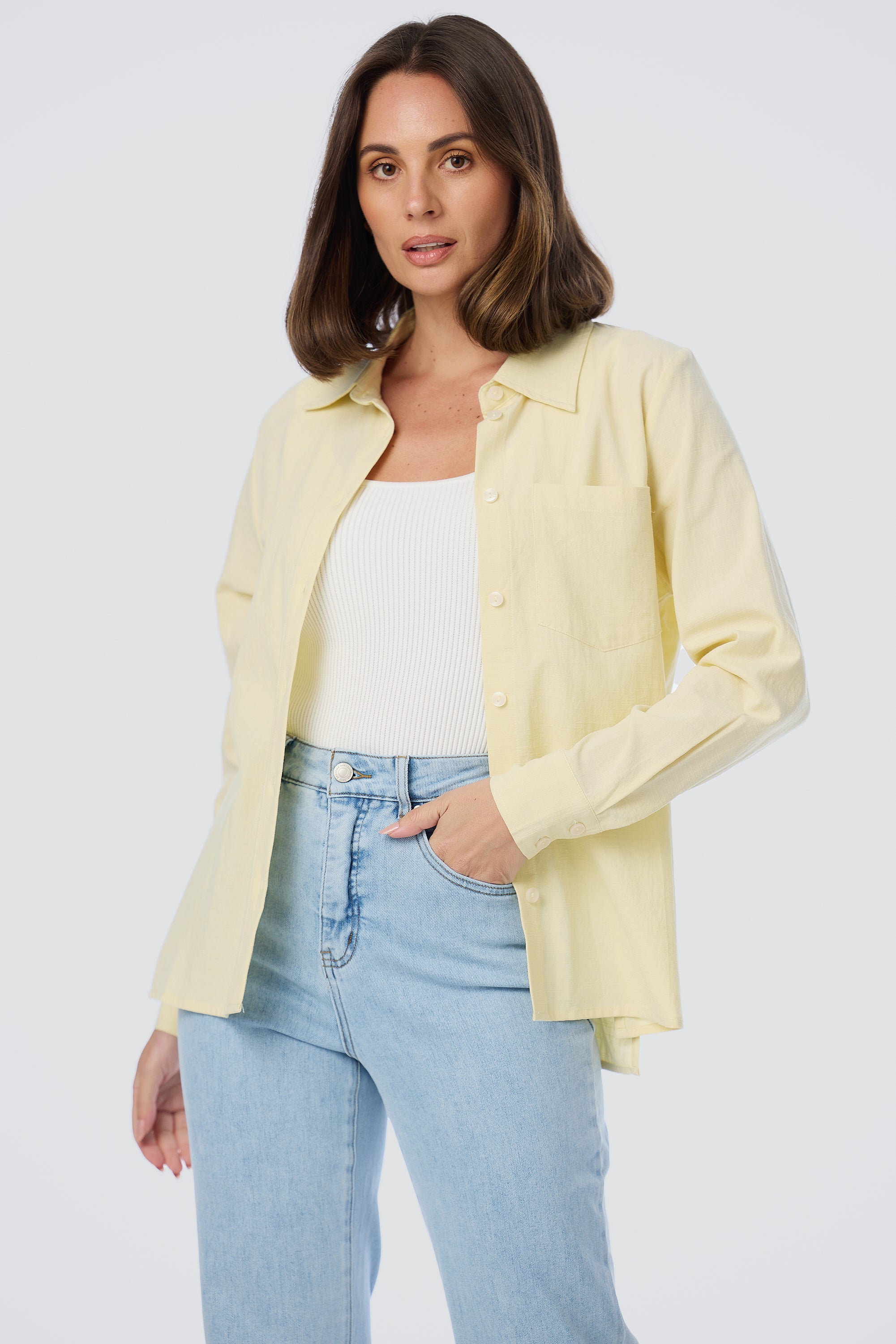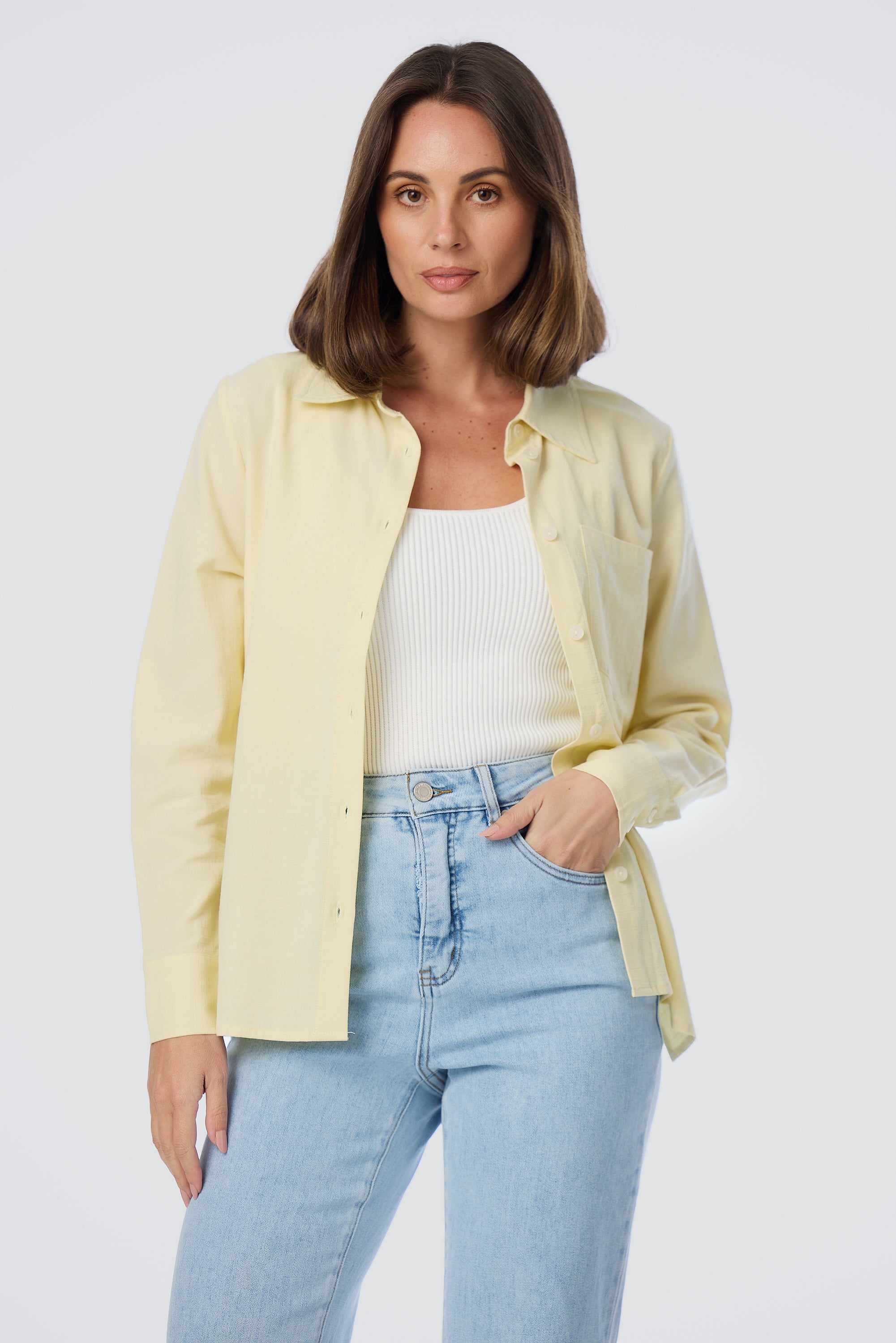 An easy essential in a fresh hue. The Relaxed Shirt in Lemon Meringue features a collared neckline, button-front placket, and full-length sleeves with cuffs and functional buttons. Designed with a back yoke for structure and a single patch pocket for a casual touch, it’s cut in a relaxed, longline silhouette from mid-weight textured fabric for comfort and drape.