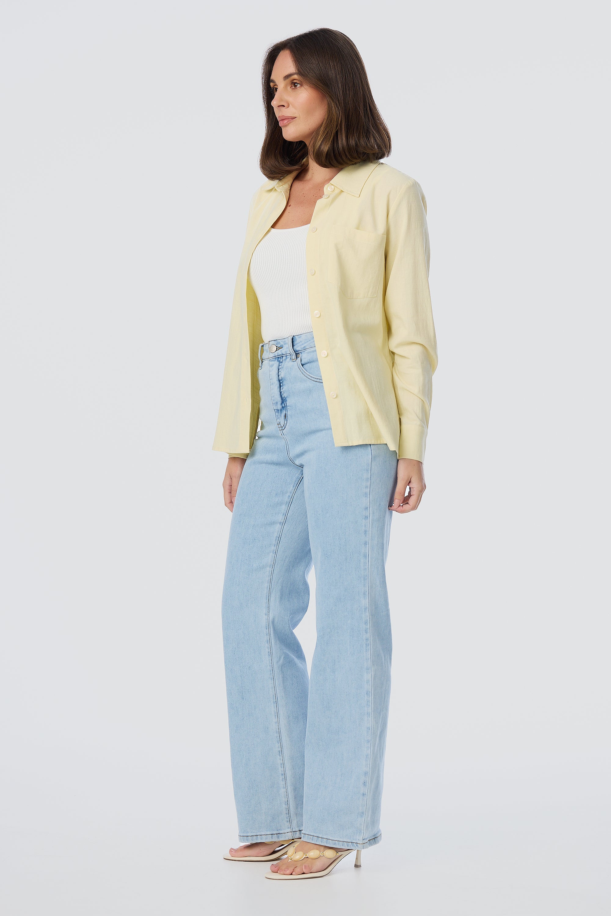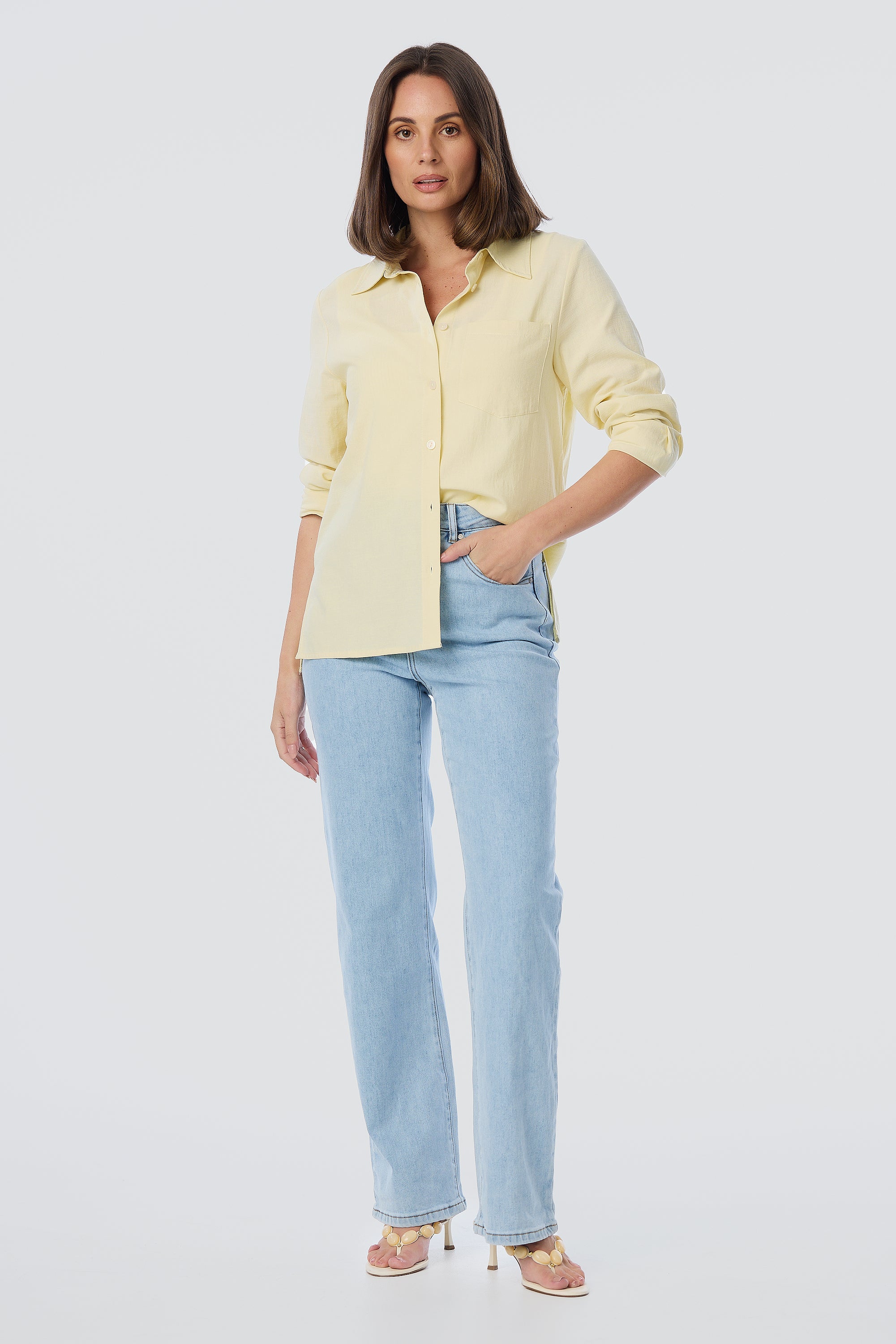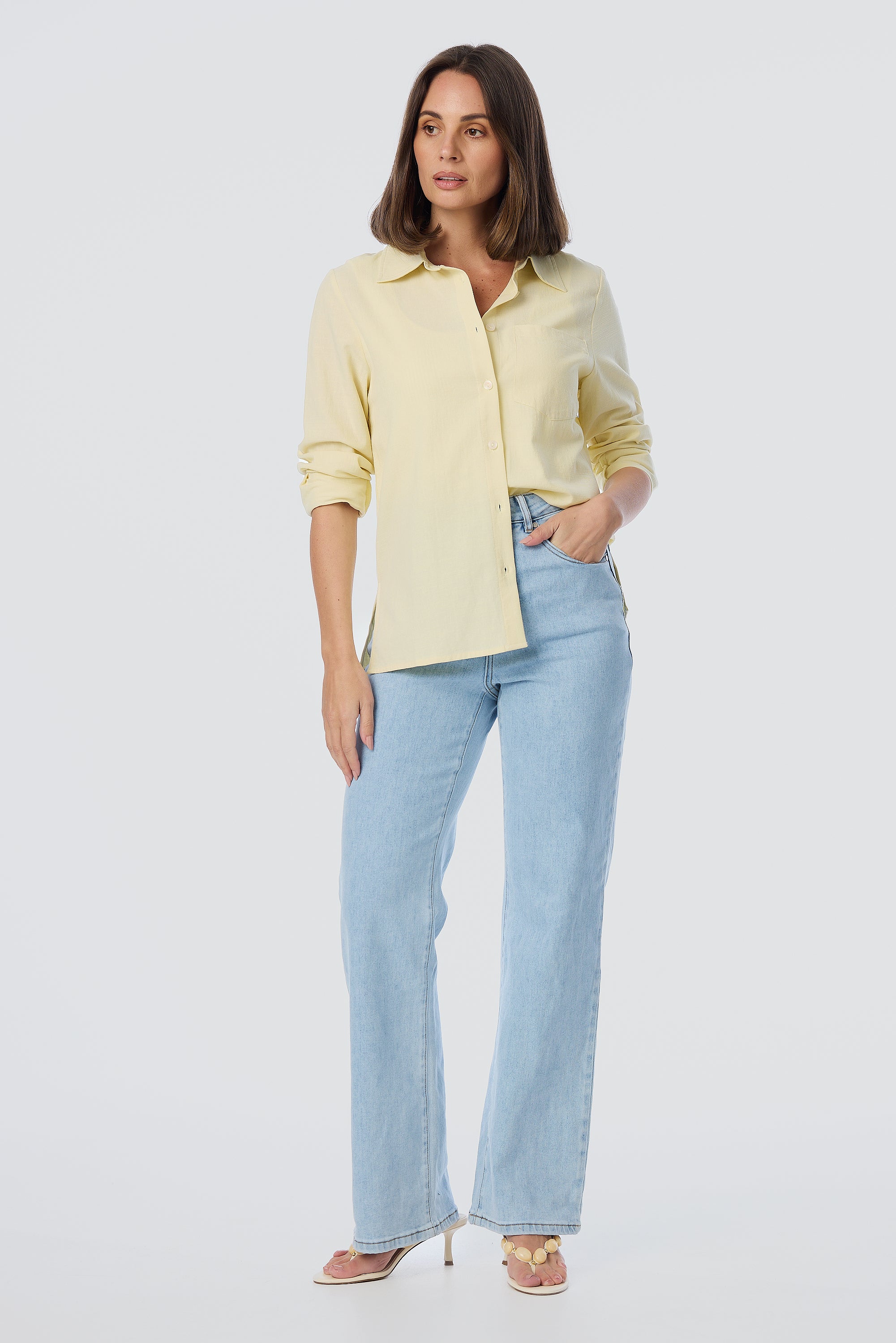 An easy essential in a fresh hue. The Relaxed Shirt in Lemon Meringue features a collared neckline, button-front placket, and full-length sleeves with cuffs and functional buttons. Designed with a back yoke for structure and a single patch pocket for a casual touch, it’s cut in a relaxed, longline silhouette from mid-weight textured fabric for comfort and drape.