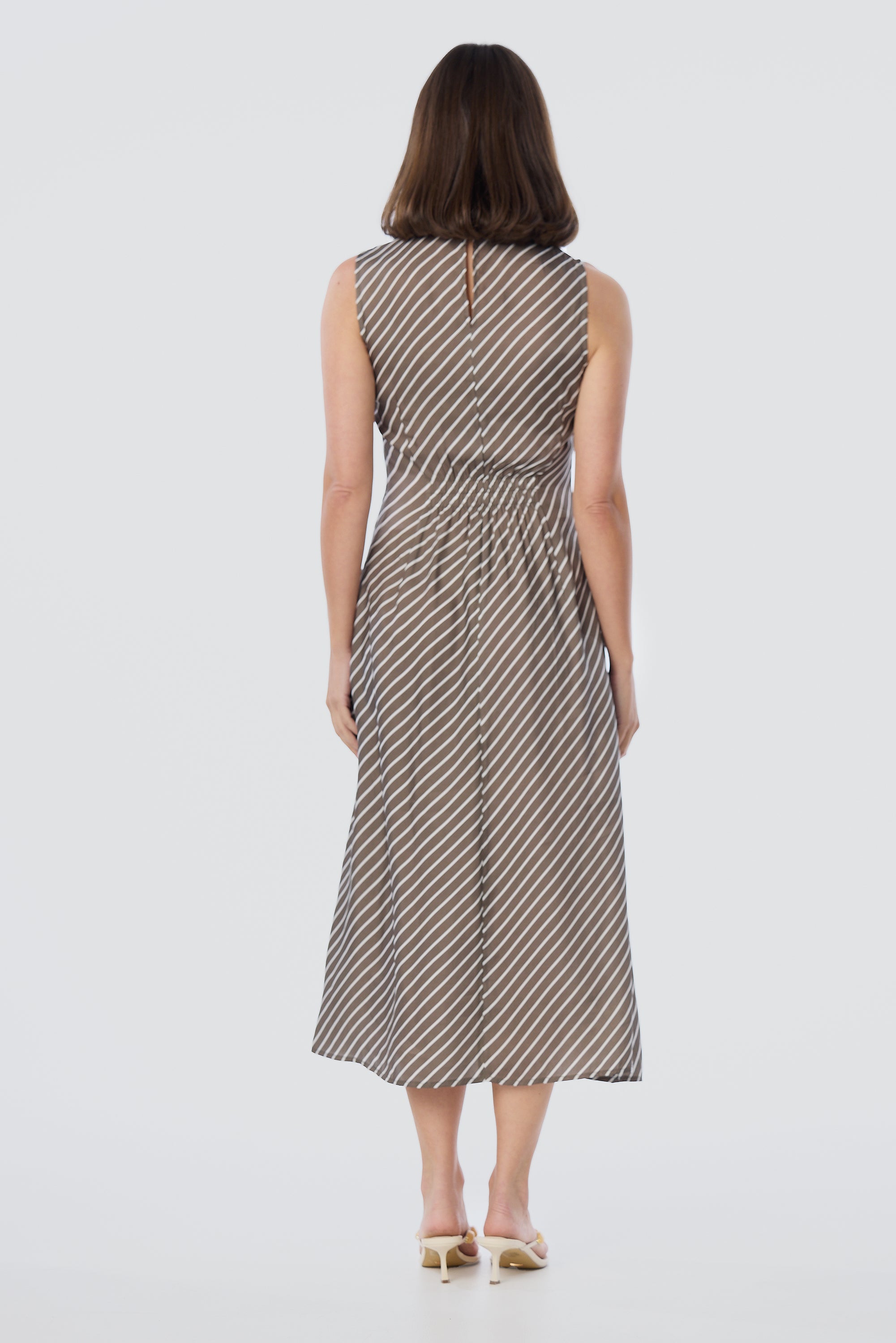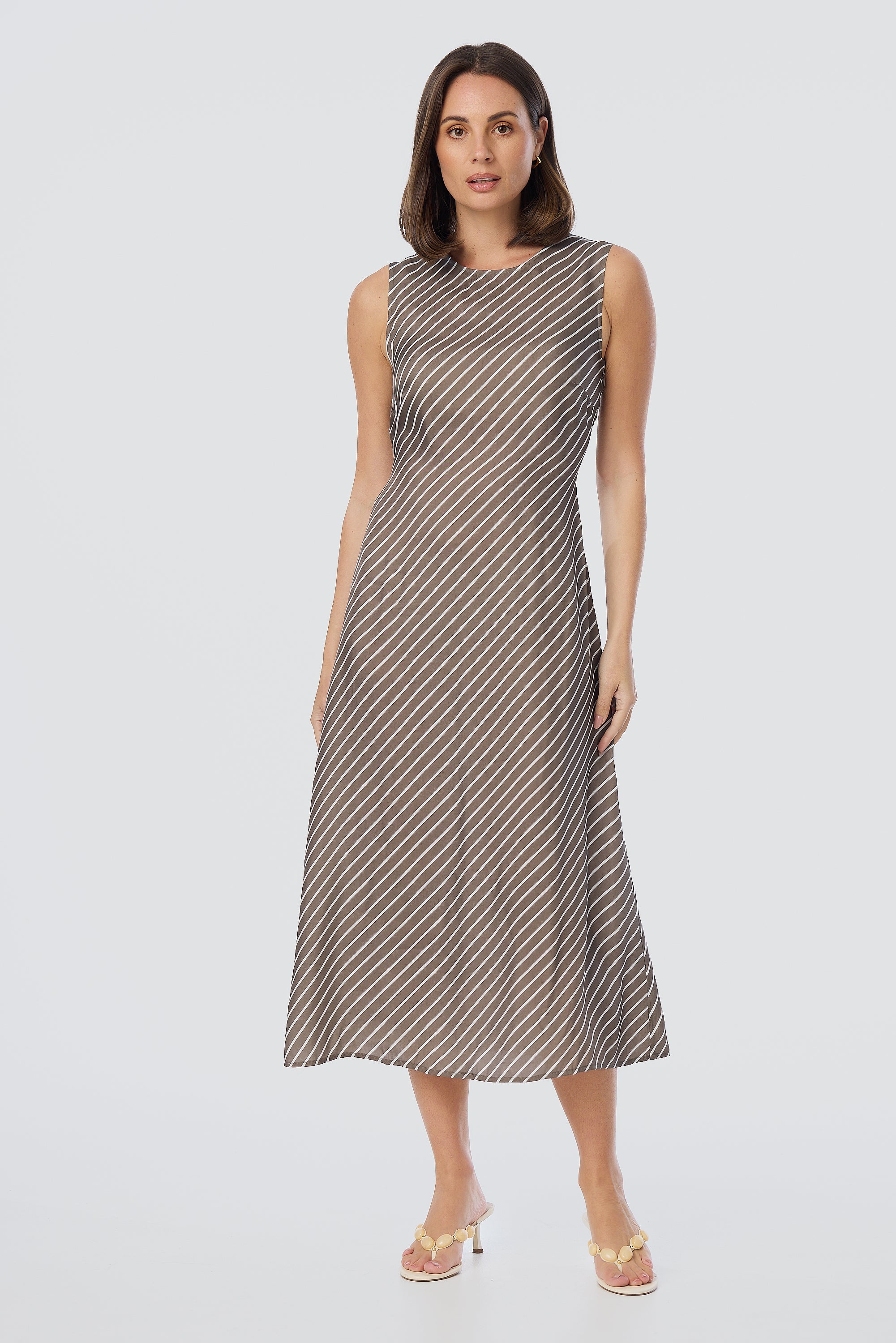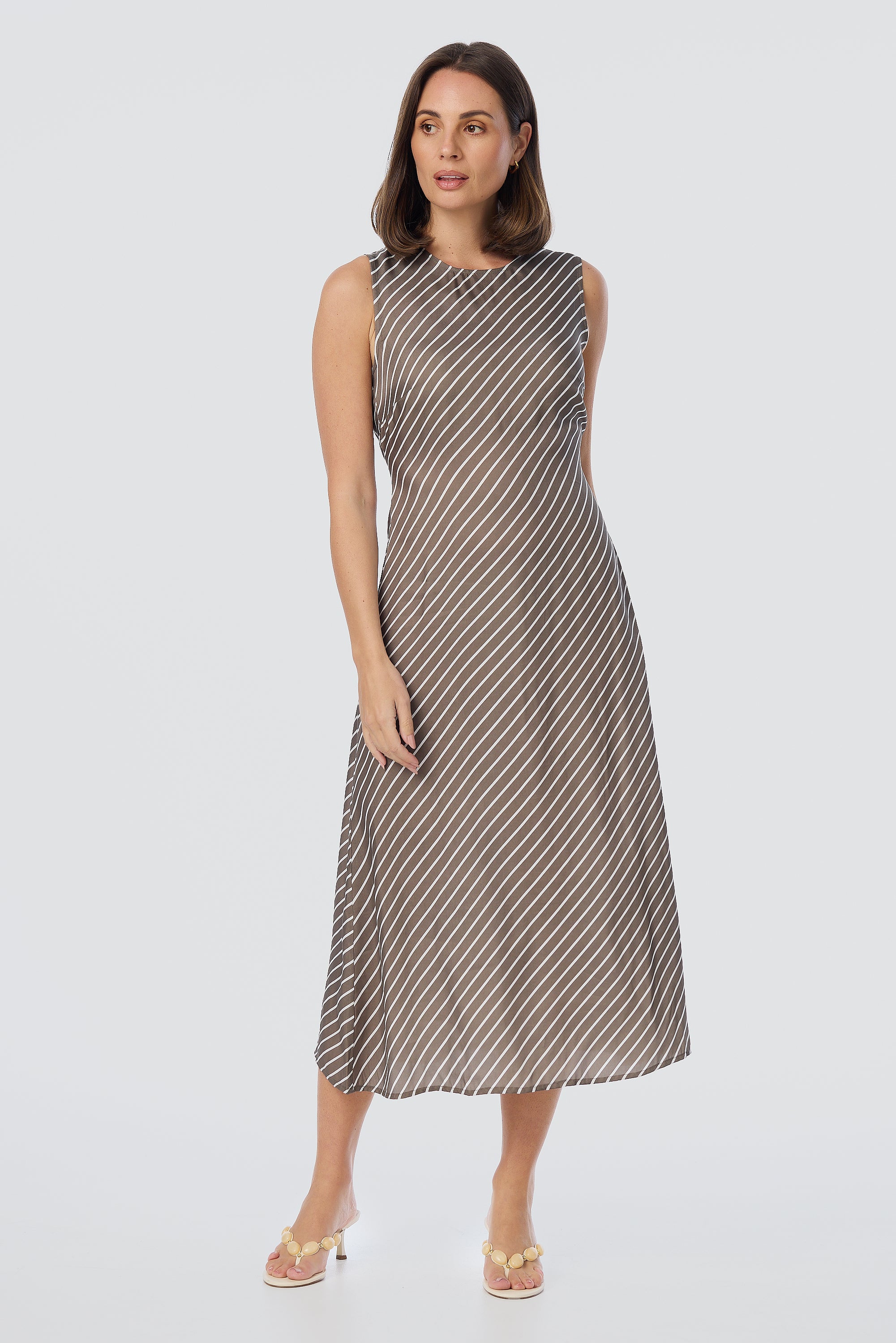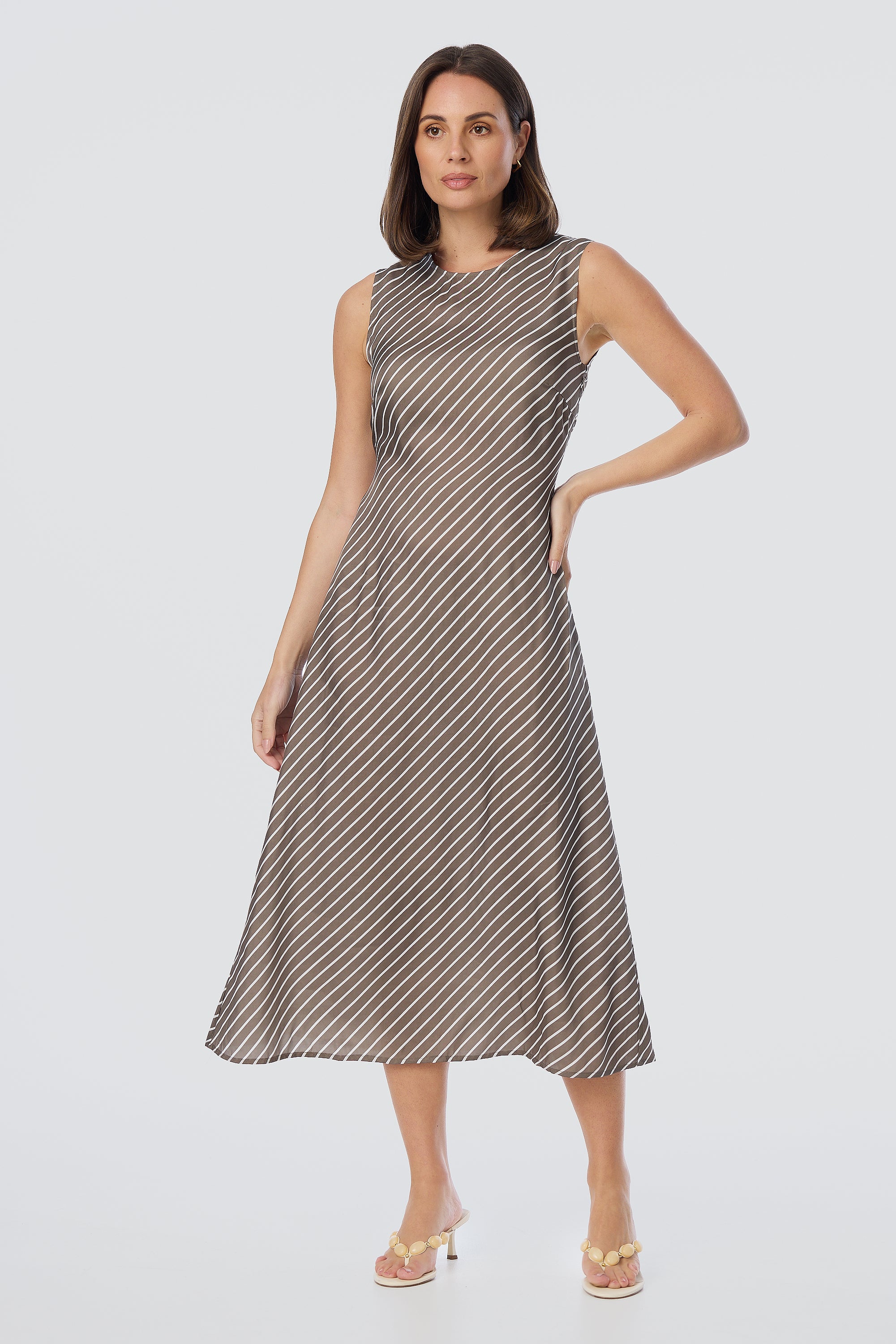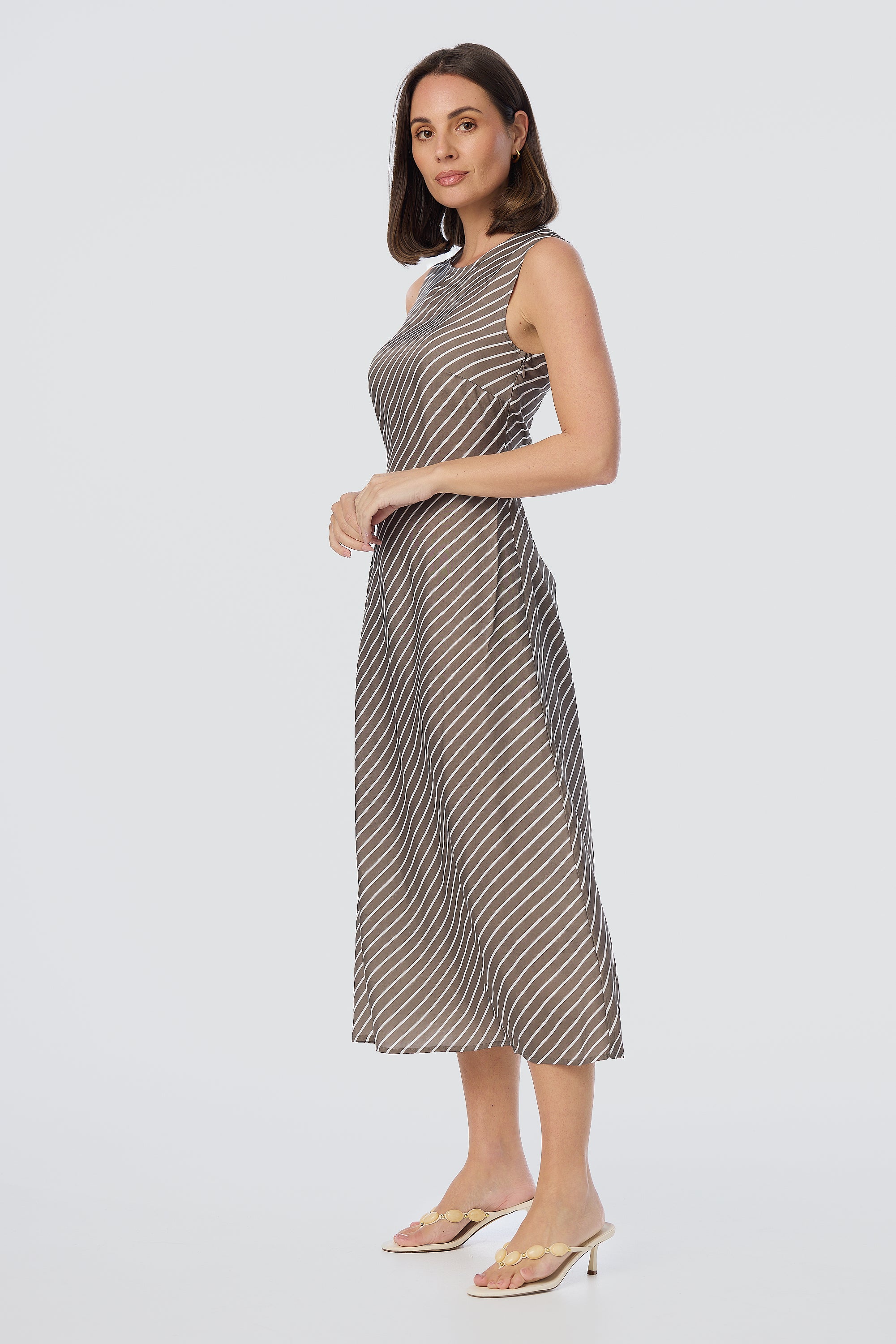 Breezy and versatile, the Sleeveless Slip Dress in Dark Olive Stripe is crafted from a lightweight, breathable fabric with a soft drape. A back keyhole and elasticated waist panel provide gentle structure to its relaxed silhouette.