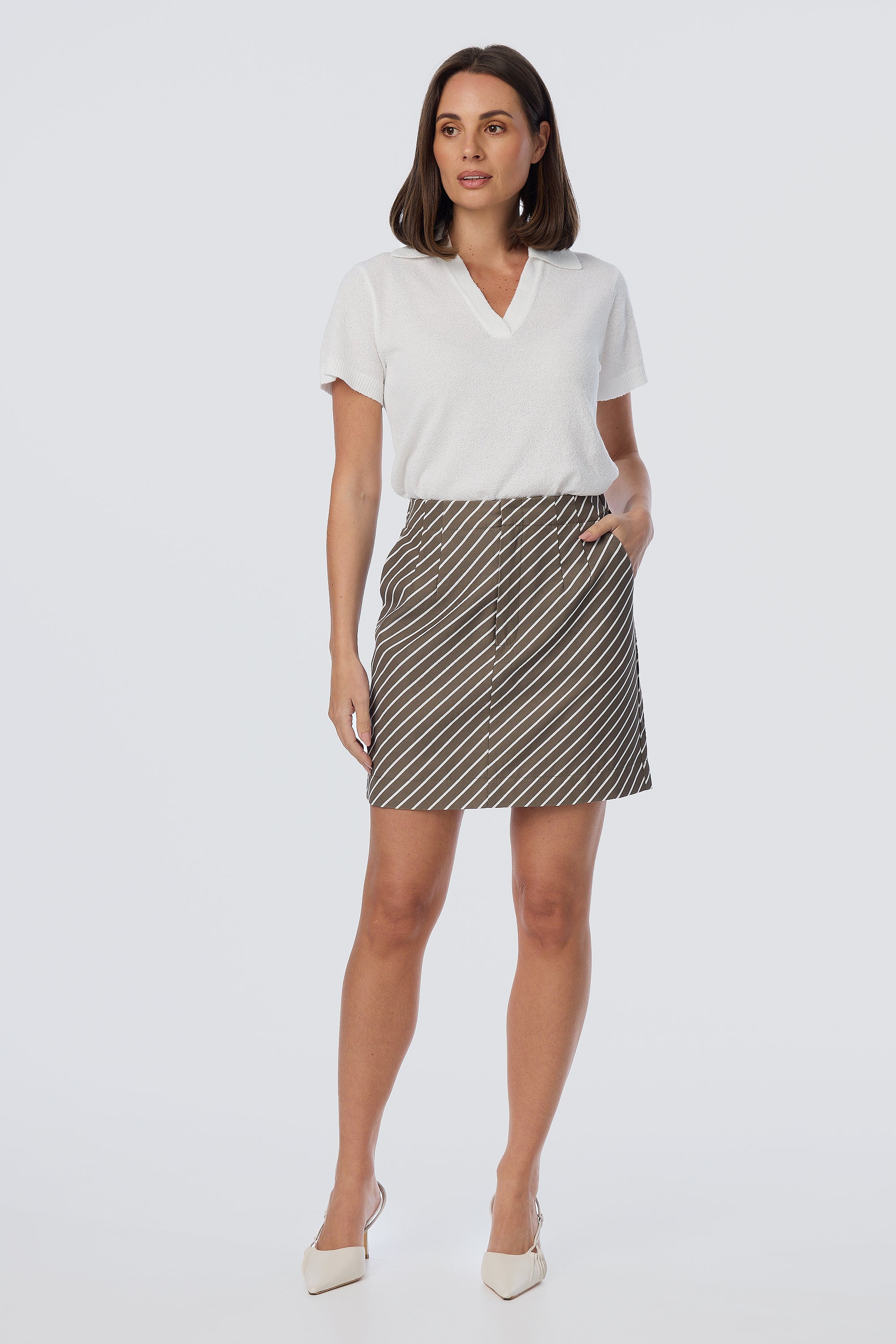 Modern and structured, the Tailored Mini Skirt in Dark Olive Stripe features a classic A-line cut with front pleat detailing and a comfortable elasticated back panel. Fully lined, it’s a versatile staple for any wardrobe.