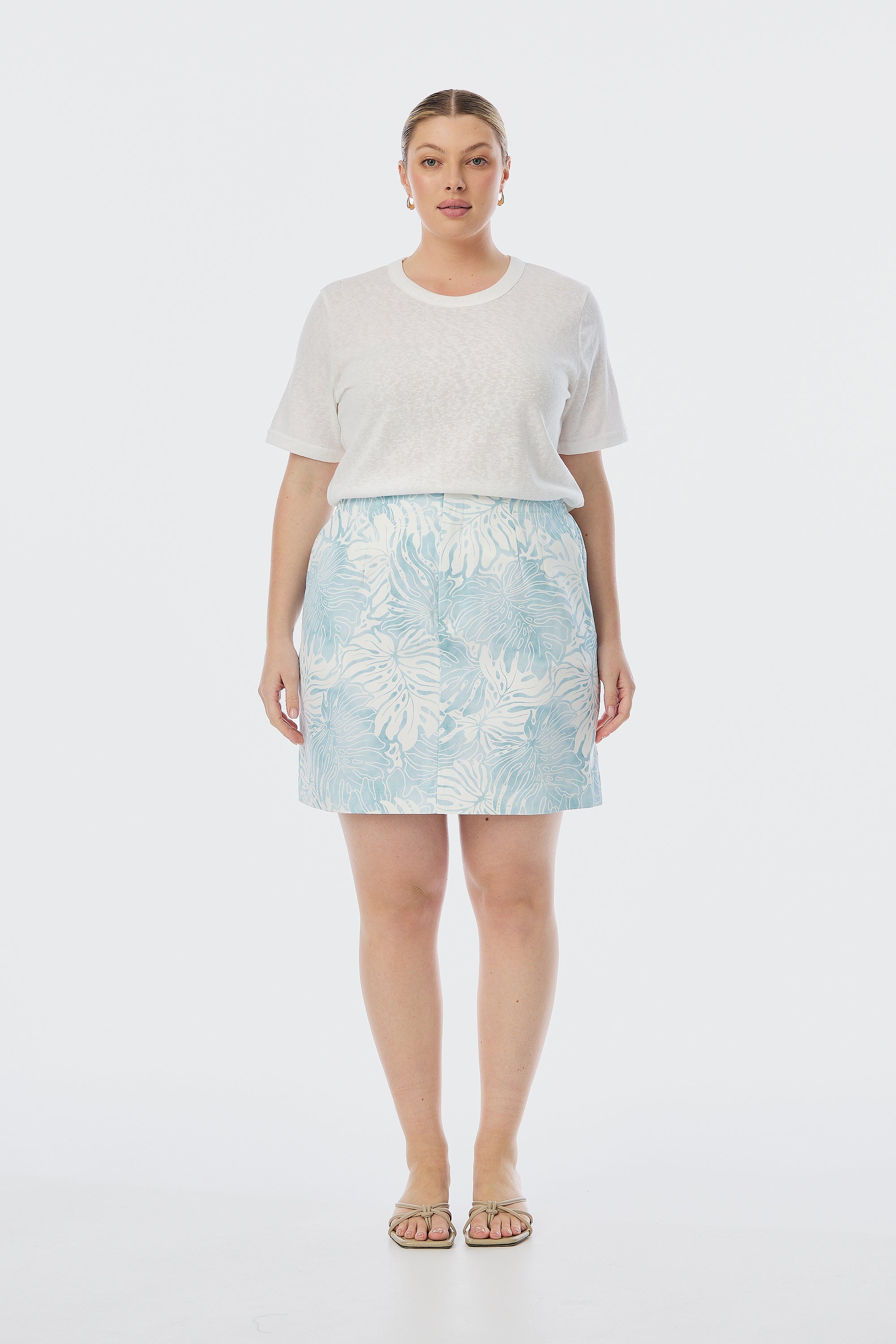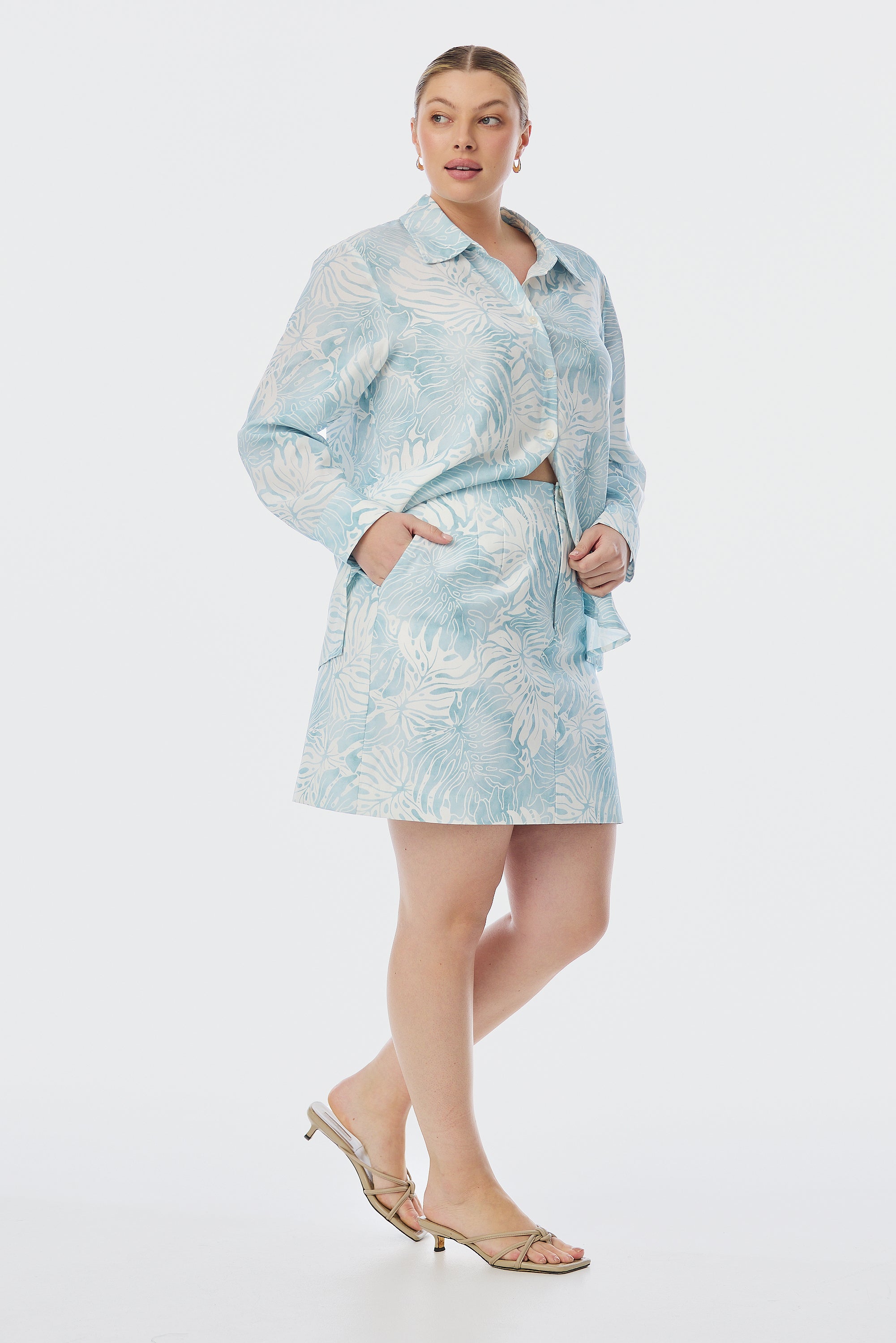 A polished mini in a statement print. The Tailored Mini Skirt in Ice Blue Abstract Leaves sits high on the waist with a concealed hook and bar closure, fly front zipper, and cutaway pockets. Front pleat detailing and elasticated panels at the side-back waist ensure both shape and comfort. Fully lined and cut in an A-line silhouette from mid-weight fabric in an exclusive Serafina print.