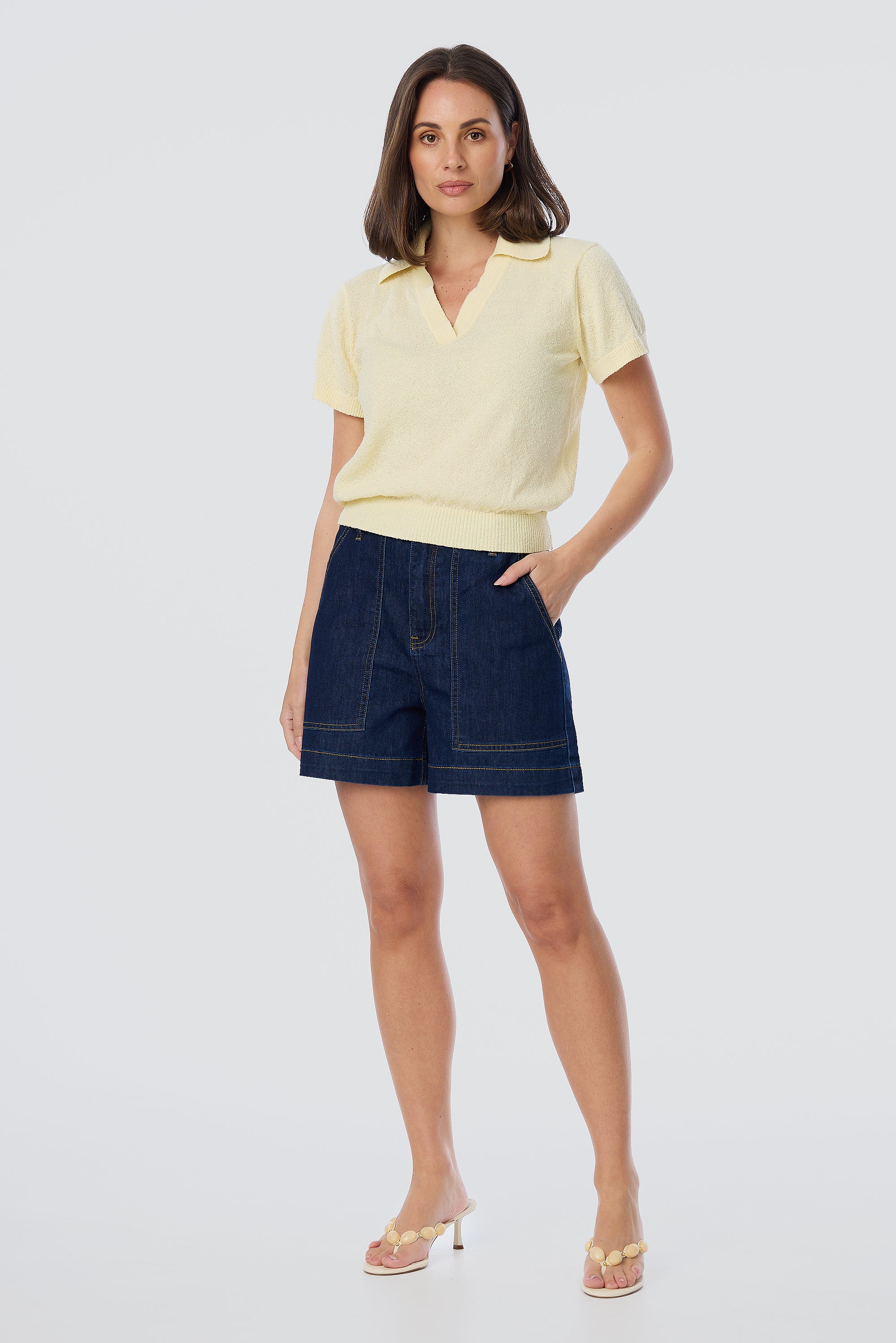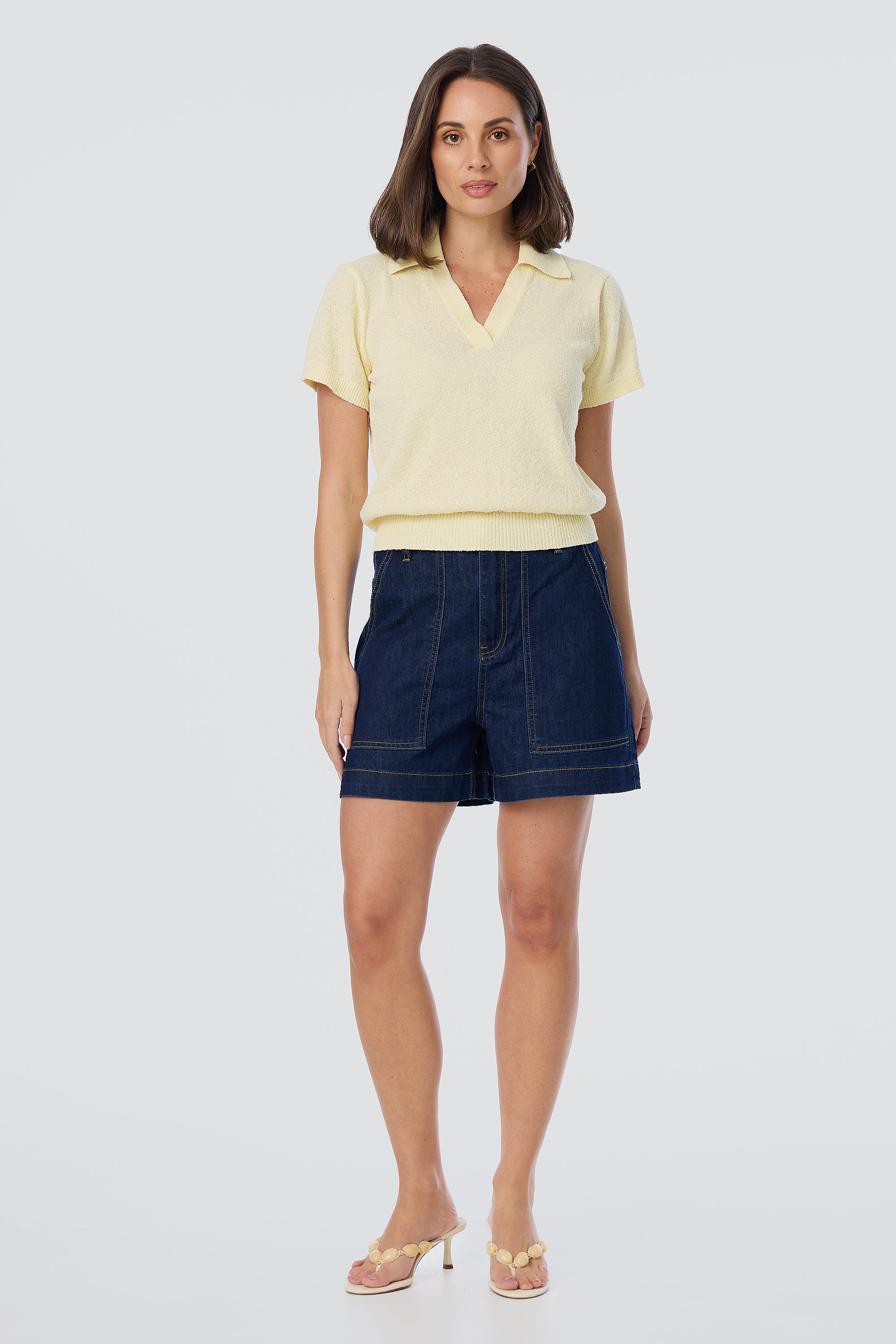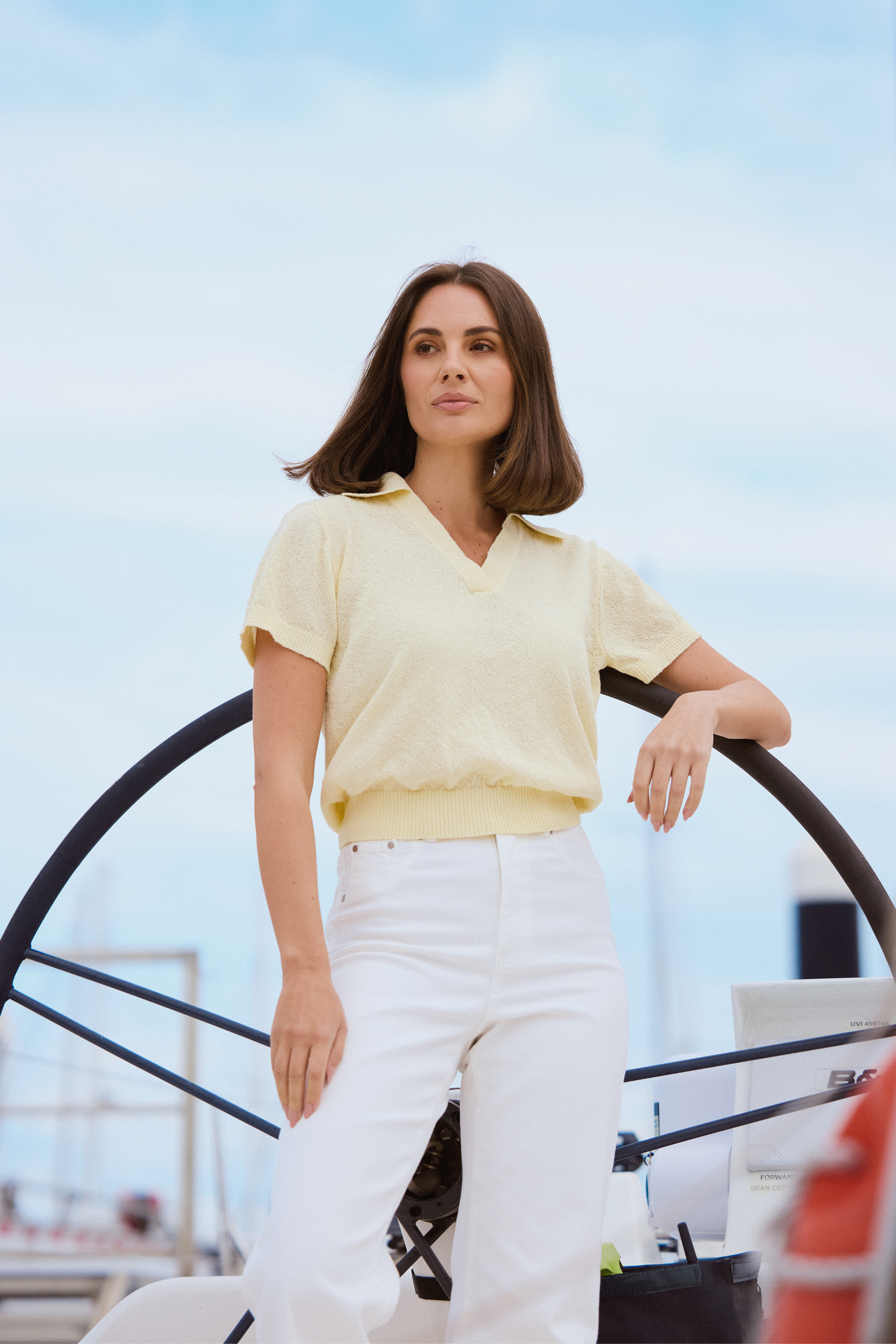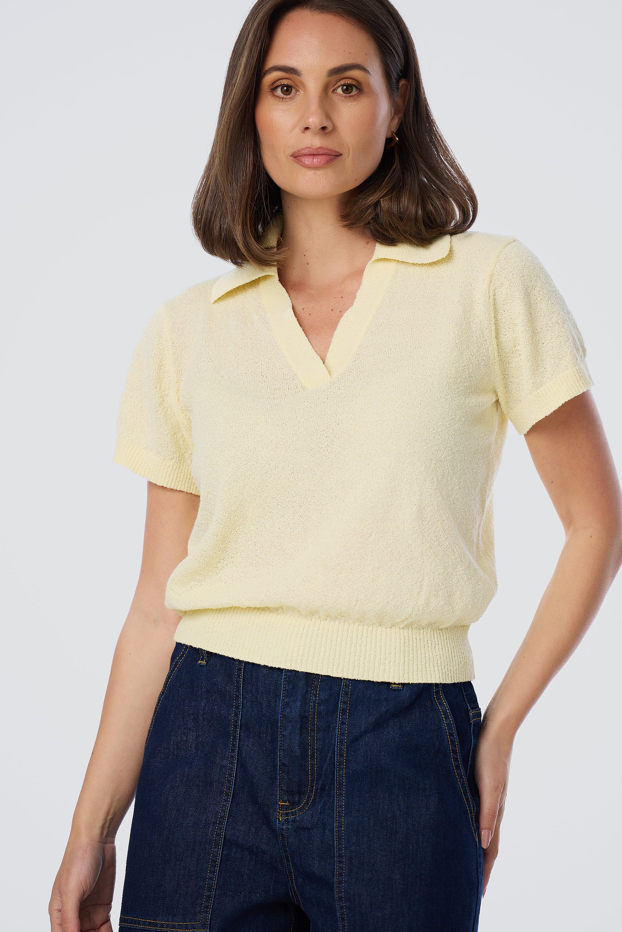 A refined take on casual, the Textured Polo Knit Top in Panna Cotta offers a relaxed fit and subtle texture. With ribbed finishes and a softly structured drape, it’s a perfect all-season staple.