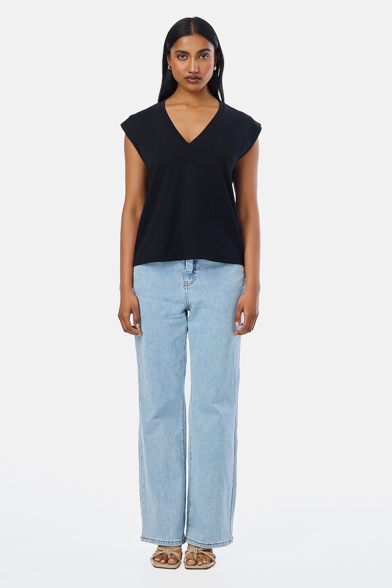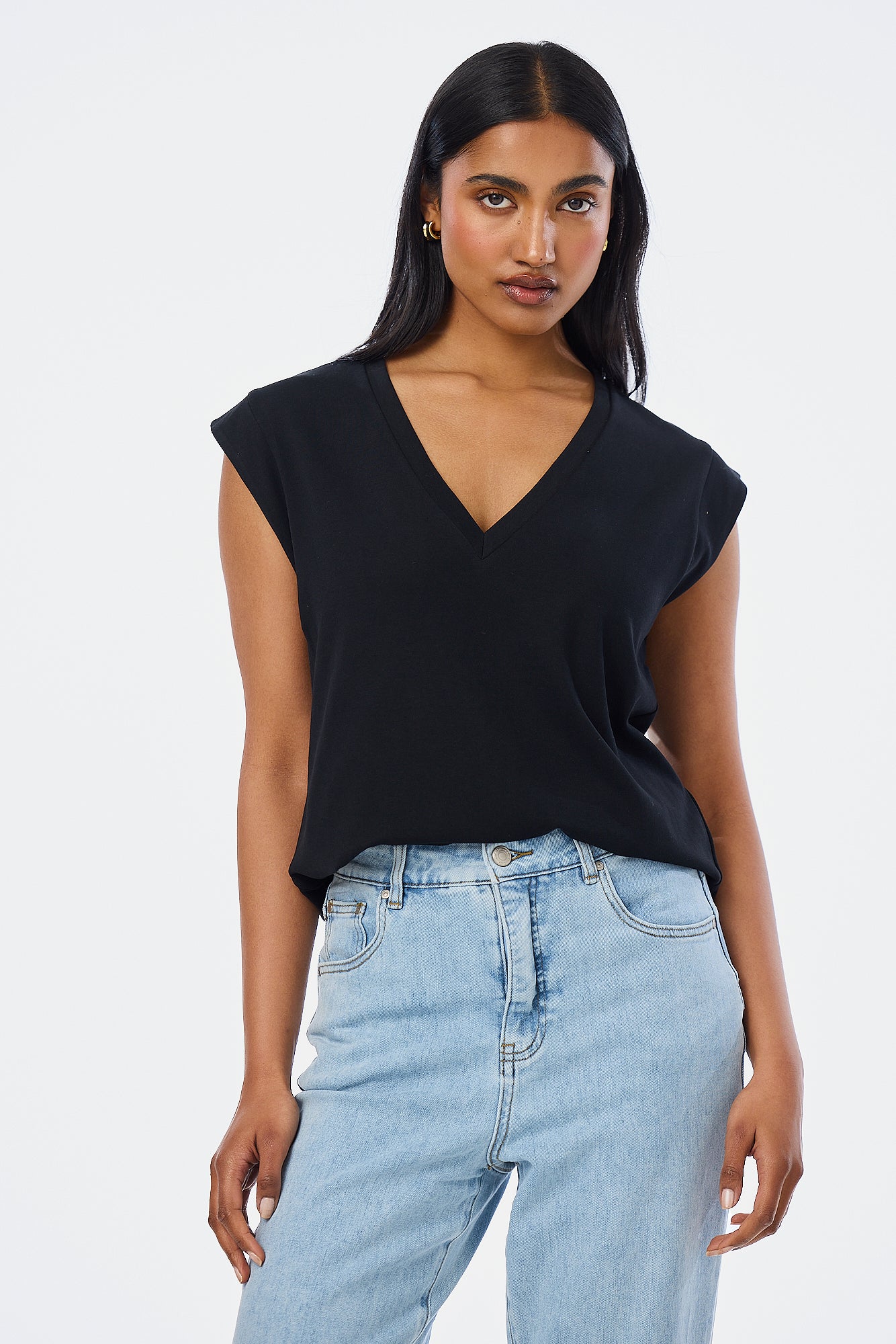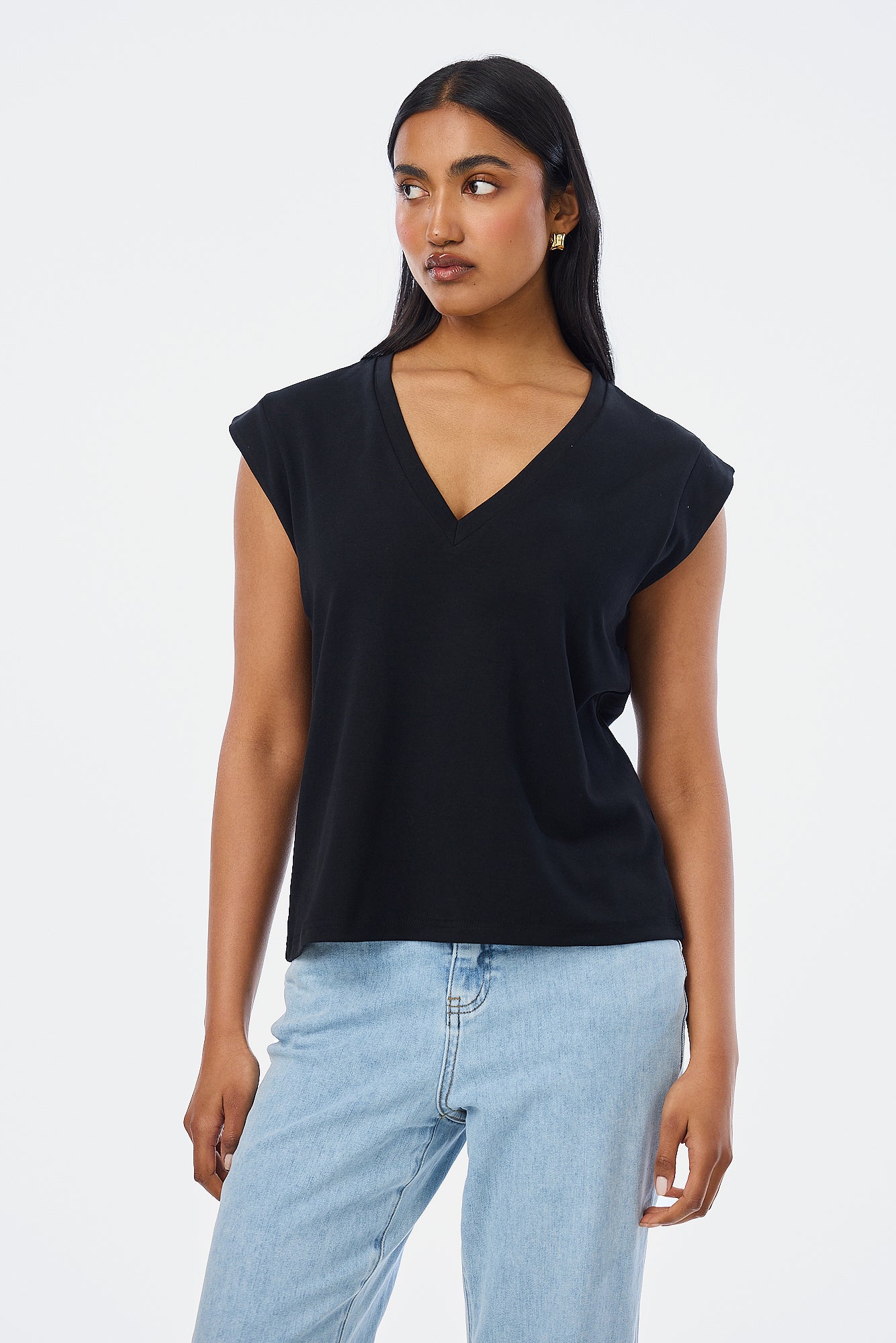 Your favourite silhouette, reimagined with a fresh neckline. The V-Neck Cap Sleeve Jersey Tank in Black combines softness and stretch with a relaxed drape and flattering cap sleeves. A true essential for elevated layering or standalone ease.