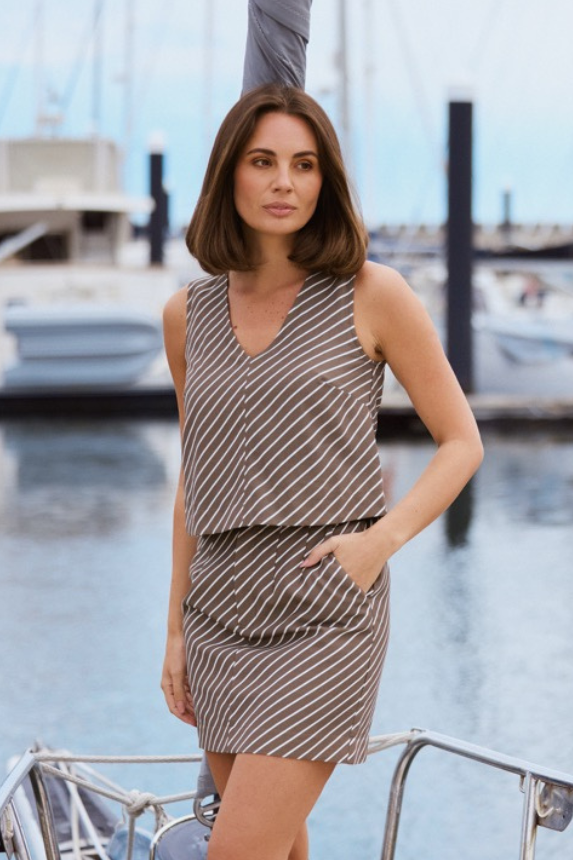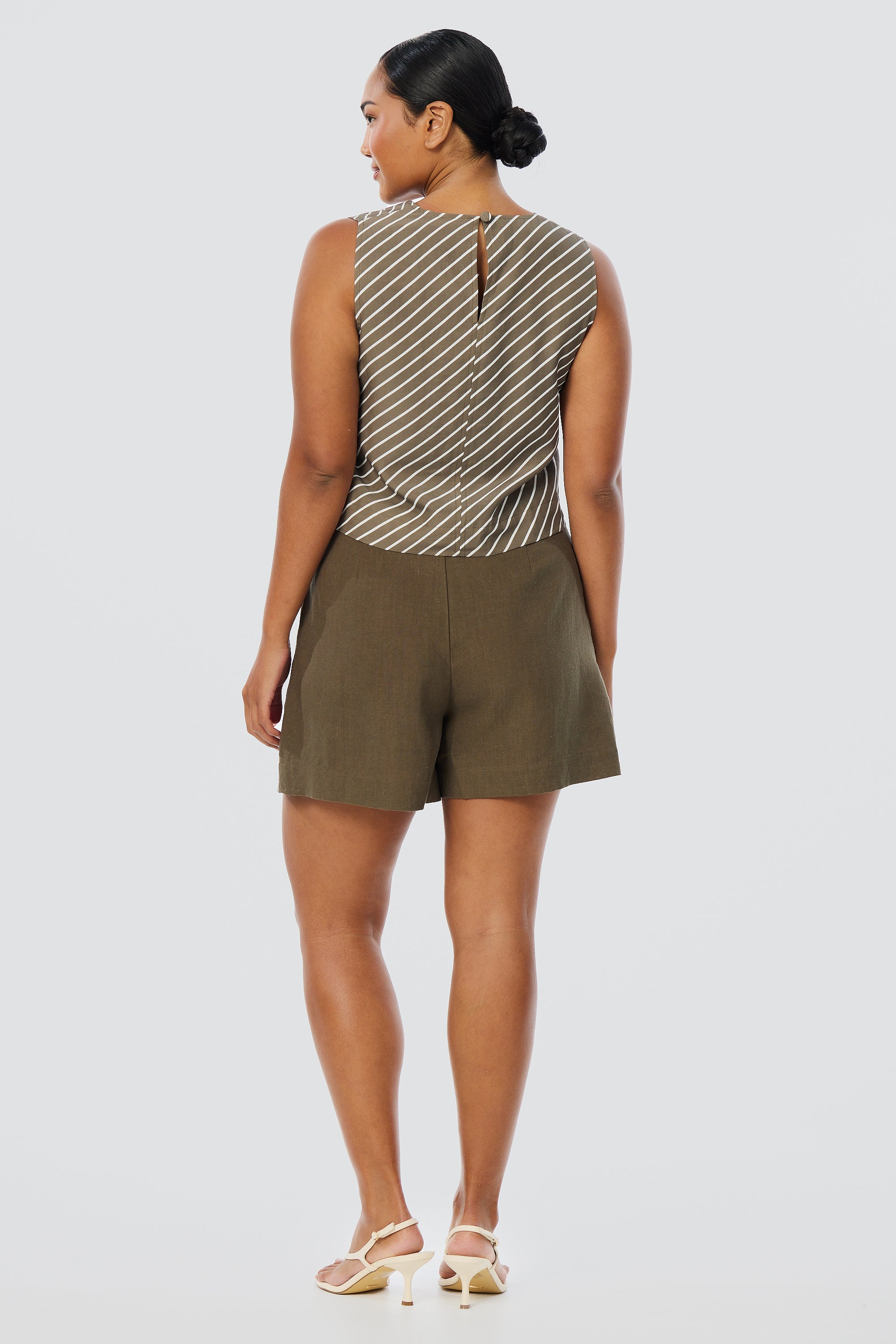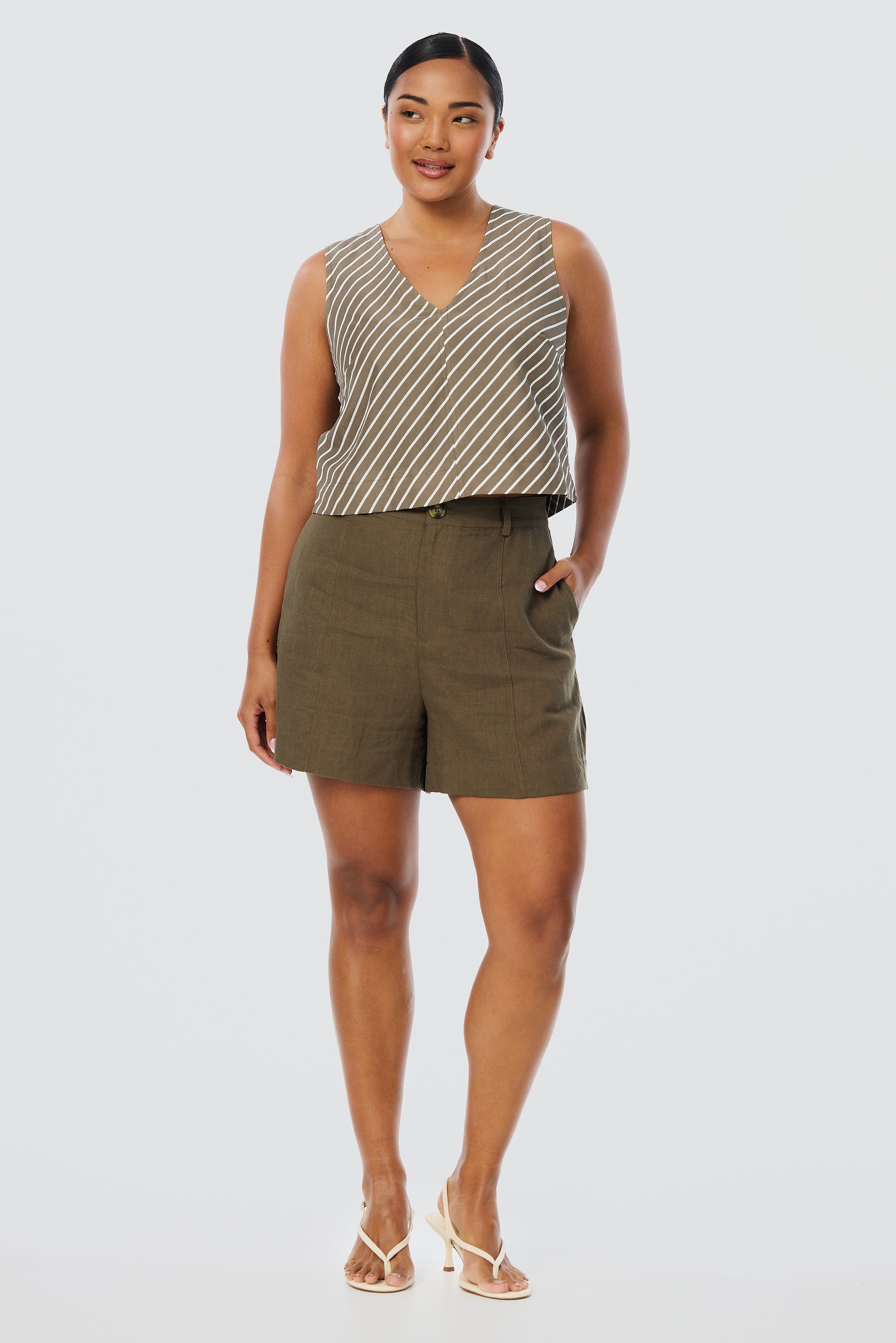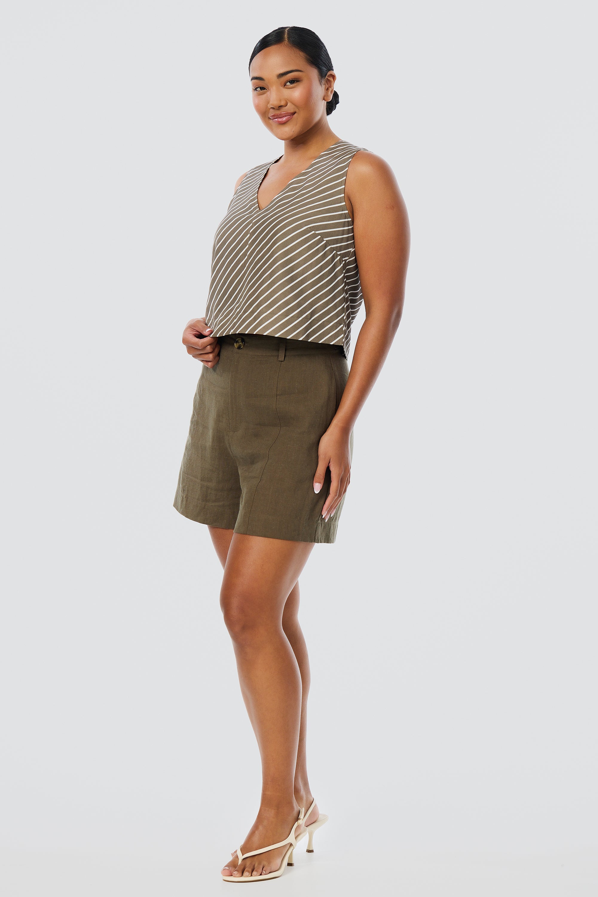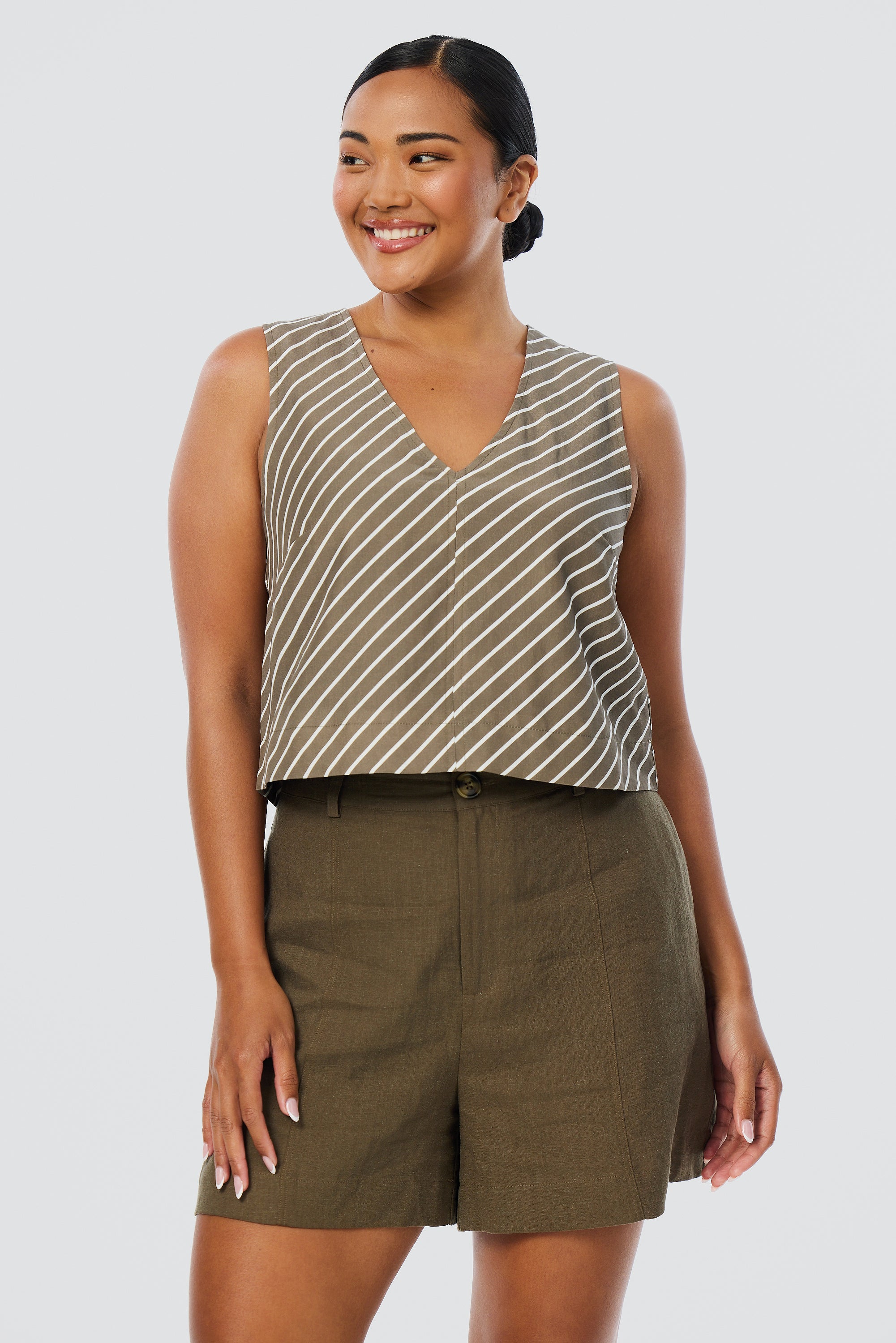 Minimal and modern, the V Neck Topstitched Tank in Dark Olive Stripe is designed with clean lines and a slightly cropped silhouette. Featuring subtle seam detailing and full lining, it’s an elevated warm-weather essential.