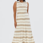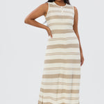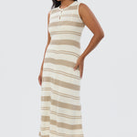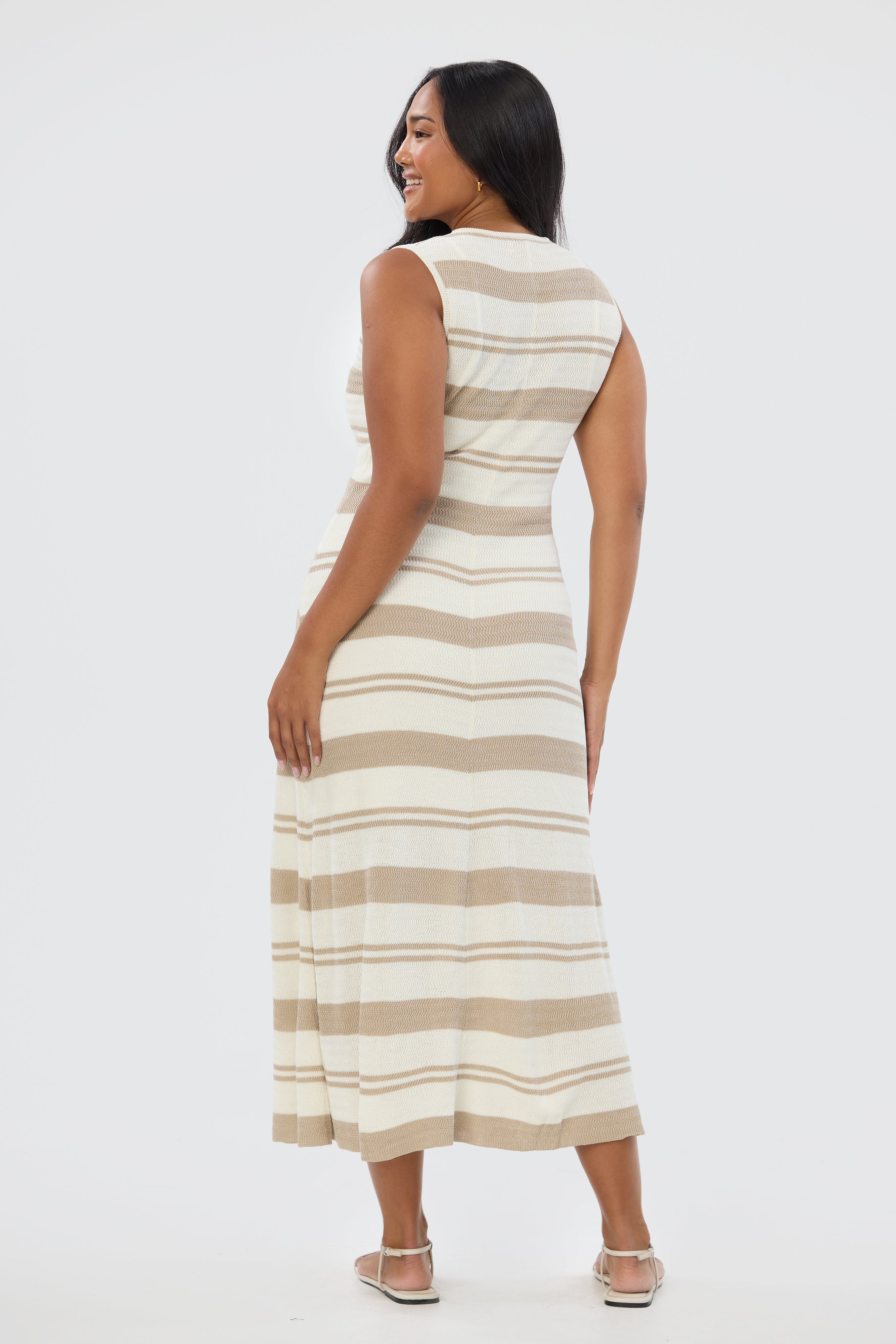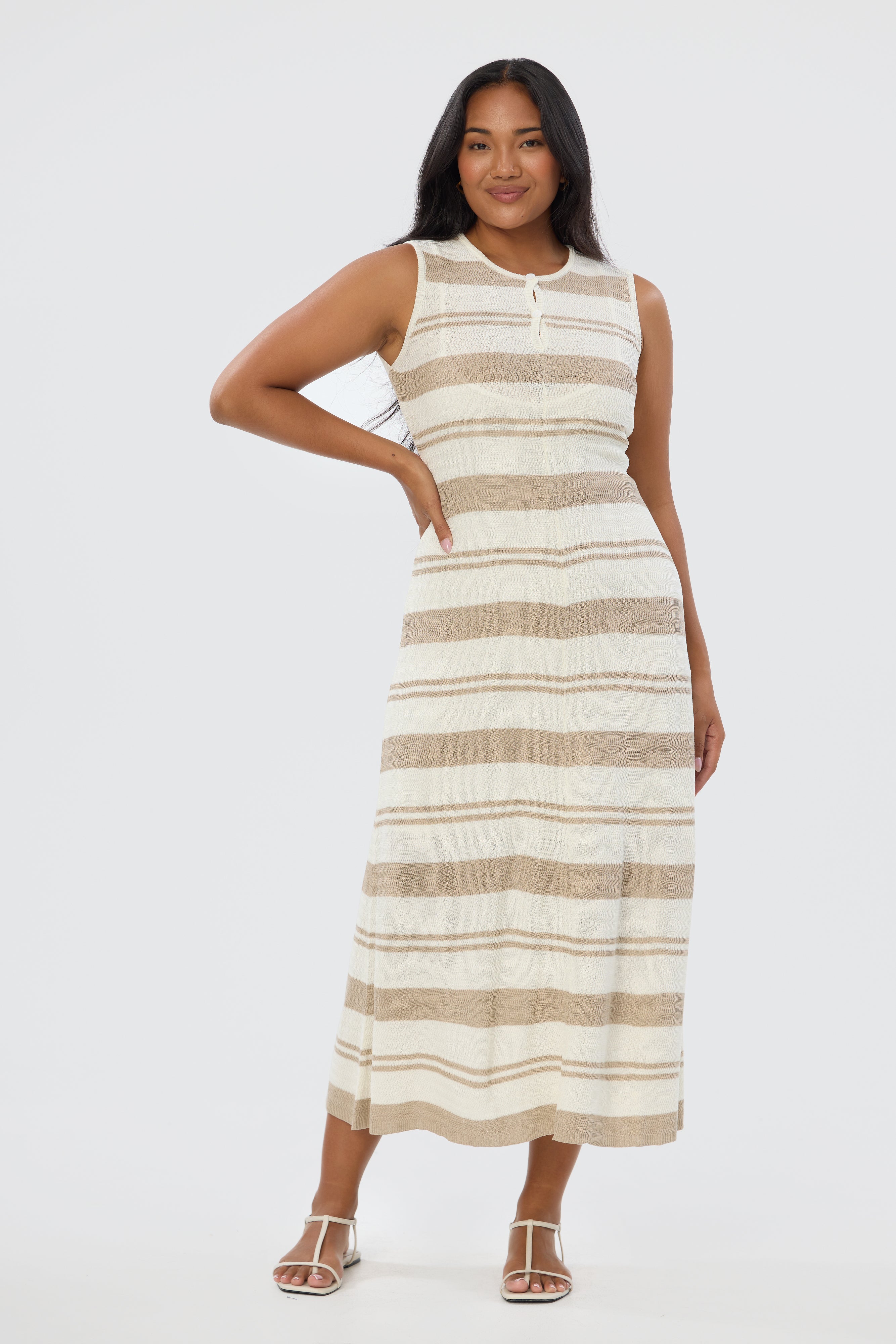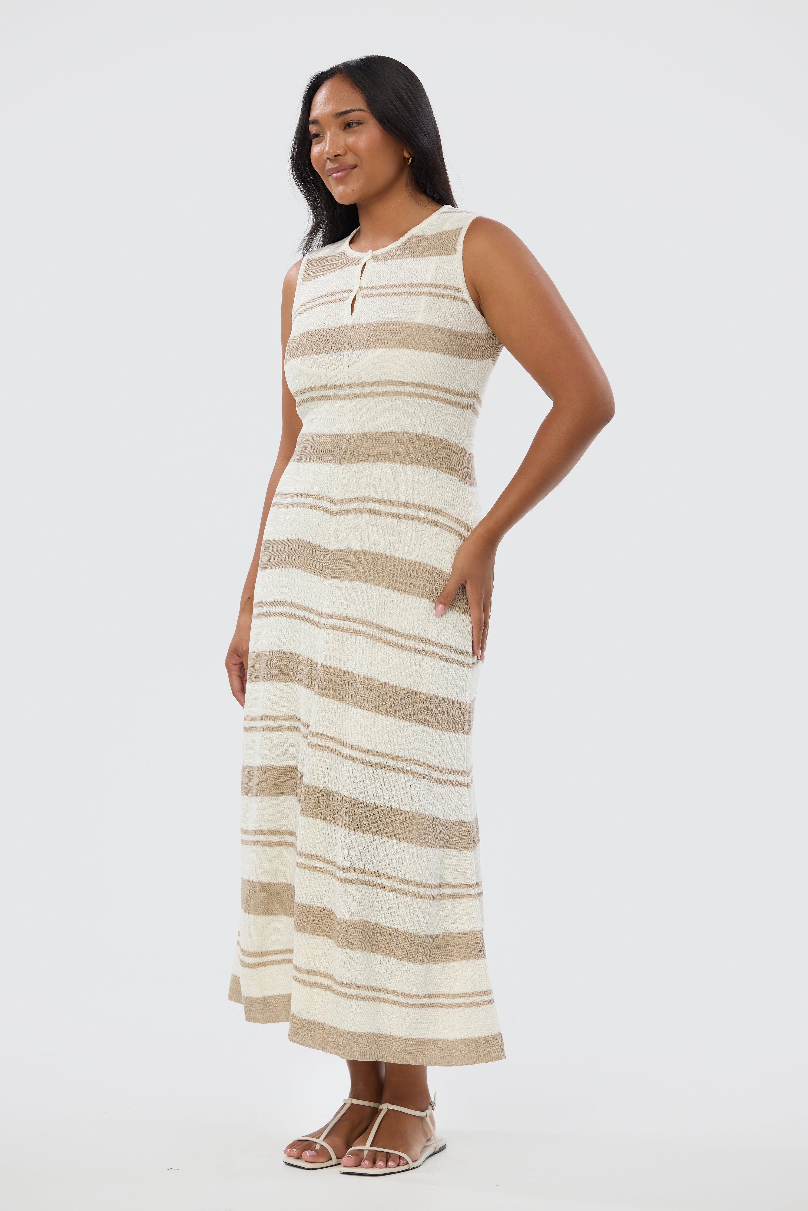 Effortlessly refined, the Crochet Sleeveless Dress in Wheat Stripe is crafted from a softly textured mid-weight crochet knit. Designed with a round neckline and subtle keyhole detail, it falls into an easy A-line silhouette. Finished with a detachable slip for comfortable coverage, it’s a versatile dress suited to both everyday wear and occasion dressing.