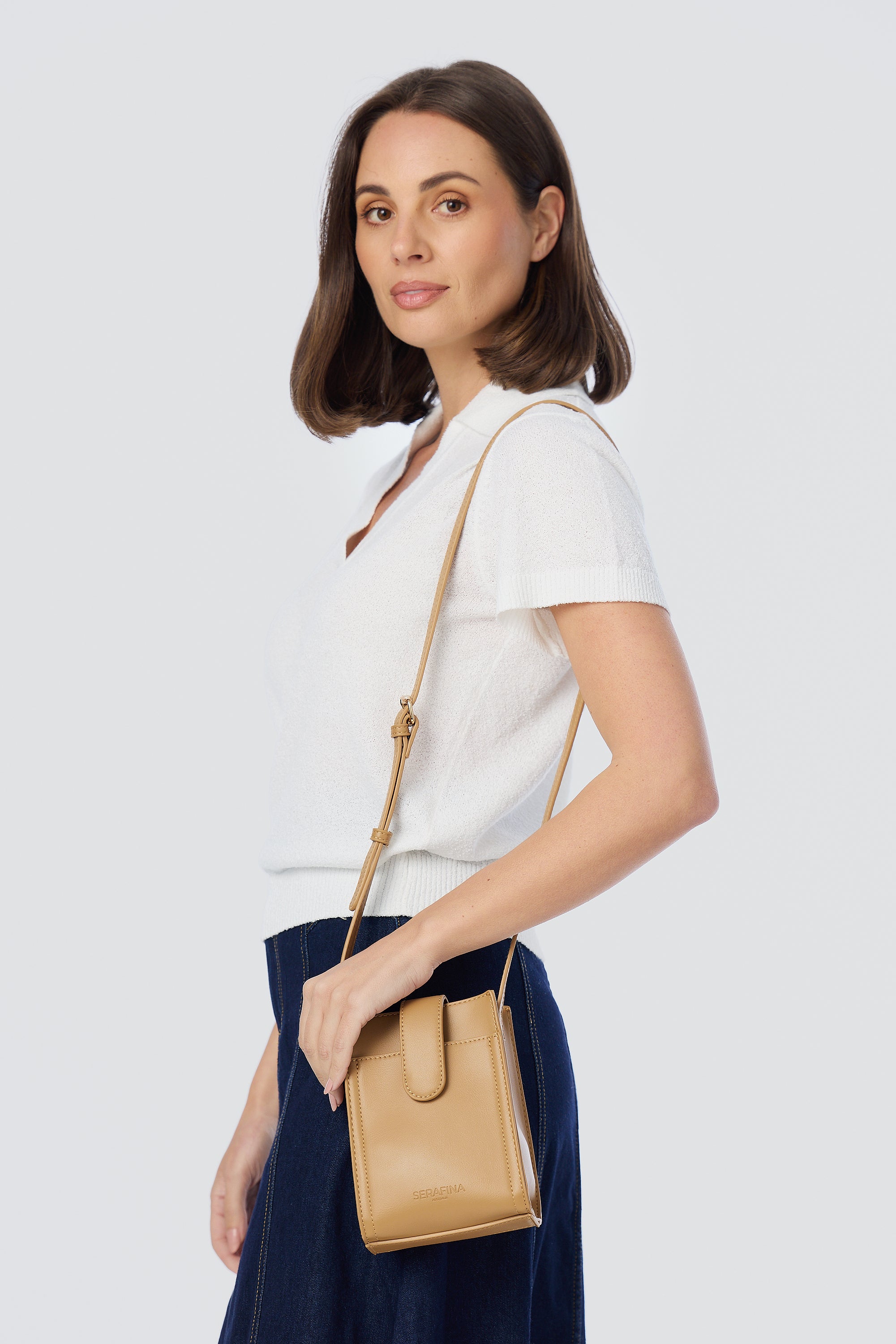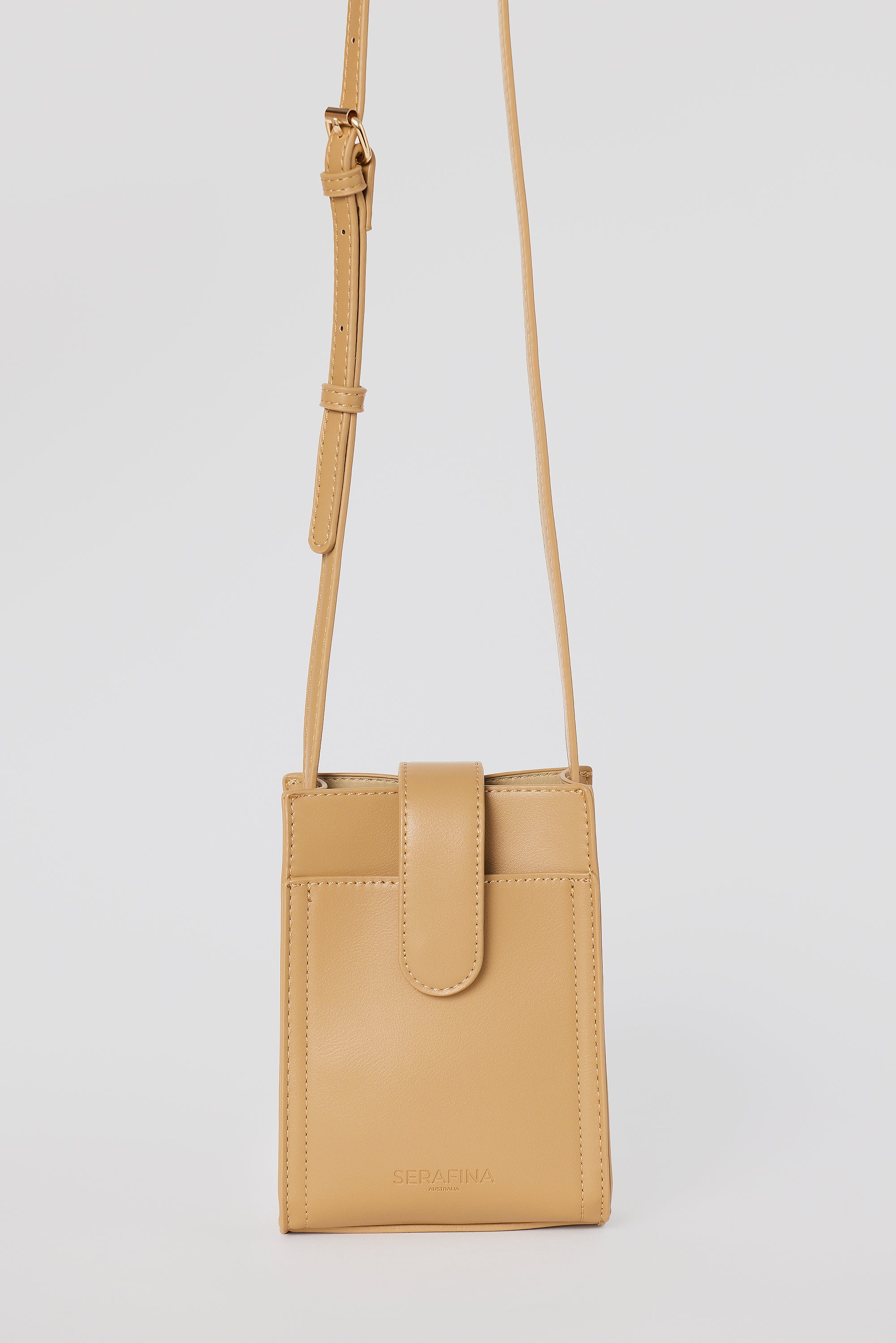 Compact and versatile, the Crossbody Sling Bag in Tan is crafted from soft vegan leather and features a fold-over closure with an adjustable strap for easy, everyday wear.