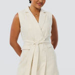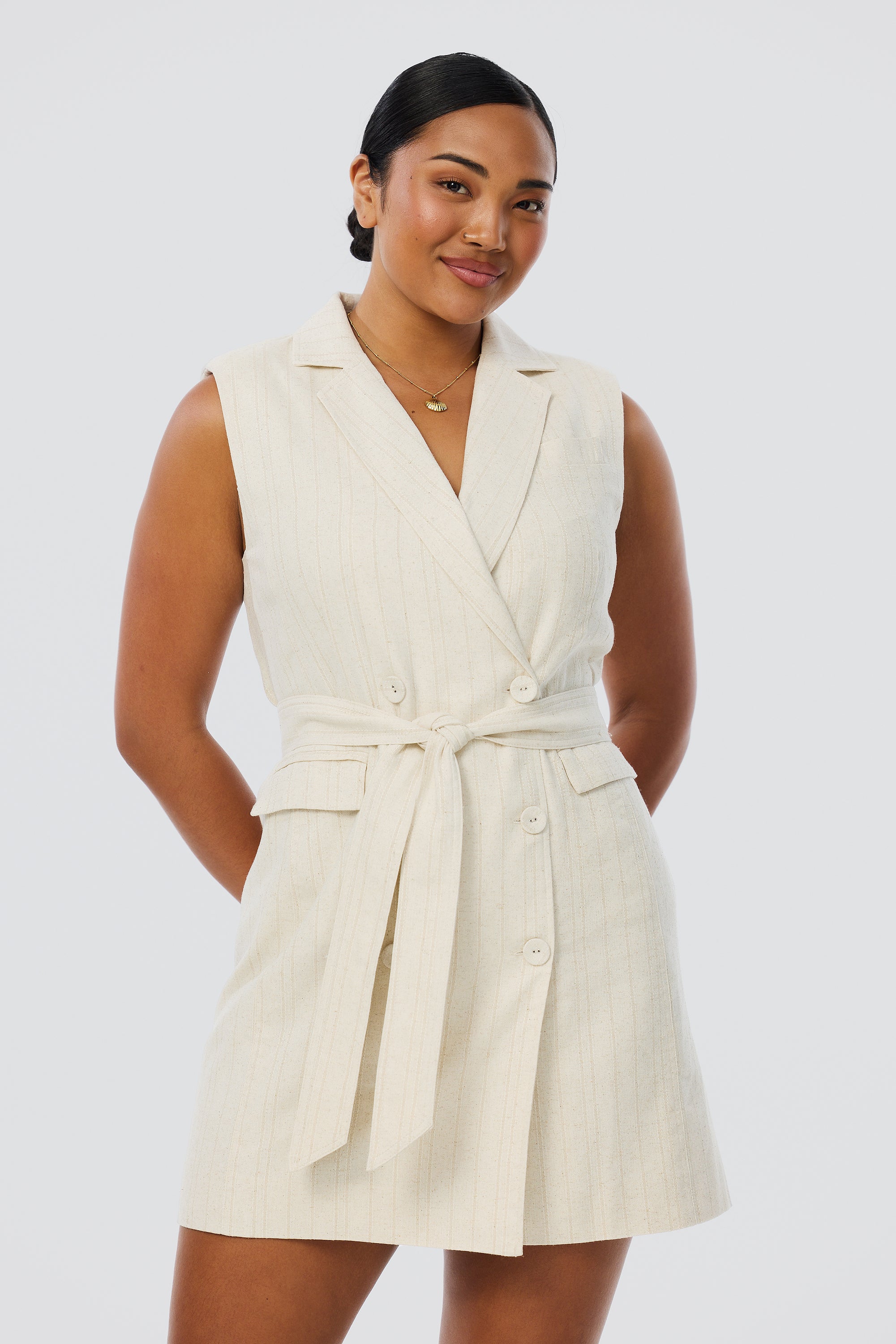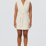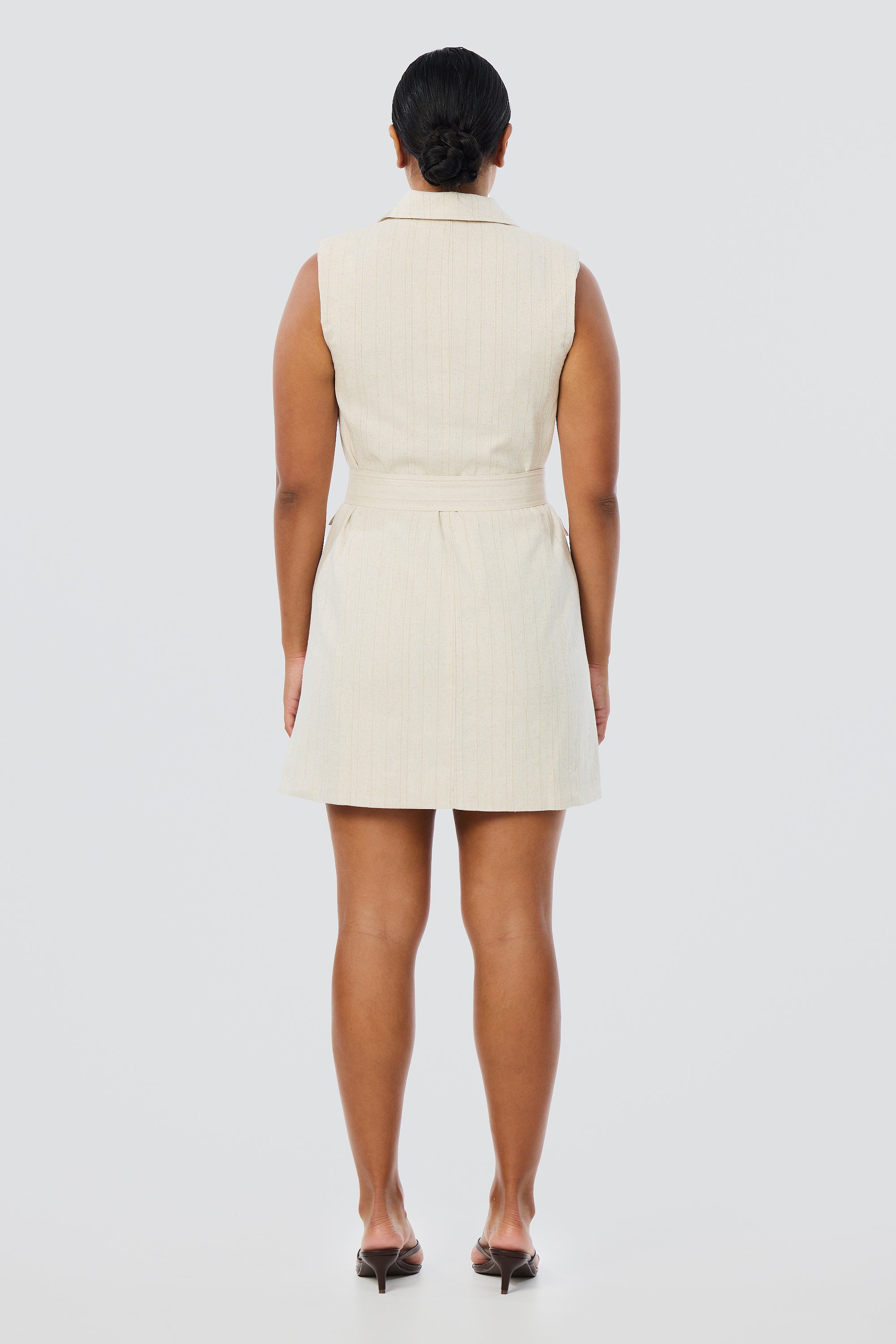 The Double Breasted Mini Dress in Oatmeal Stripe combines tailored details with a breathable, summery fabric. Fully lined and finished with a detachable tie, it's both structured and versatile.