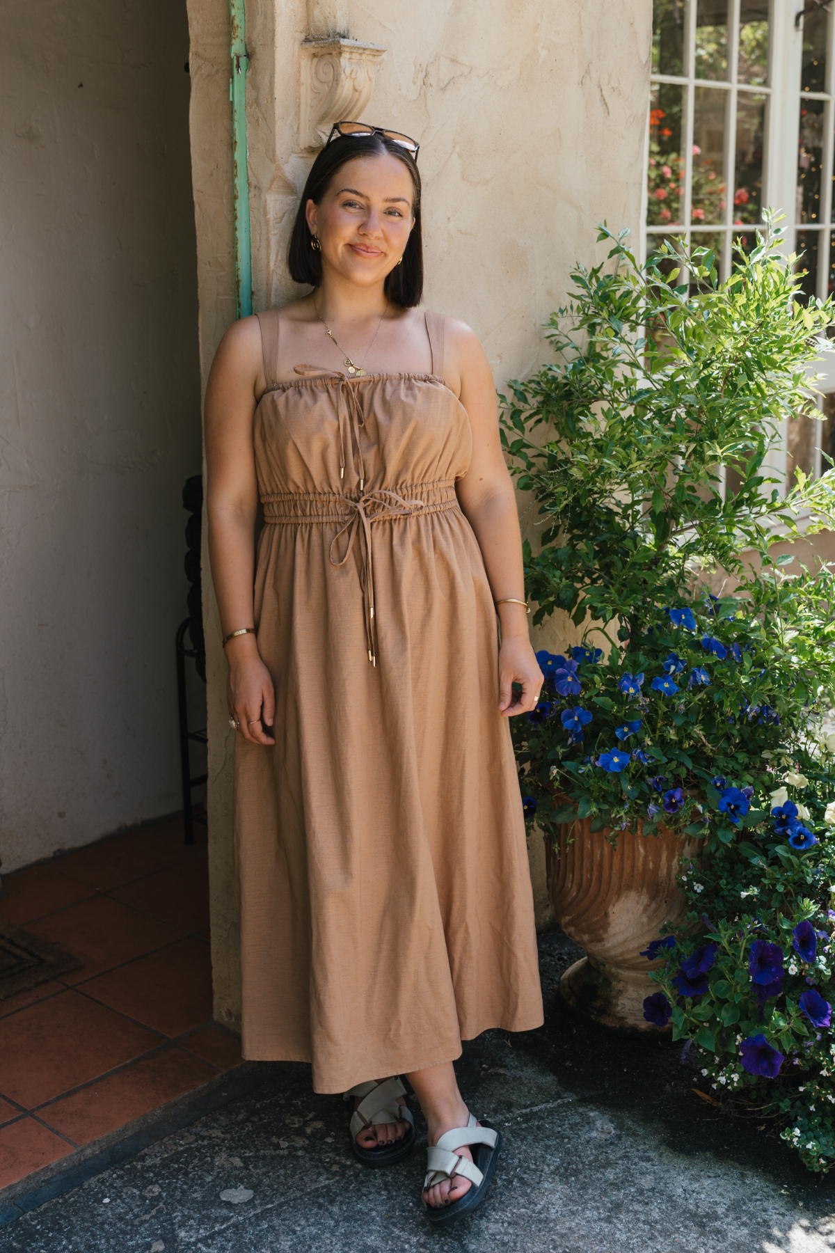 The Gathered Midi Dress in Copper is crafted from a mid-weight cotton-linen blend for a soft, structured drape. Featuring a square neckline and adjustable drawstrings at the top and waist, it falls to a relaxed midi length for all-day comfort.