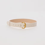 Enhance your wardrobe with the Wide Vegan Leather Belt in Ecru. Crafted from premium vegan leather, these belts feature a sophisticated gold metal buckle and are 4 cm wide, perfect for adding a finishing touch to your outfit.