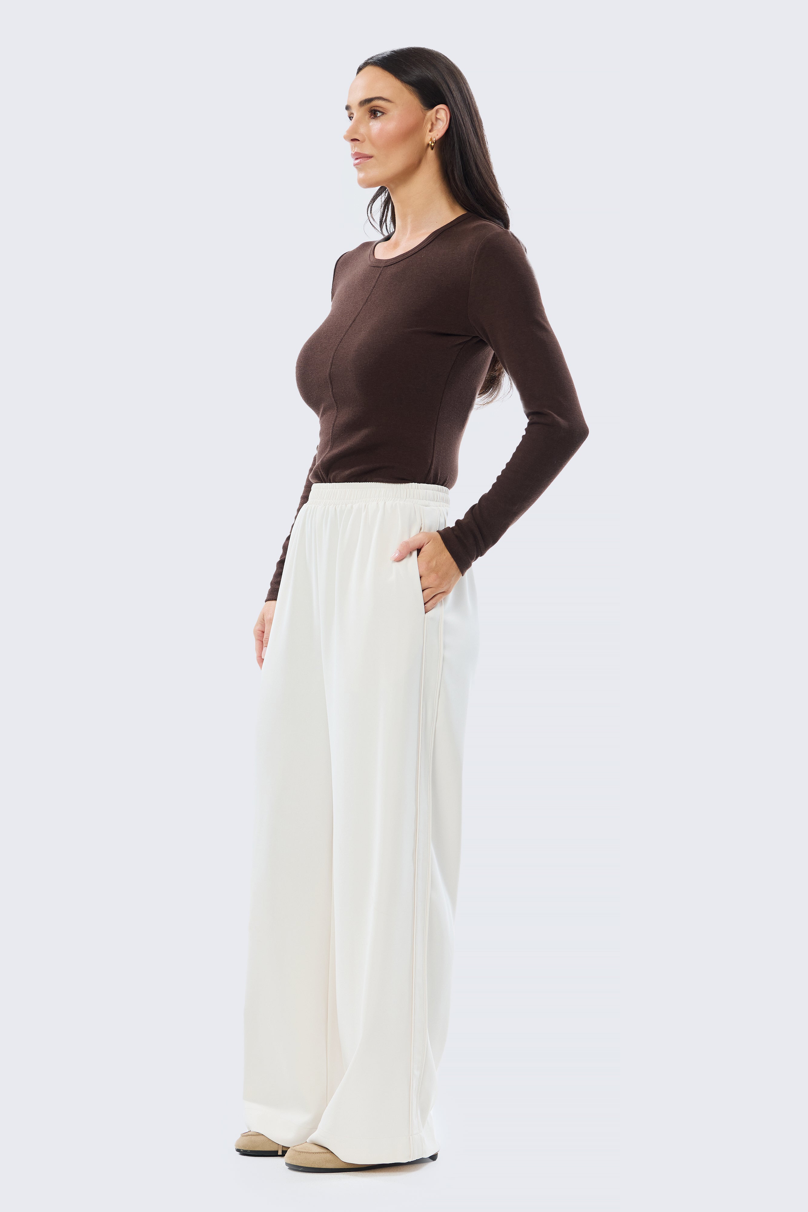 The Elastic Waist Pant in Ecru offers a refined take on everyday comfort. This full-length style features an elasticated waistband, a relaxed wide-leg silhouette, inseam pockets, and a side seam panel with piping for a subtle point of difference. A 4cm hem allowance allows for easy altering, creating a versatile piece suited to day-to-day wear.