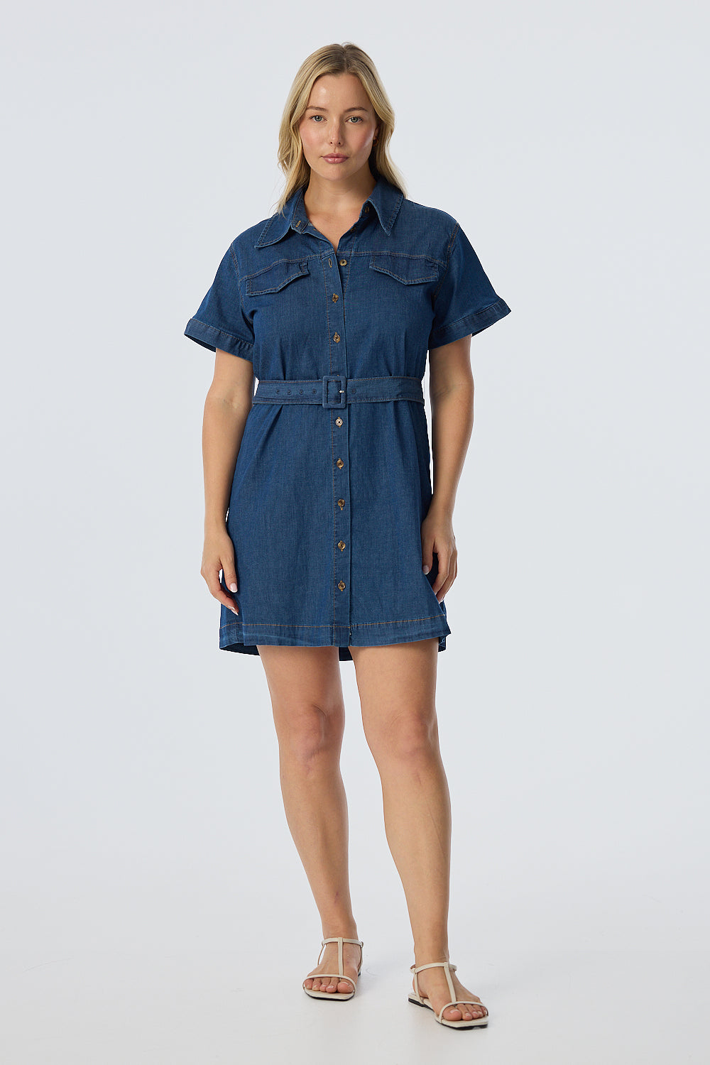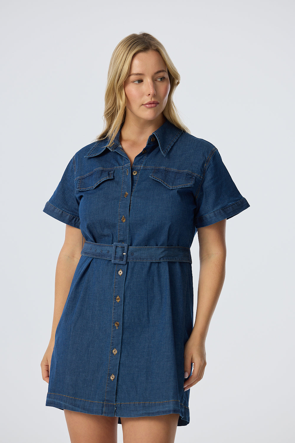 Denim Buttoned Mini Dress - Mid Blue Wash
