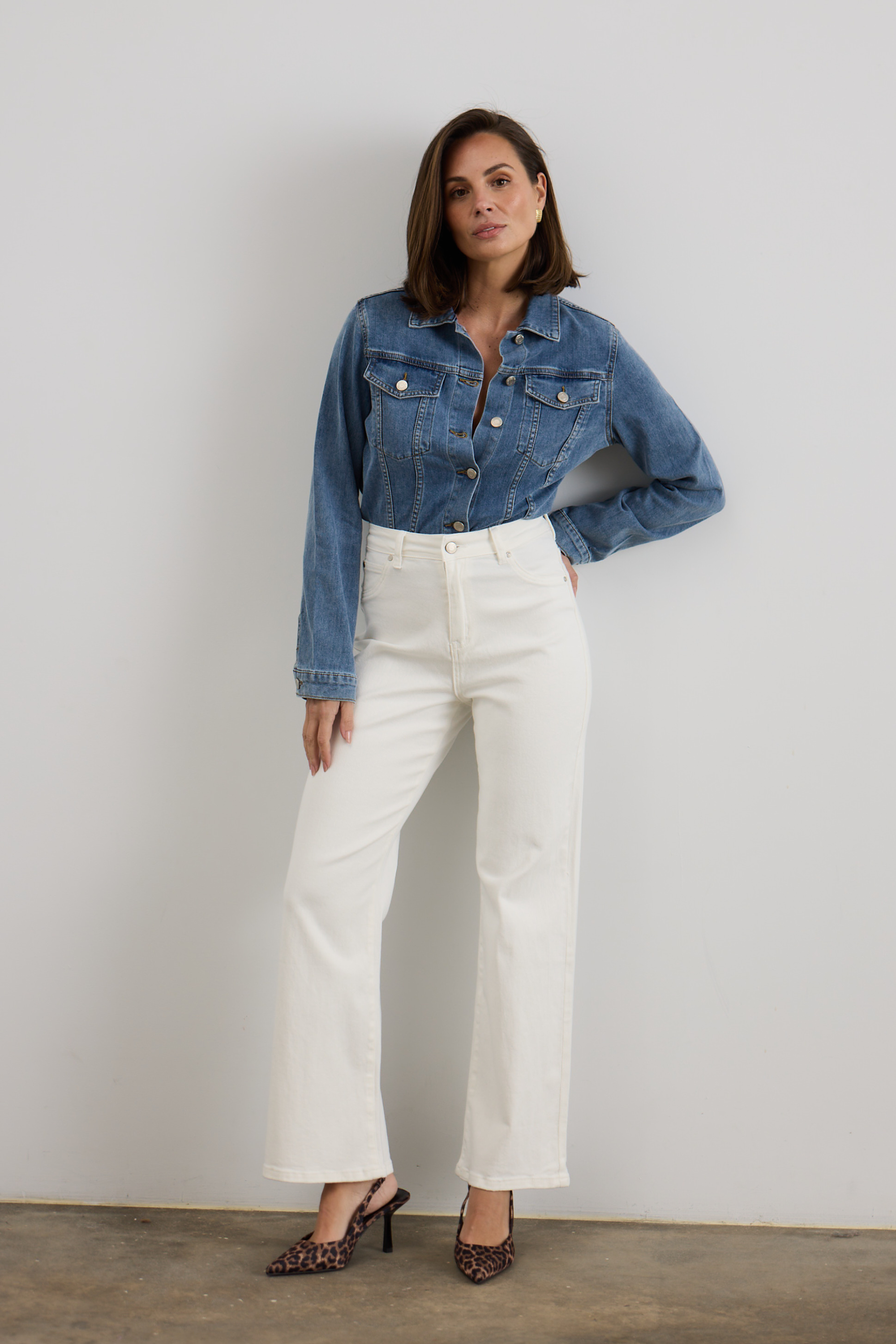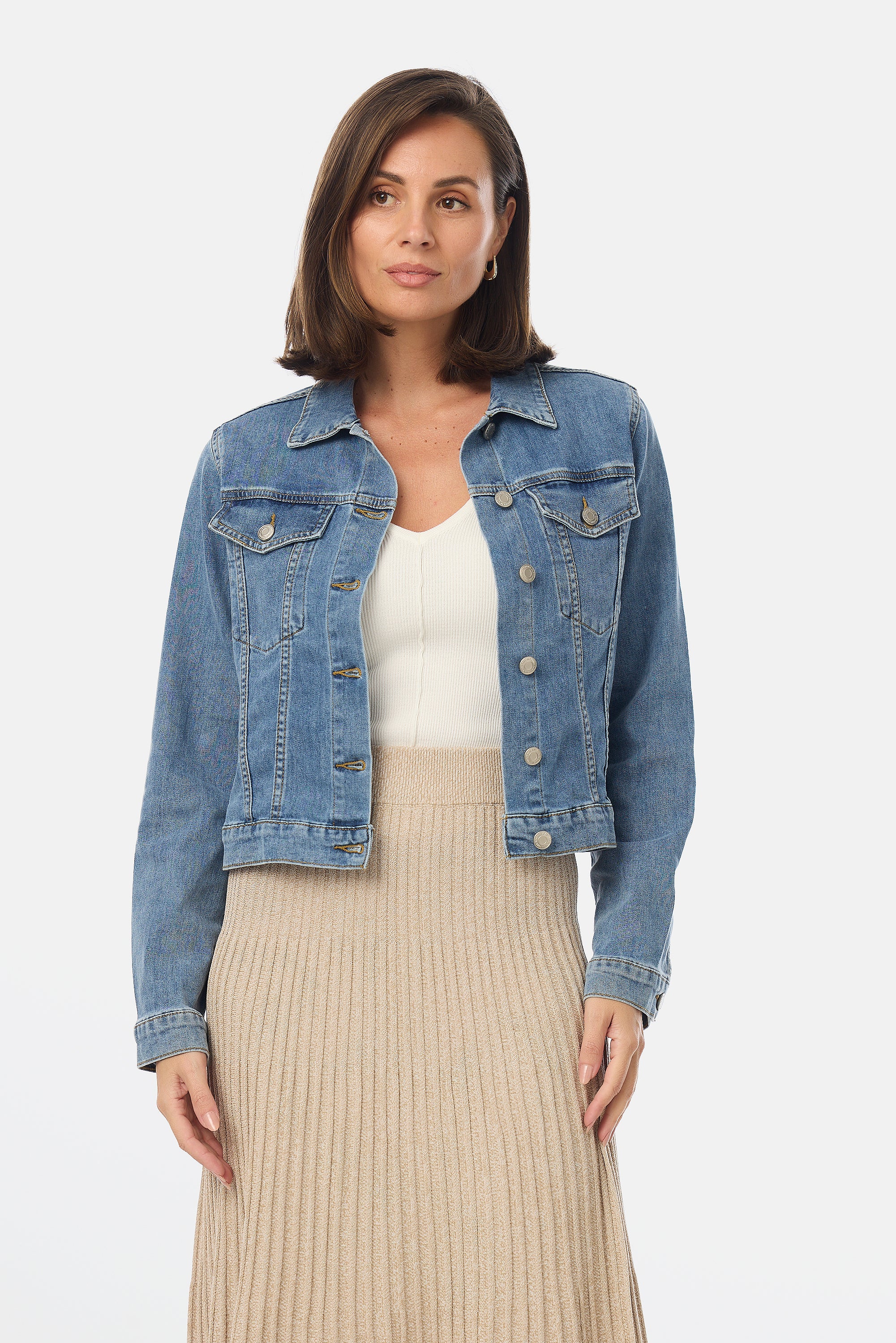 The Denim Jacket in Mid Blue Wash is your versatile layering hero, blending timeless styling with a touch of stretch for ease. Classic topstitched detailing and functional patch pockets elevate this mid-length jacket, designed to sit just right over dresses or trousers.