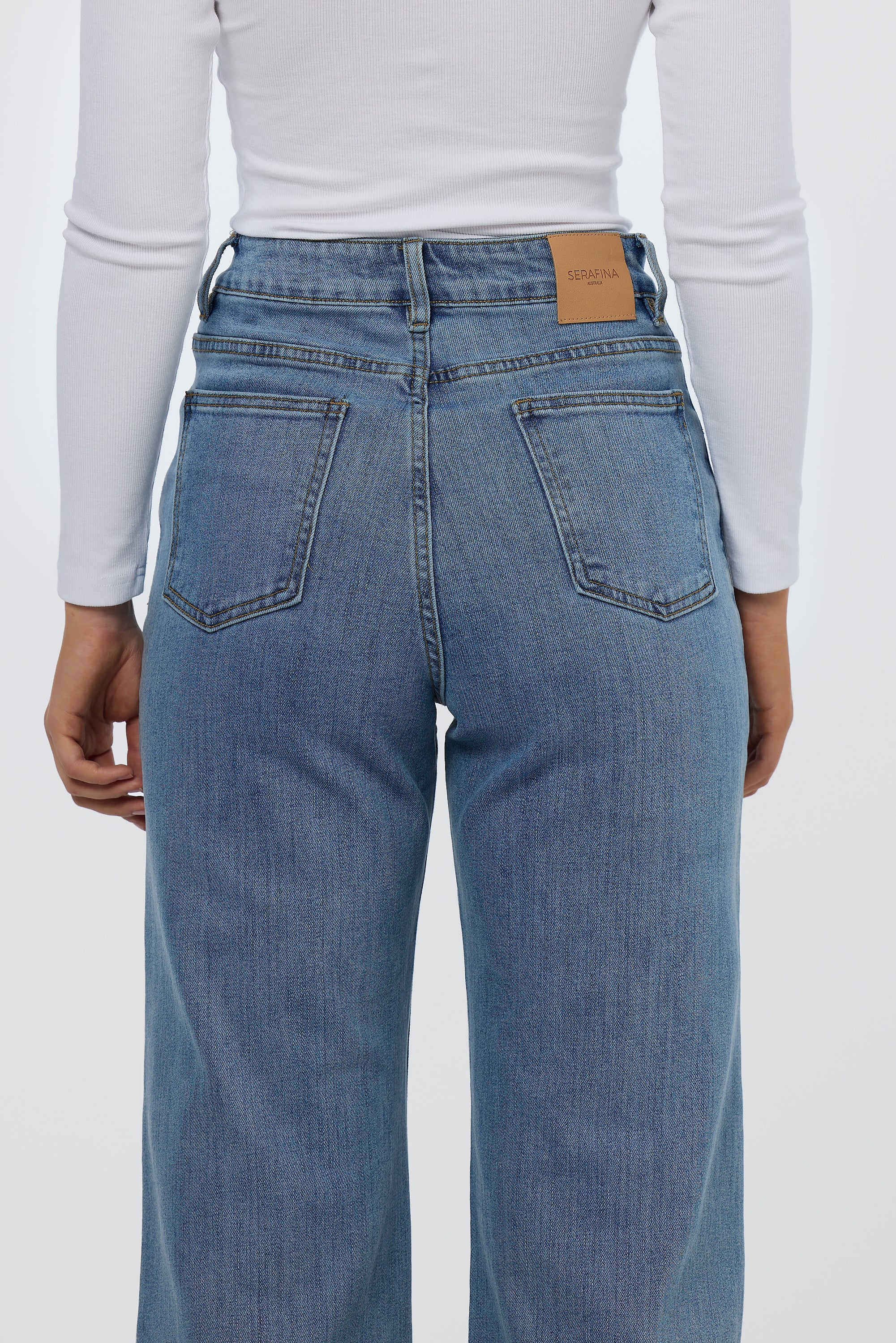 - Serafina vegan leather patch on back waistband
