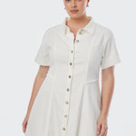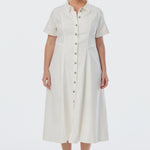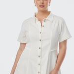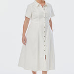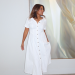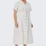 A modern denim staple with feminine structure. The Denim Short Sleeve Midi Dress in White features a collared neckline, front placket with Serafina buttons, and short sleeves. Cut in an A-line silhouette with fray detailing on the yoke and waist seams, it’s crafted from stretch denim for maximum comfort in a midi length.