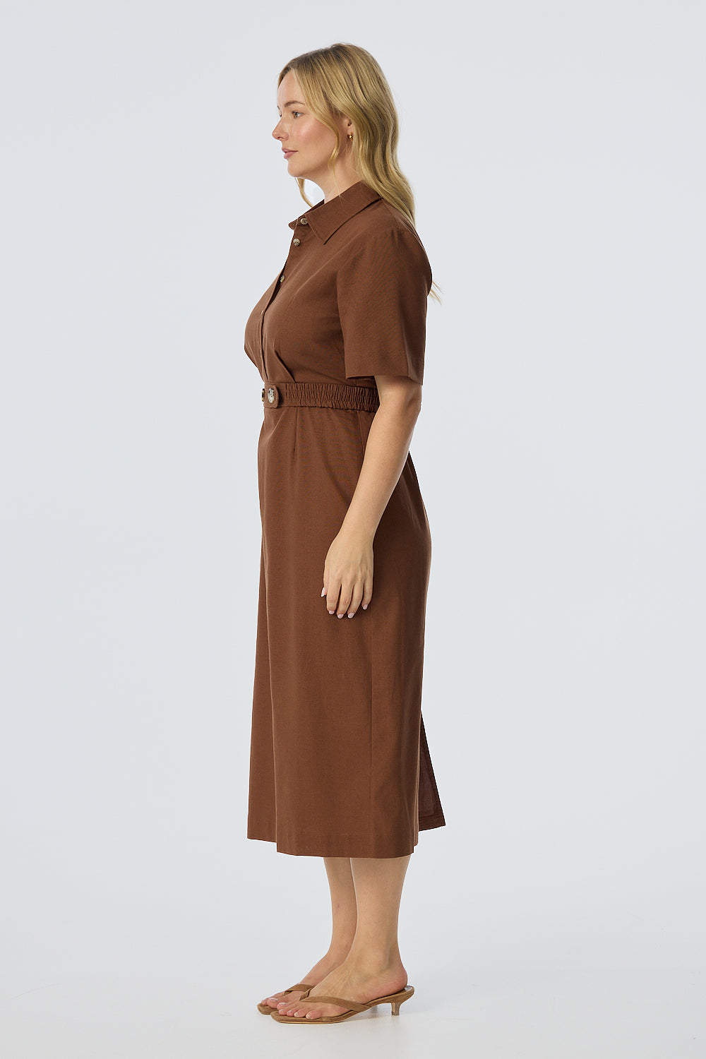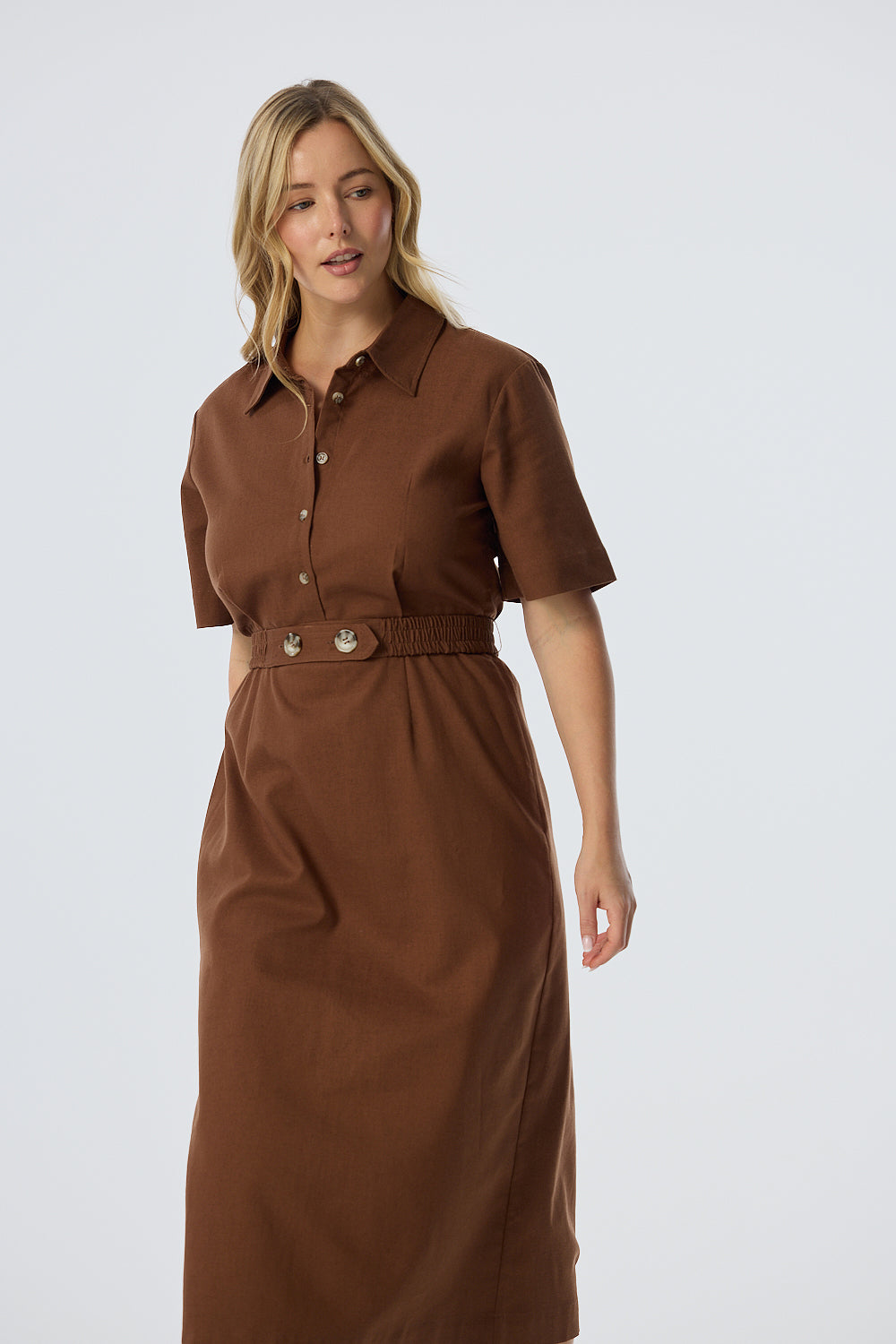 The Elastic Waist Shirt Dress in Walnut combines effortless comfort with tailored detailing. Featuring a collared neckline, short sleeves, and a back elastic waist, it’s finished with a lined skirt and an elasticated belt for a flattering, versatile silhouette.