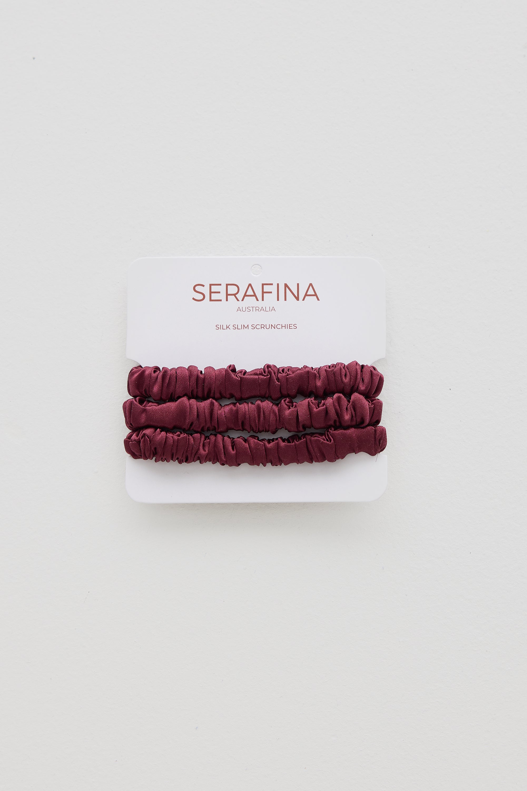 Elevate your everyday ponytail with the Silk Slim Scrunchies in Mulberry. Crafted from pure silk for less breakage and more shine, this trio adds a hint of luxury to your haircare routine.