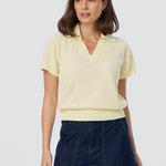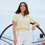 A refined take on casual, the Textured Polo Knit Top in Panna Cotta offers a relaxed fit and subtle texture. With ribbed finishes and a softly structured drape, it’s a perfect all-season staple.