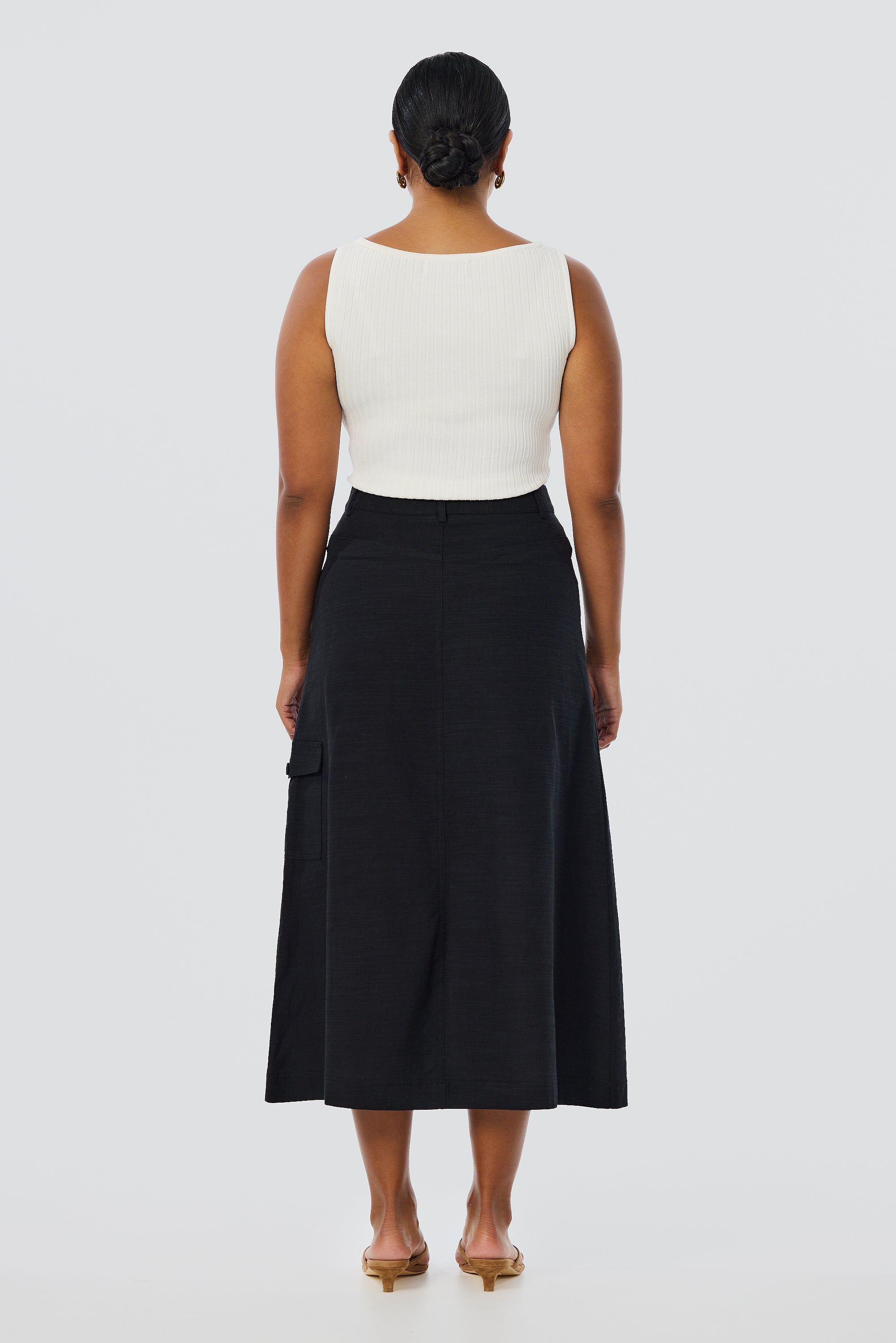 A modern update on utility styling, the Cargo Midi Skirt in Black features structured seaming and cargo pockets in a softly tailored A-line silhouette.