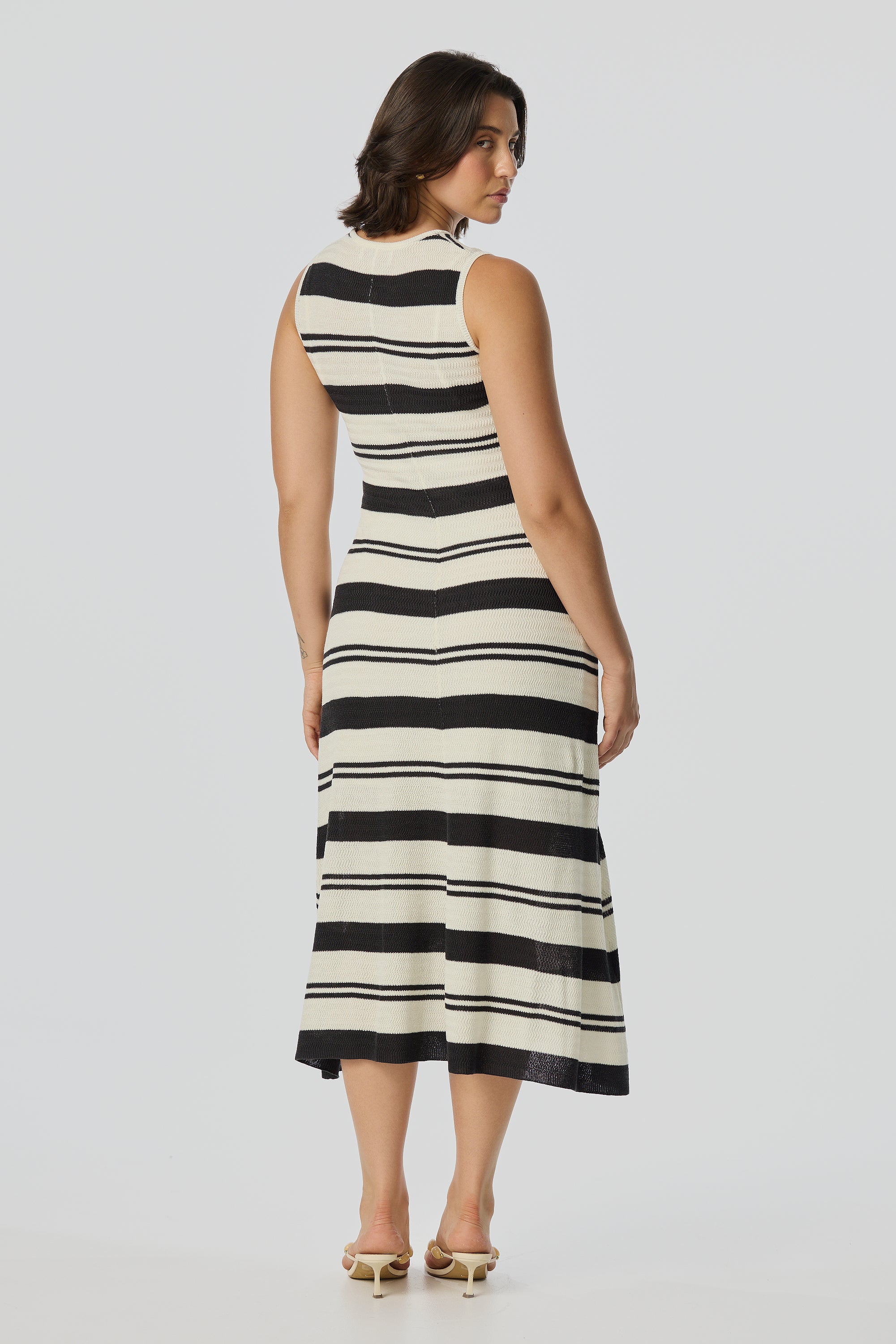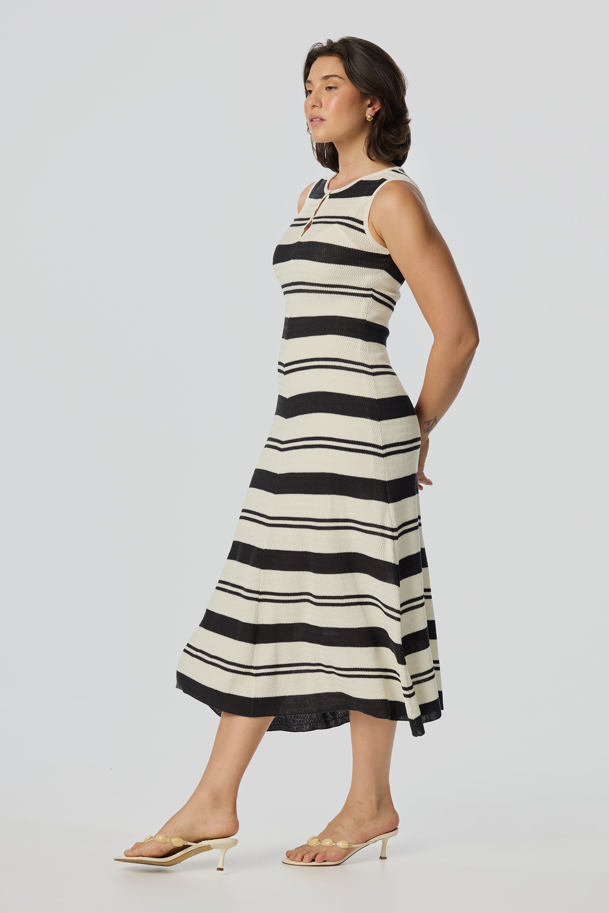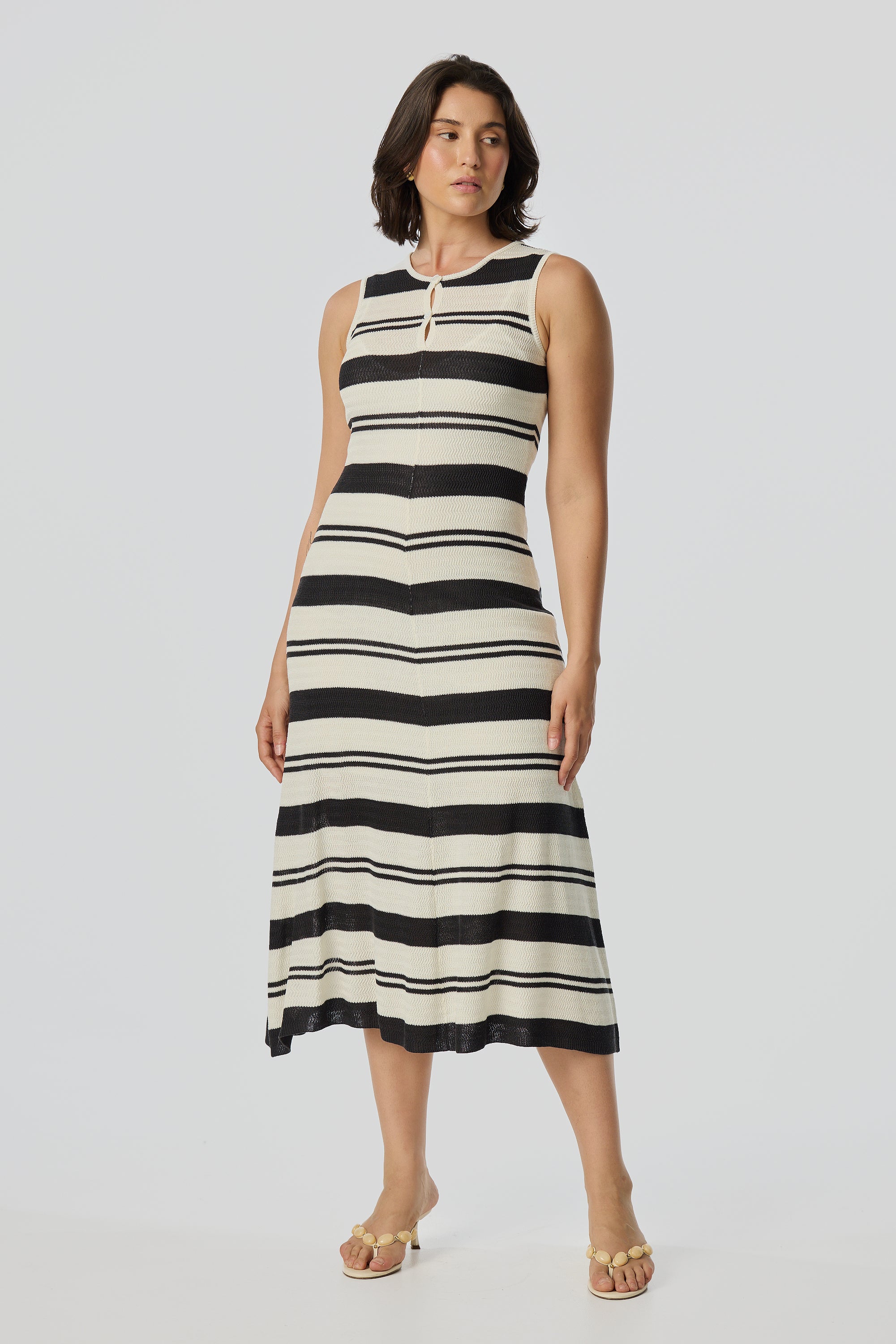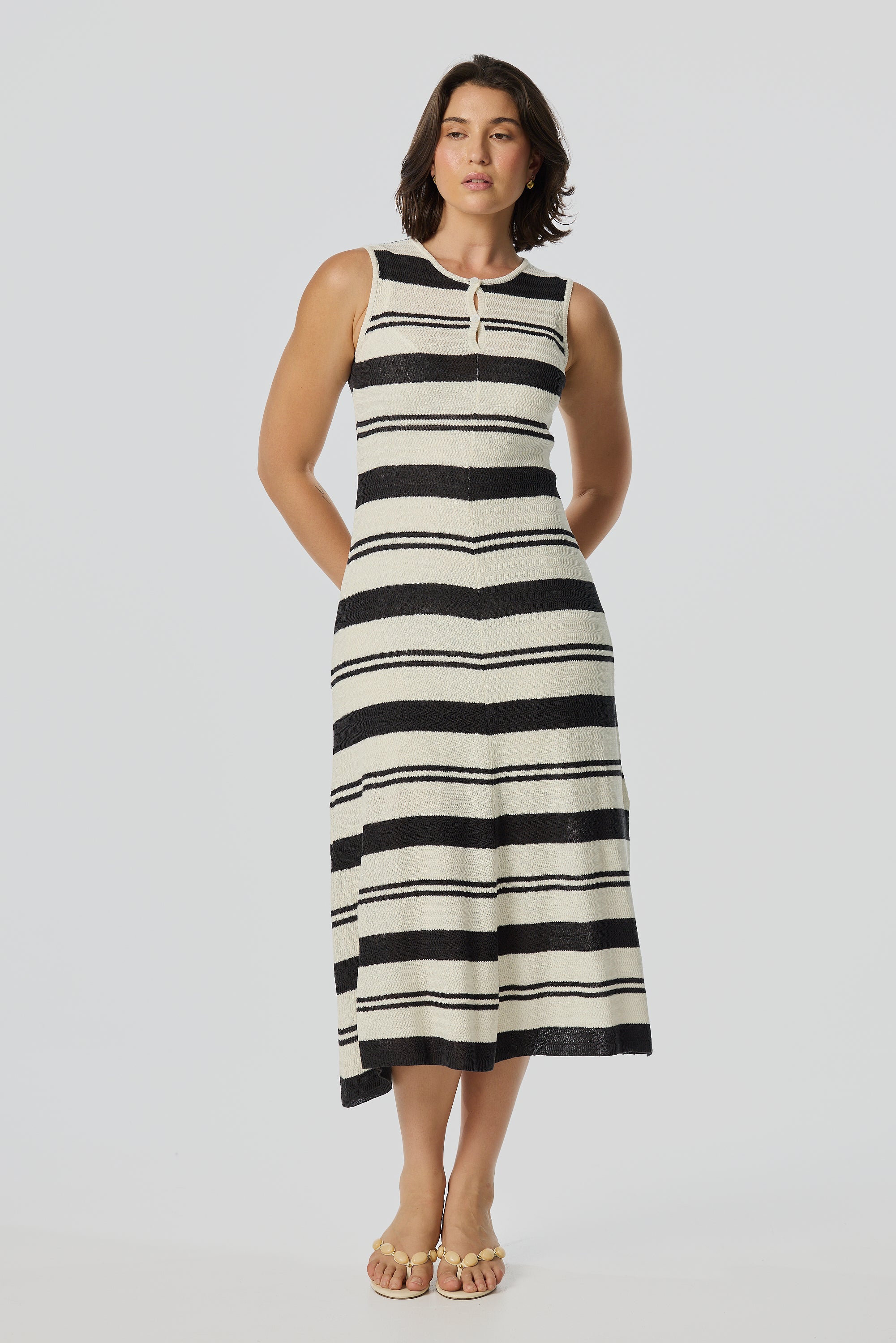 Effortlessly refined, the Crochet Sleeveless Dress in Ink Black Stripe is crafted from a softly textured mid-weight crochet knit. Designed with a round neckline and subtle keyhole detail, it falls into an easy A-line silhouette. Finished with a detachable slip for comfortable coverage, it’s a versatile dress suited to both everyday wear and occasion dressing.