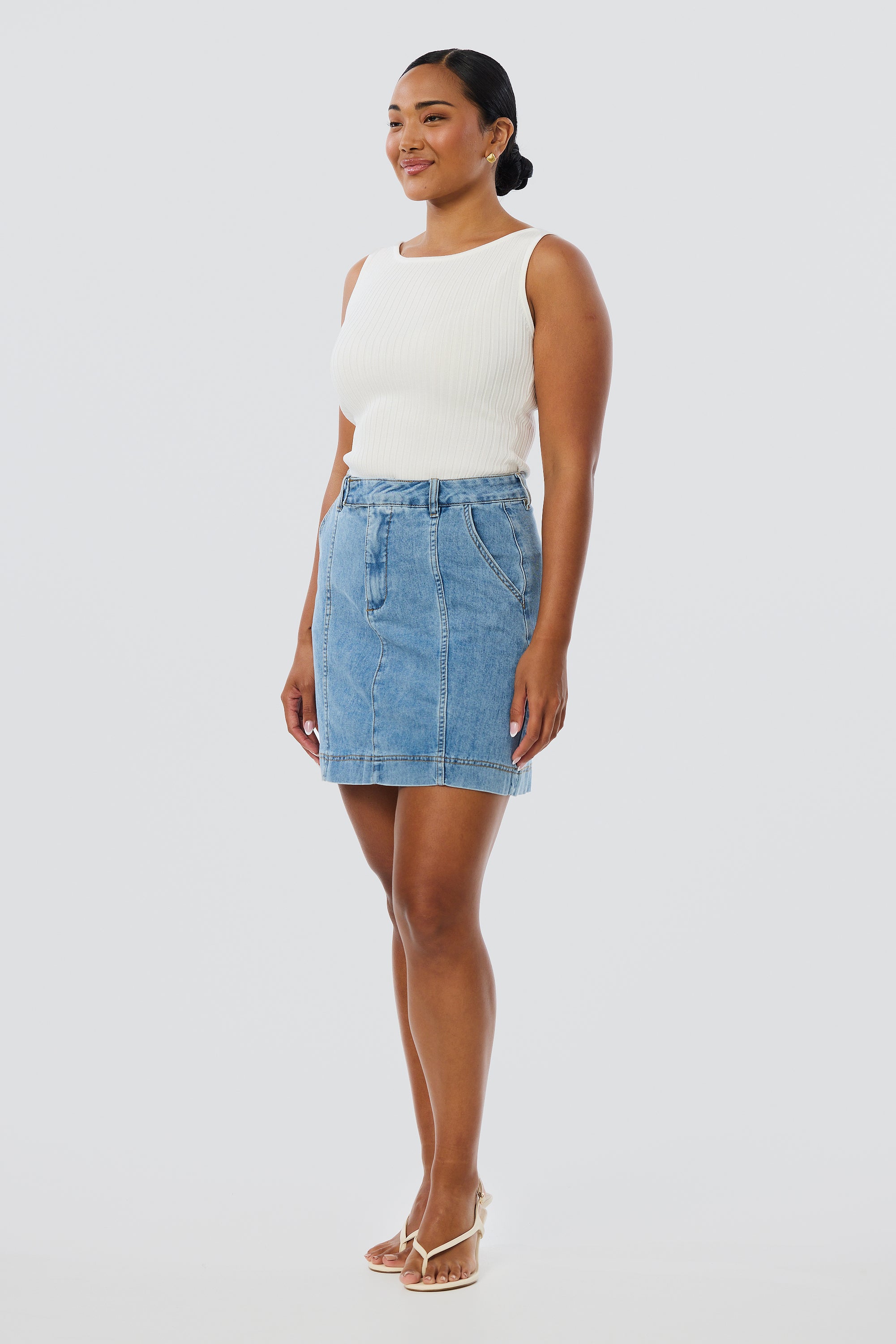 A staple with shape and ease, the Denim Panelled Mini Skirt in Mid Blue Wash features panelled seams, belt loops, and stretch denim for comfort in motion.