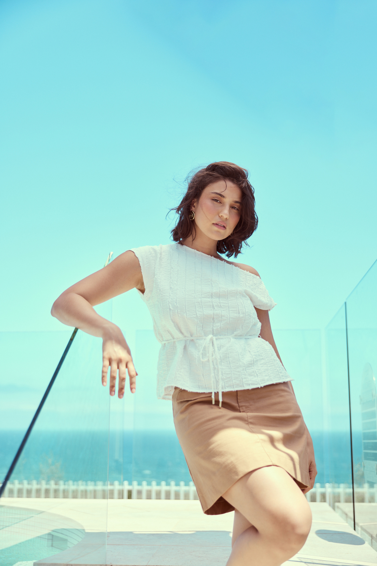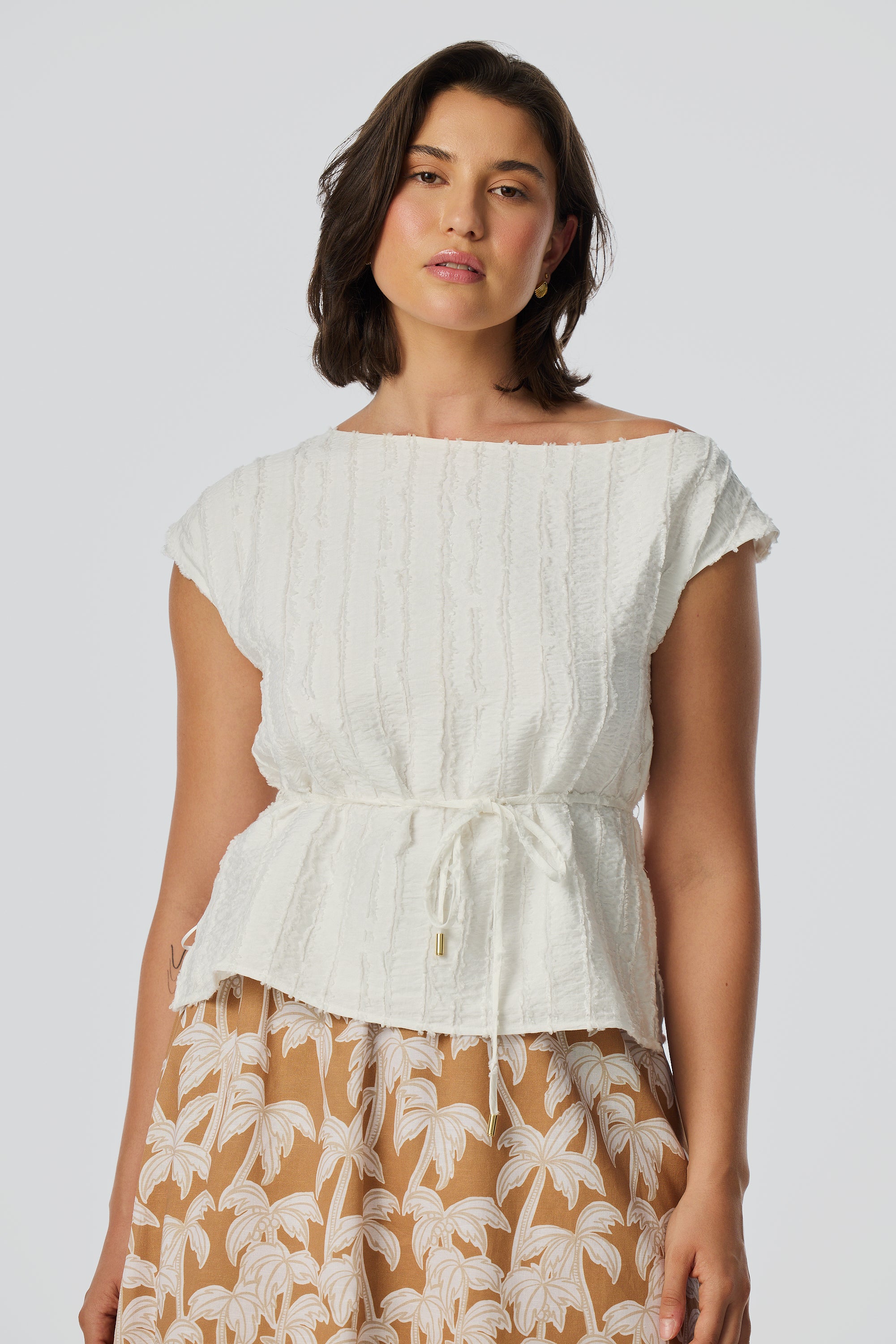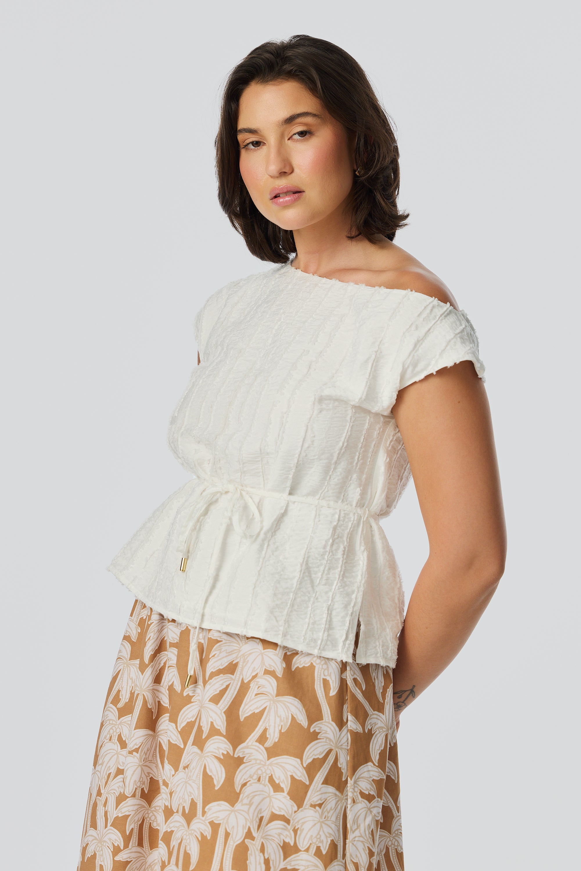 The Off-Shoulder Top in White features an asymmetric neckline and relaxed silhouette for a flattering, easy drape. Fully lined and crafted from a lightweight textured fabric, it’s finished with side hem splits and an adjustable waist tie.