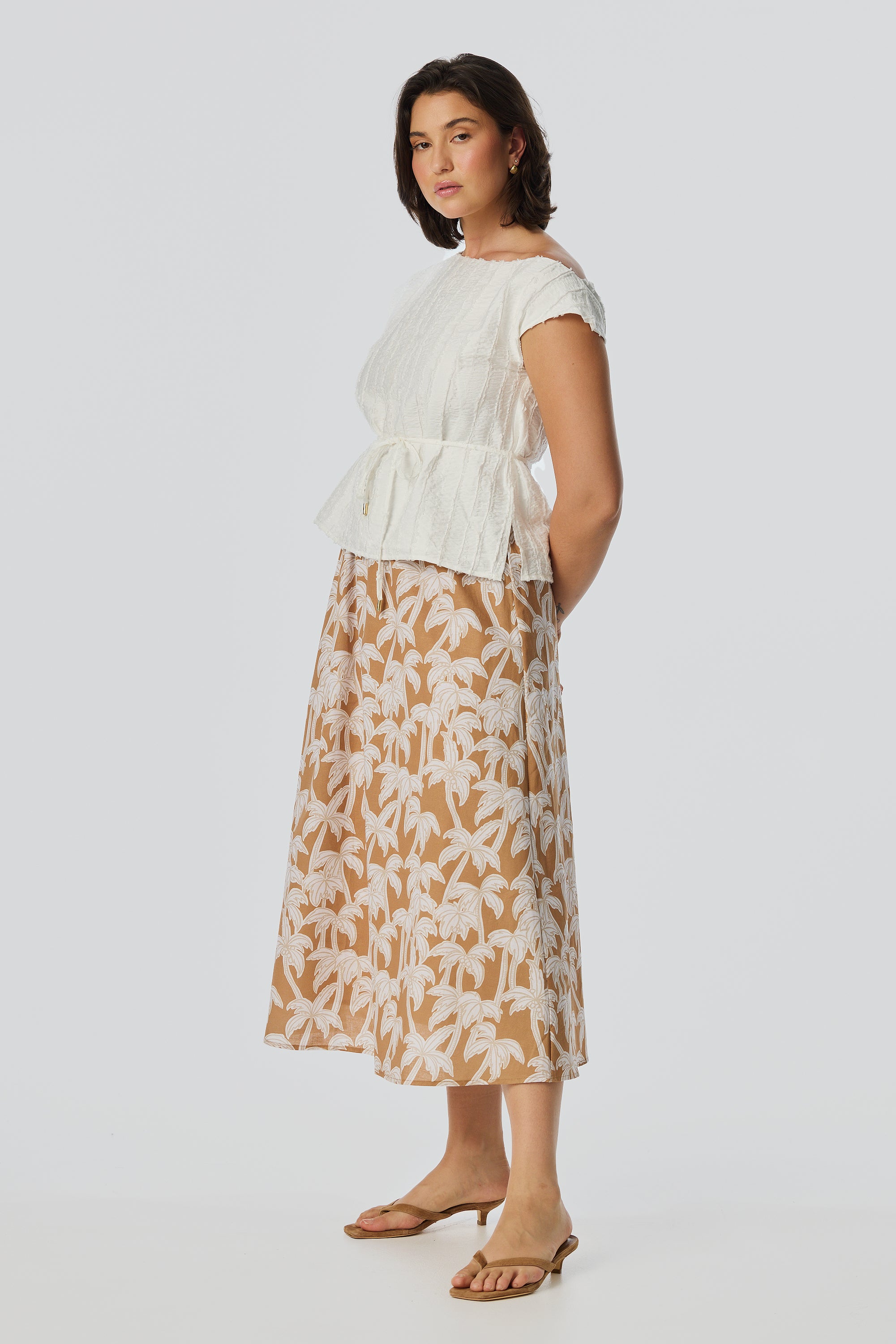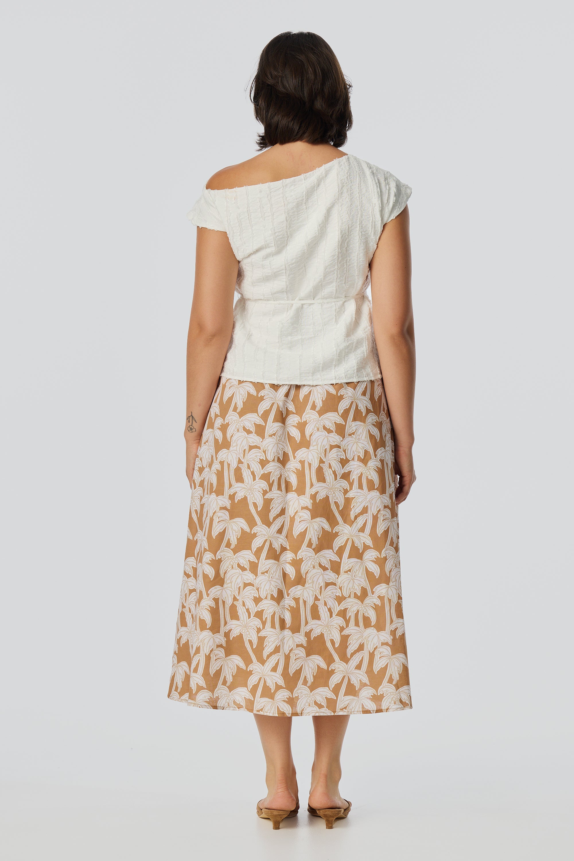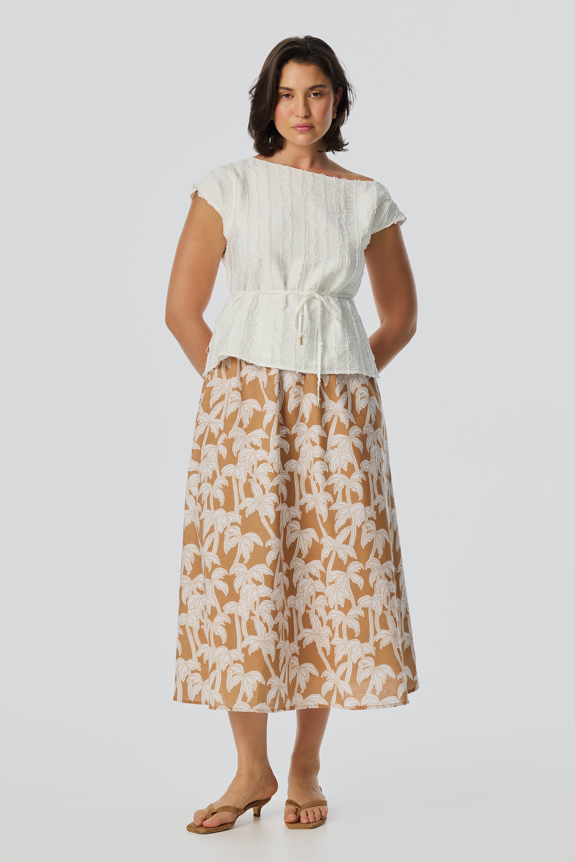 The Off-Shoulder Top in White features an asymmetric neckline and relaxed silhouette for a flattering, easy drape. Fully lined and crafted from a lightweight textured fabric, it’s finished with side hem splits and an adjustable waist tie.
