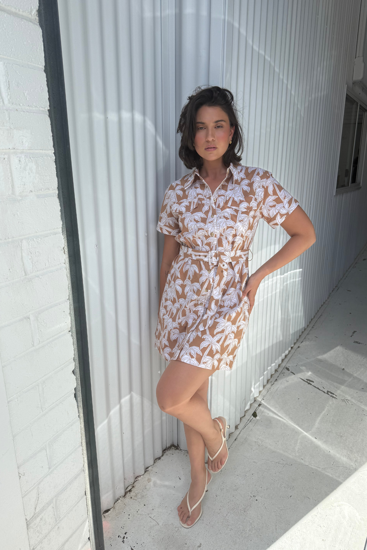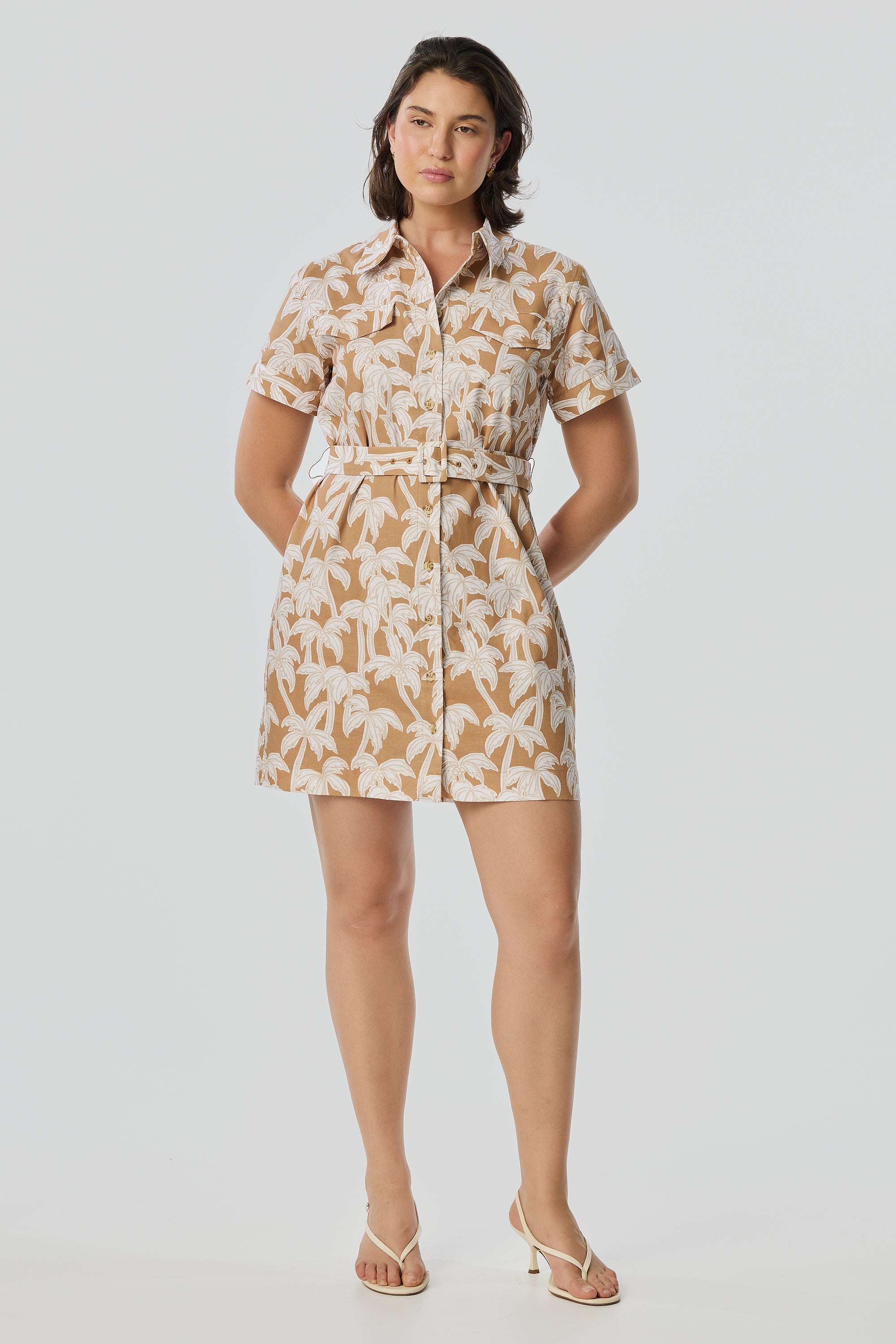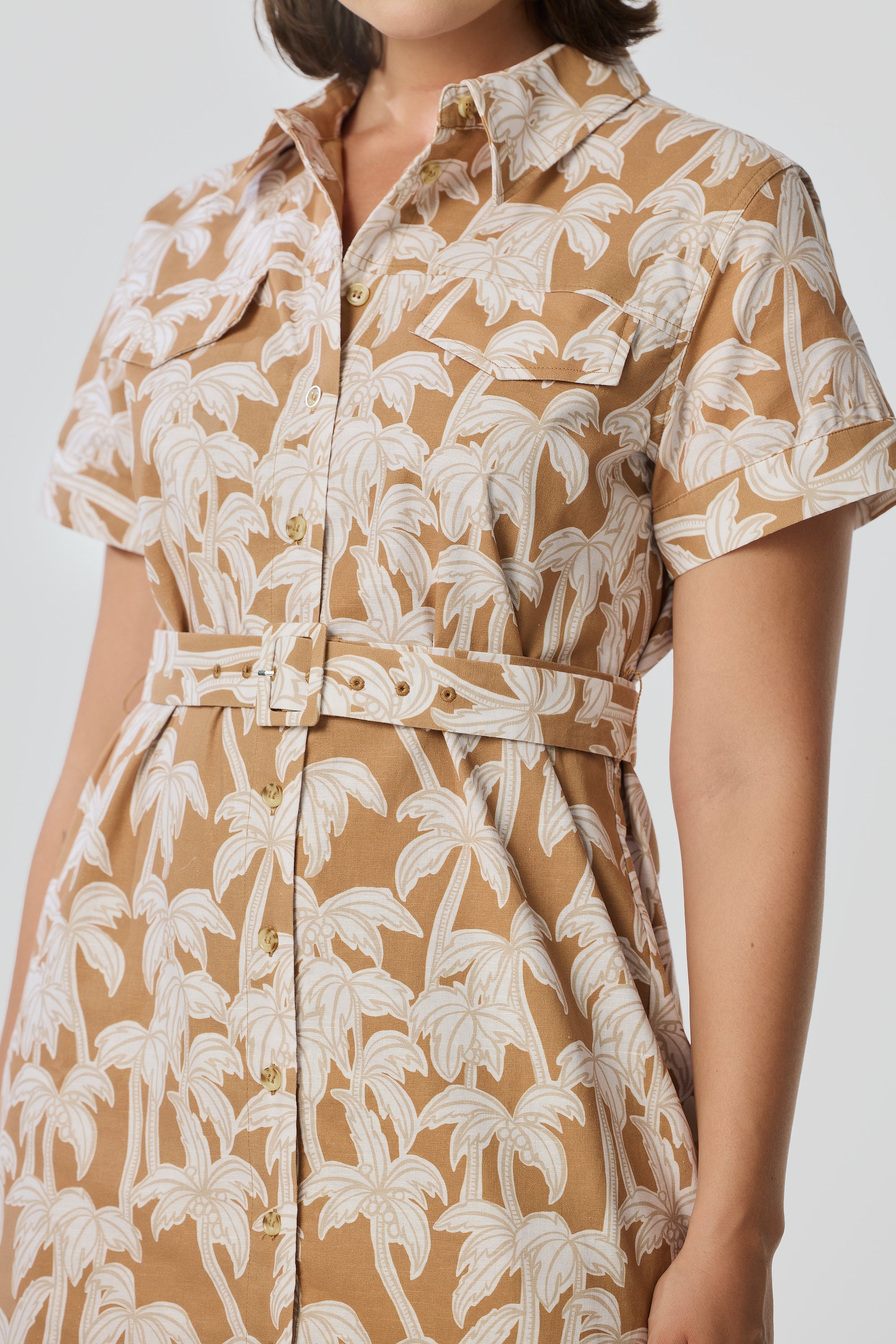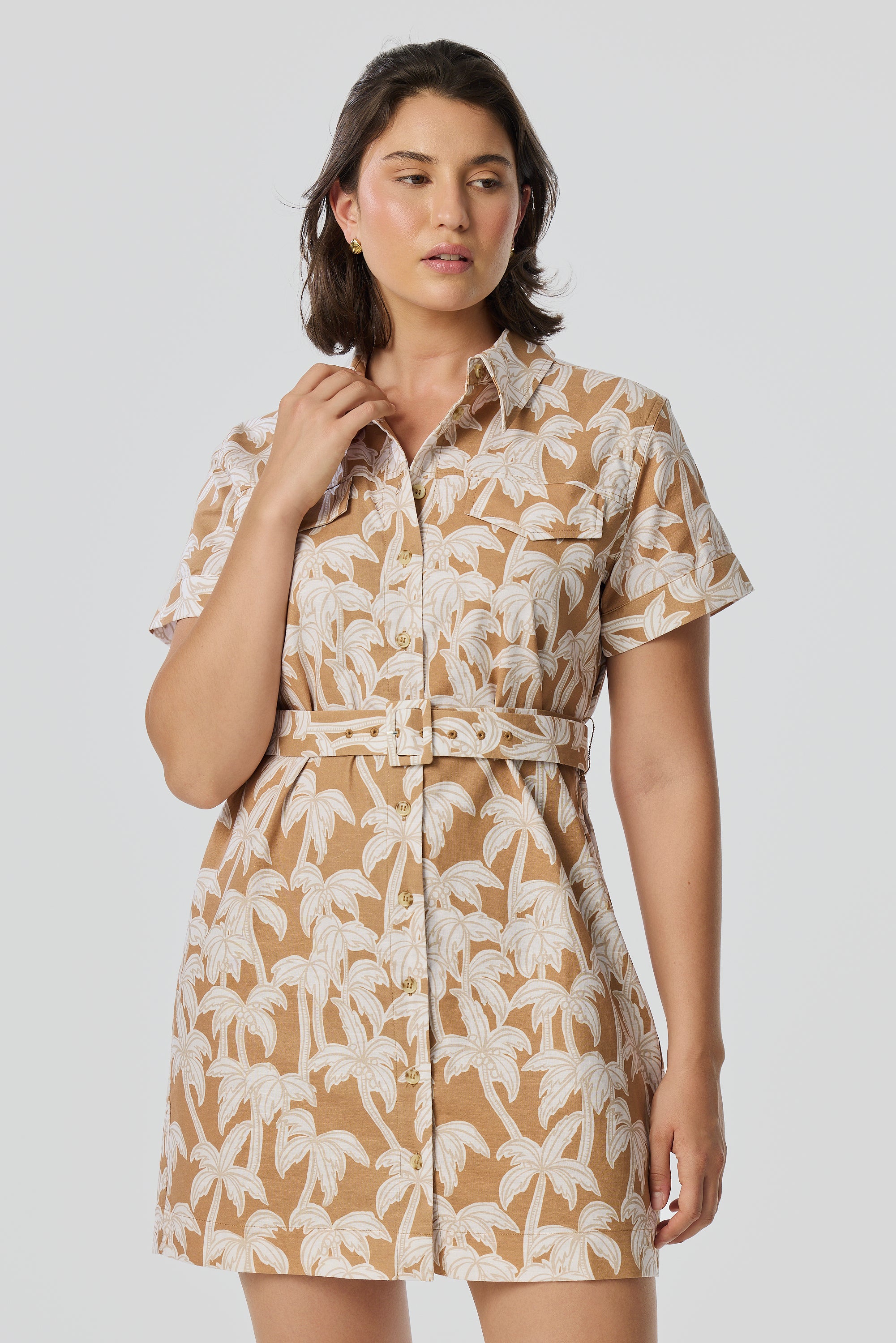 The perfect summer staple, the Pocket Shirt Mini Dress in Copper Palms features a relaxed fit and short sleeves for effortless everyday wear. Subtle topstitching and faux chest pockets add refined detail, while the adjustable belt lets you define the waist and elevate your look with ease.