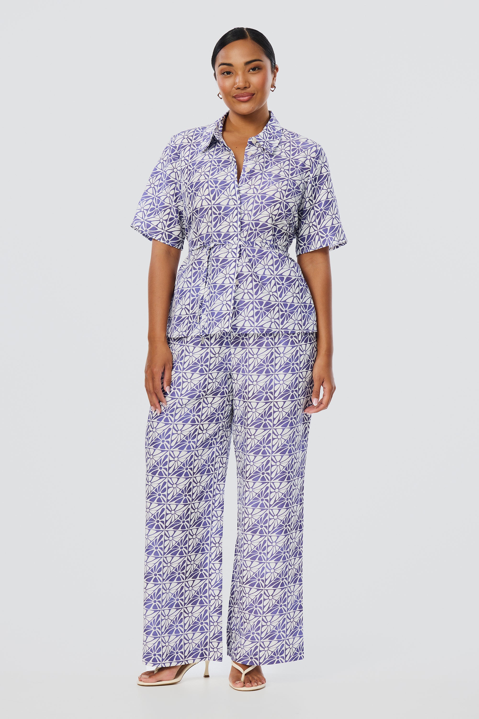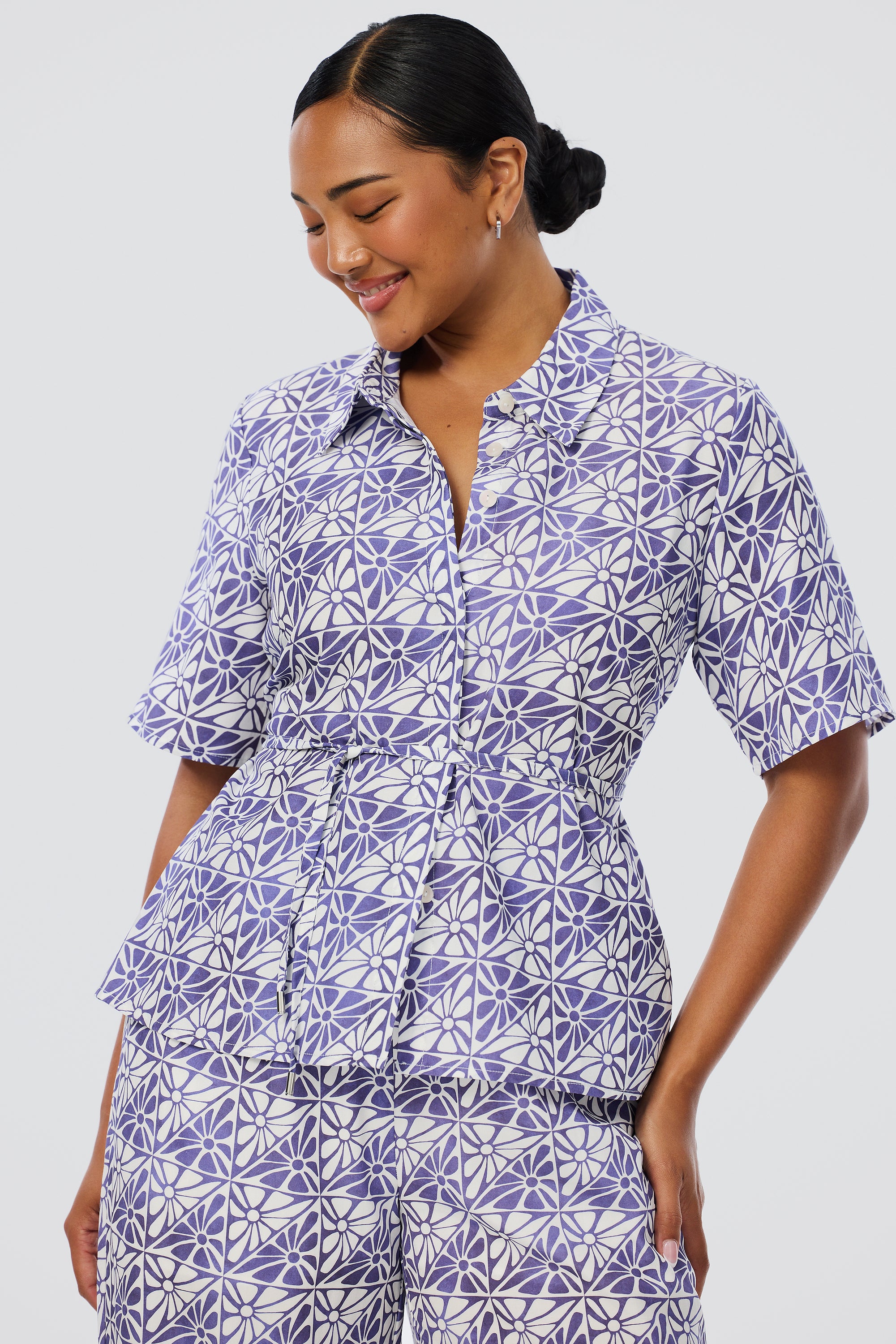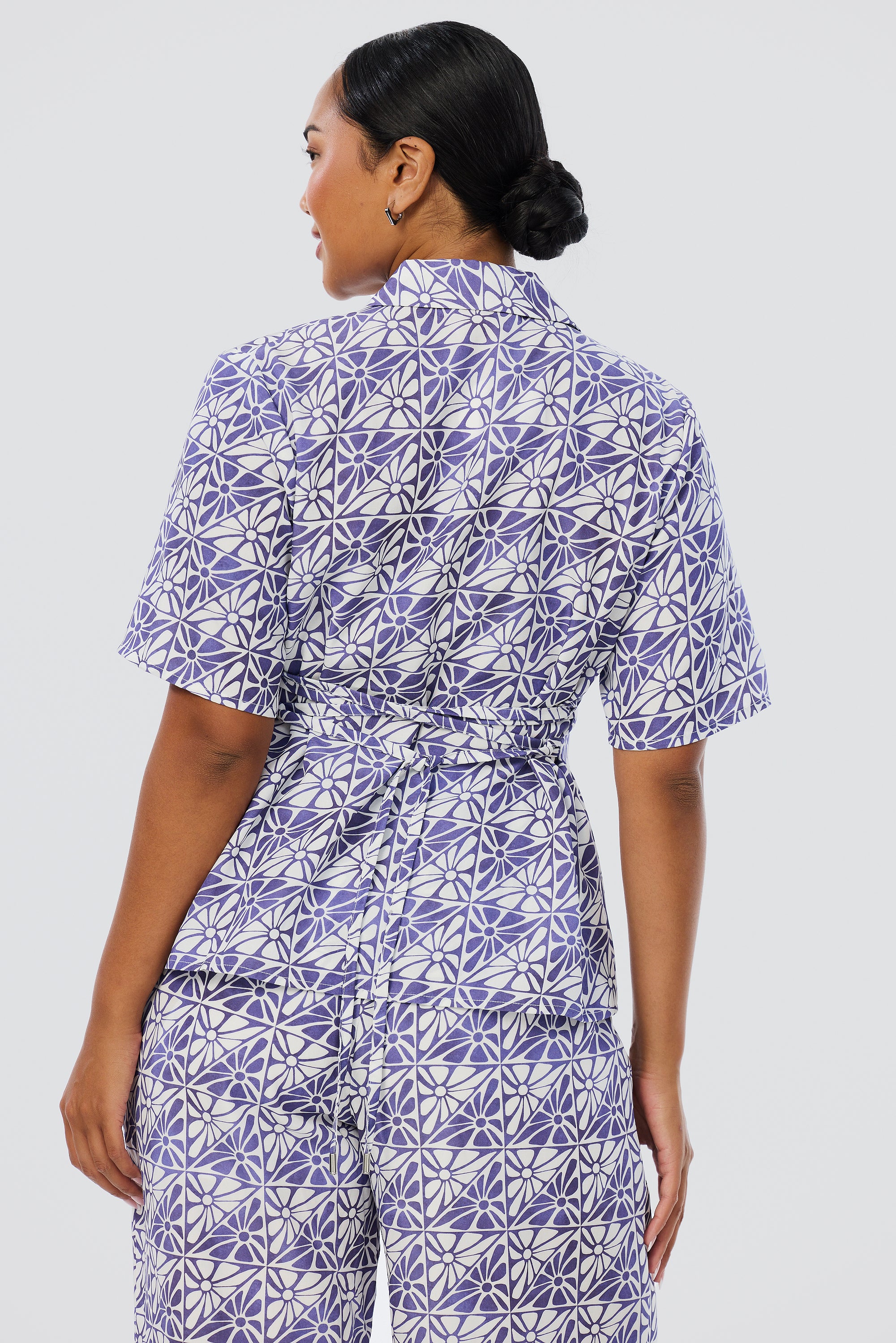 Lightweight and breathable, the Short Sleeve Shirt in Blue Mosaic brings polish to everyday wear. Designed with a flattering tie at the back waist, it features a custom Serafina print in a breezy silhouette.