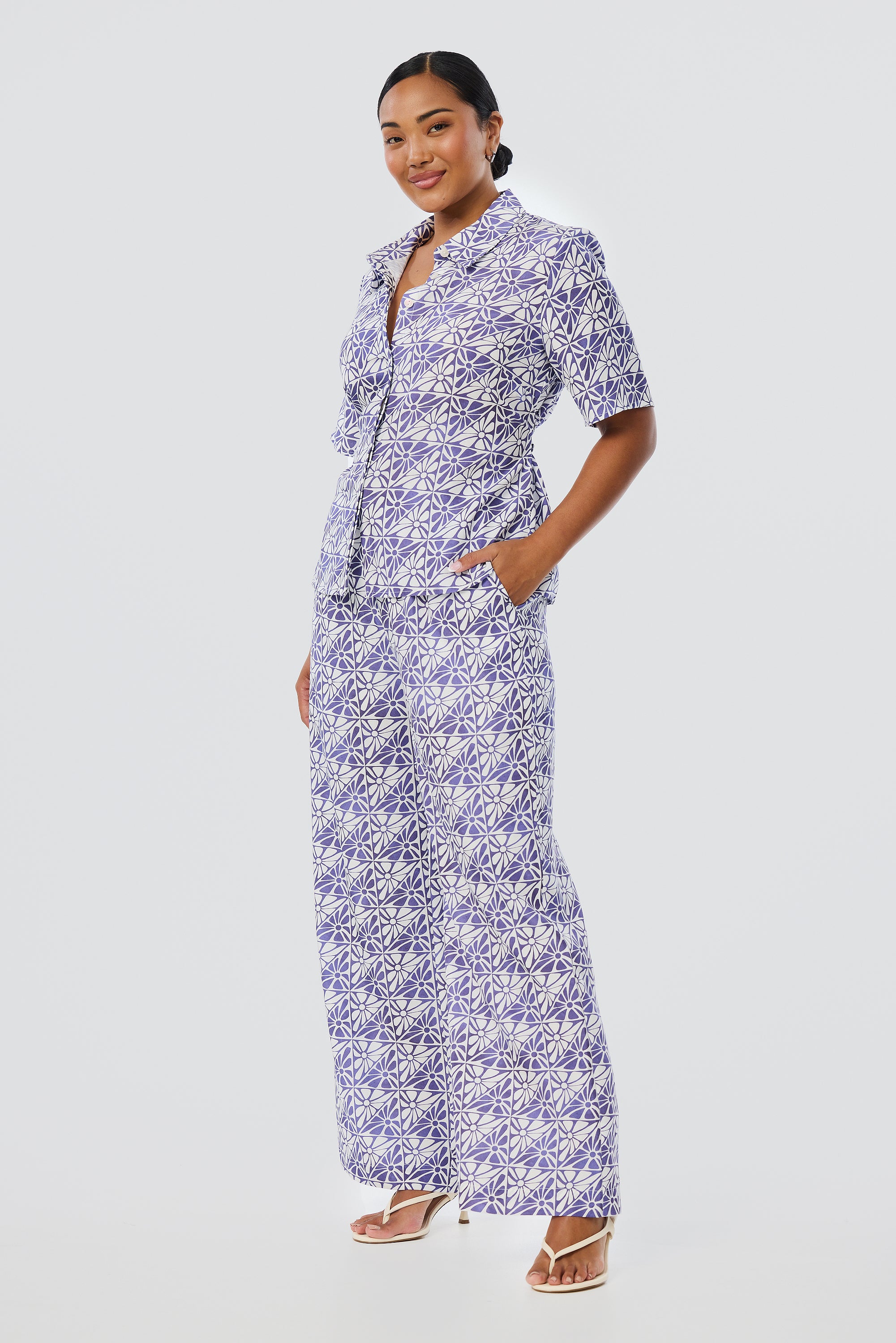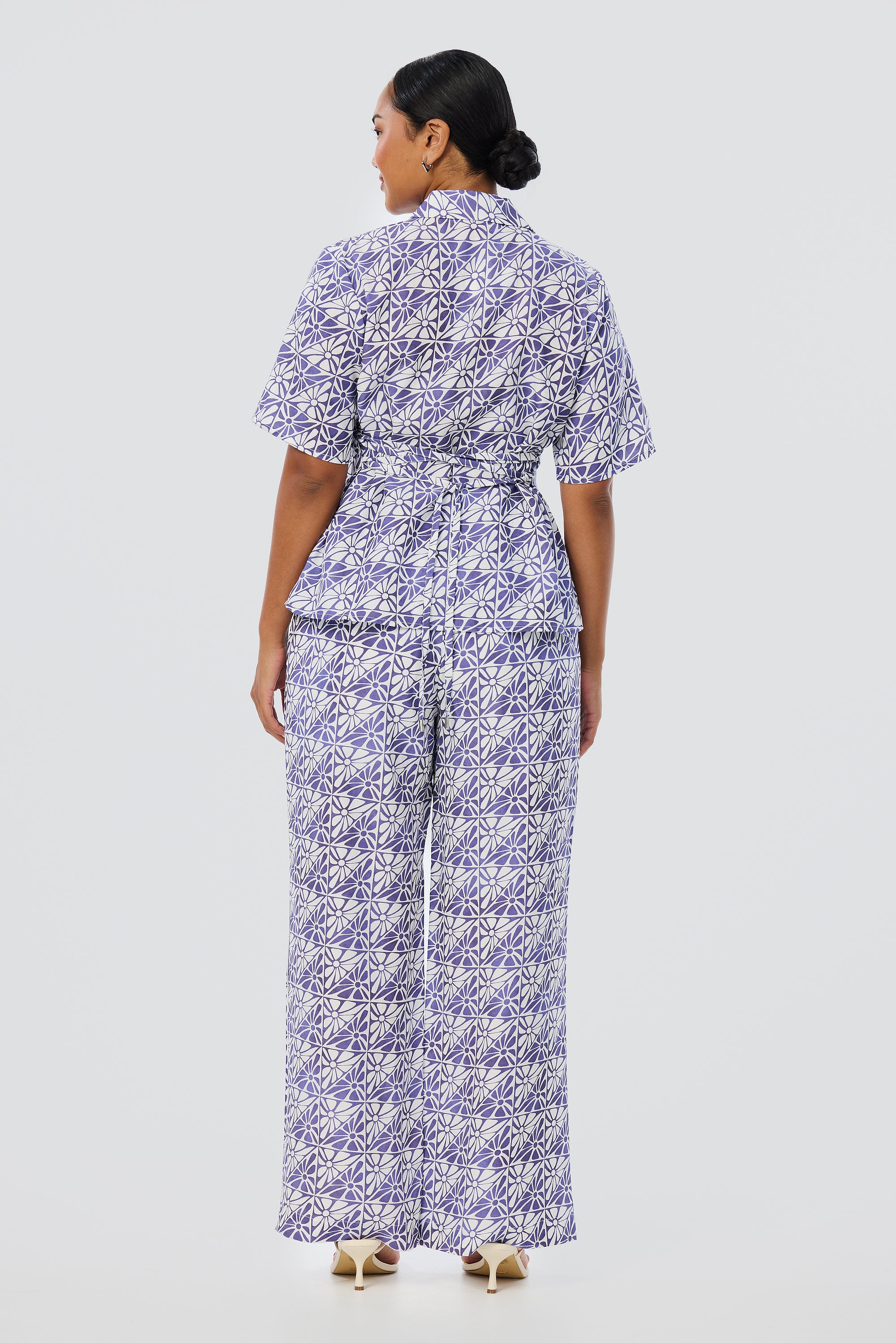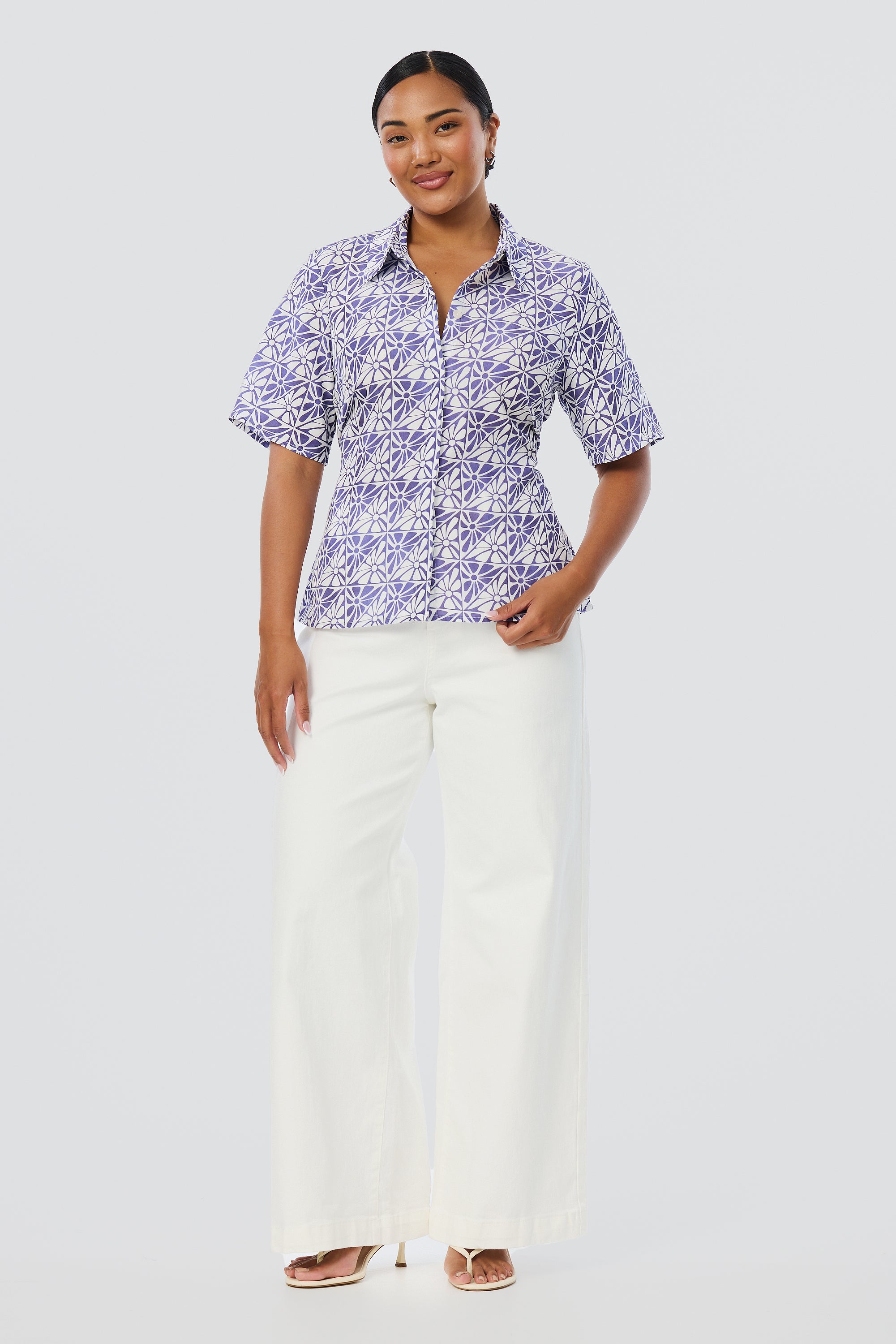 Lightweight and breathable, the Short Sleeve Shirt in Blue Mosaic brings polish to everyday wear. Designed with a flattering tie at the back waist, it features a custom Serafina print in a breezy silhouette.