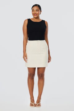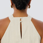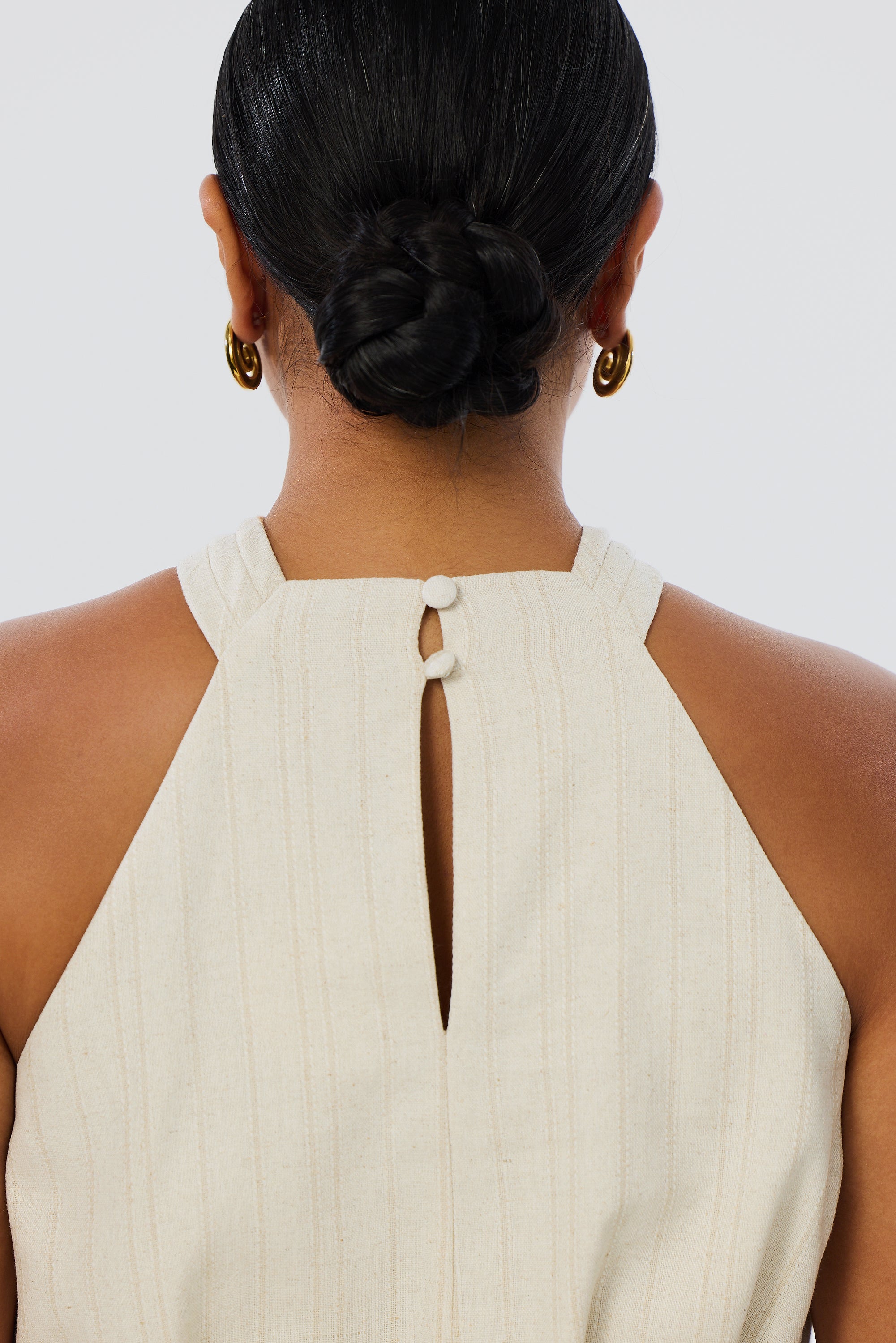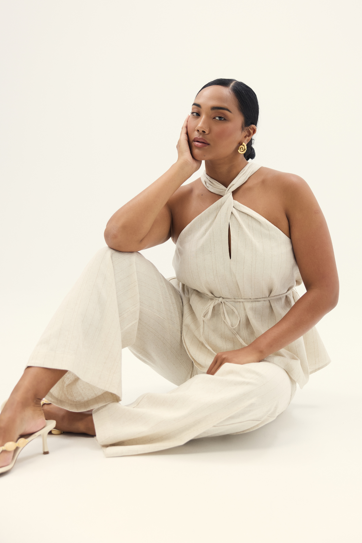 The Twist Neck Halter Top in Oatmeal Stripe is a structured yet airy piece featuring a twisted neckline and flattering A-line silhouette. The included tie belt defines the waistline while the cotton lining ensures all-day comfort.