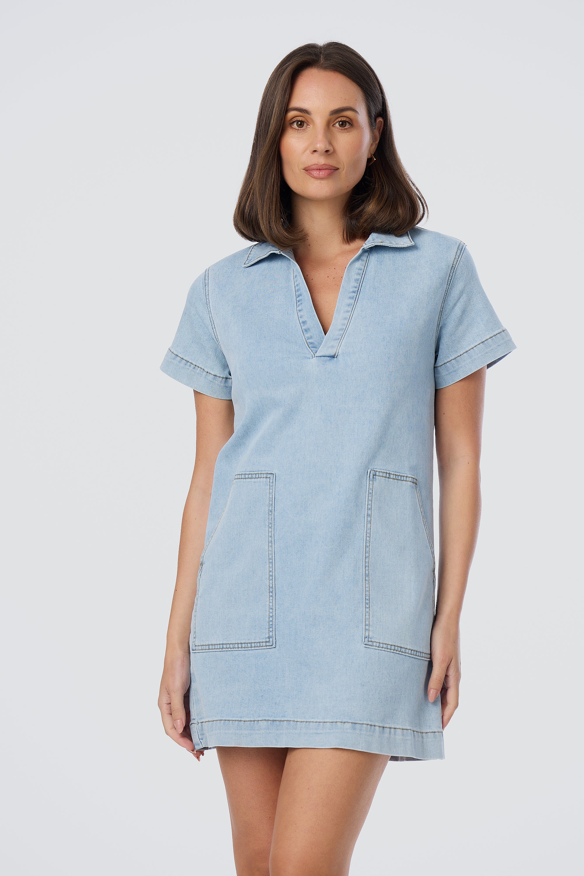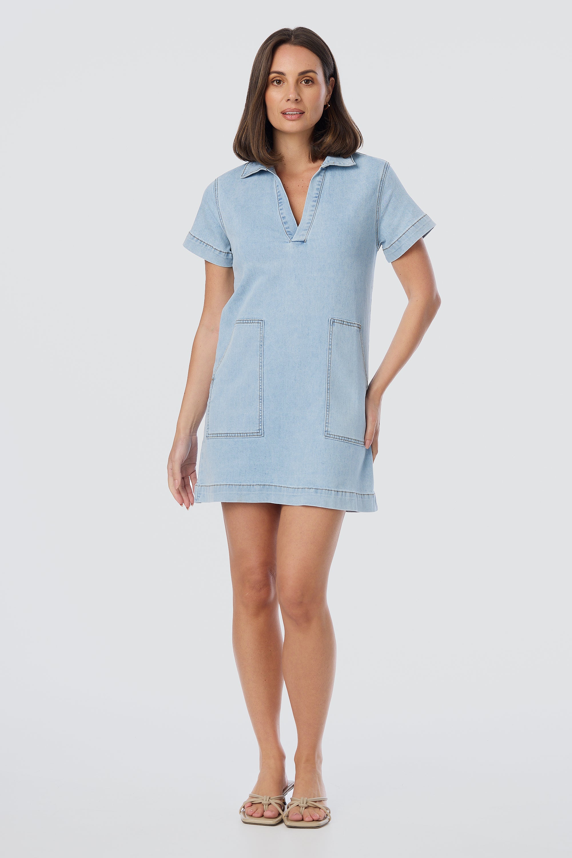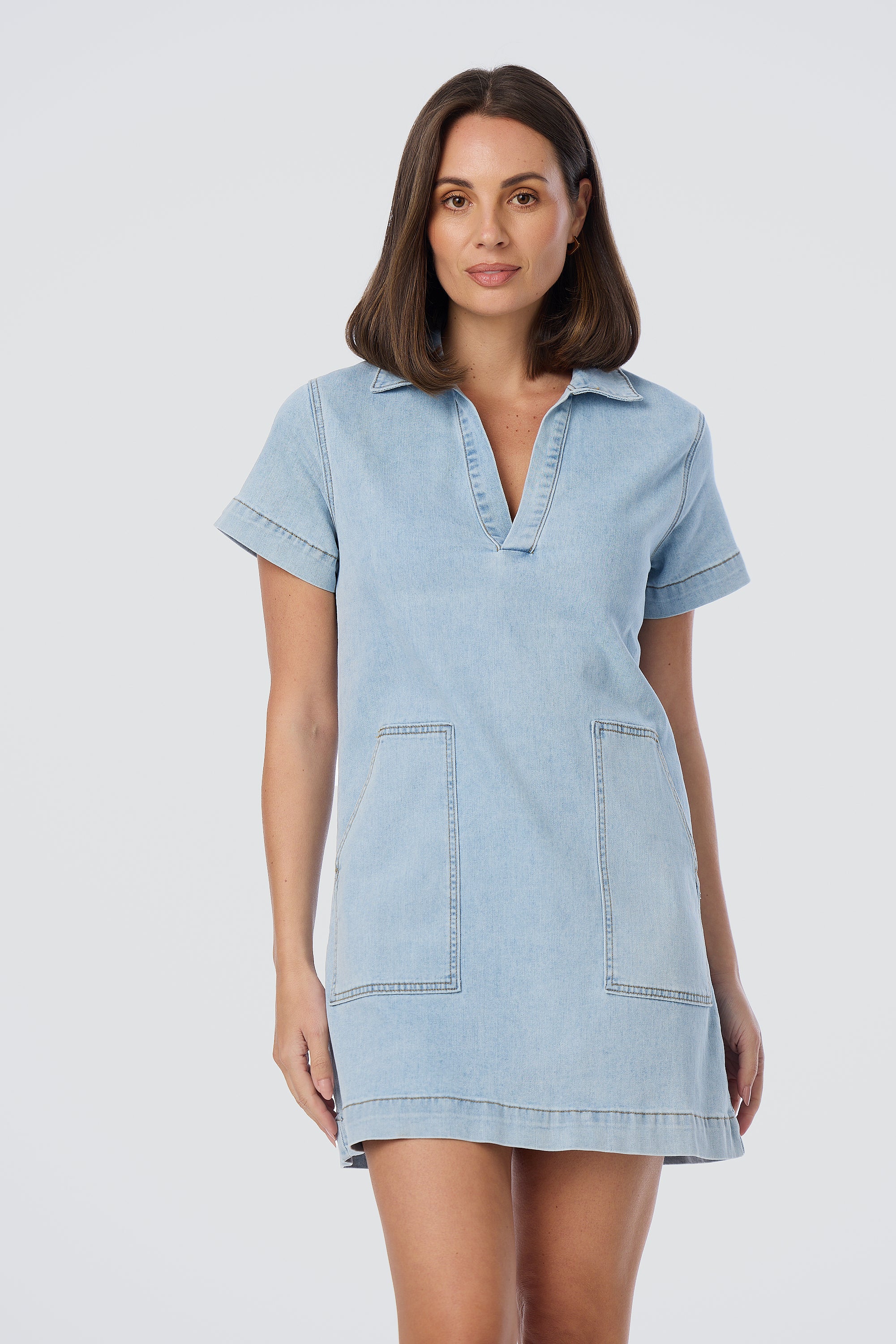 Relaxed yet elevated, the Denim Short Sleeve Mini Dress in Light Blue Wash combines soft structure with casual ease. With a collar, v-neckline, and oversized patch pockets, it's an effortless all-in-one outfit in a comfortable stretch denim.