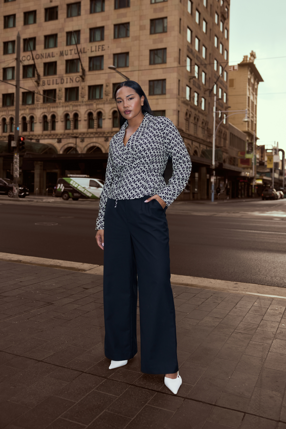 The Long Sleeve Wrap Shirt in Aubergine Geo features a collared wrap neckline with a tie closure for a flattering, adjustable fit. Made in an exclusive Serafina print, it has full-length sleeves with functional cuff buttons and a regular-fit silhouette for effortless, polished styling.