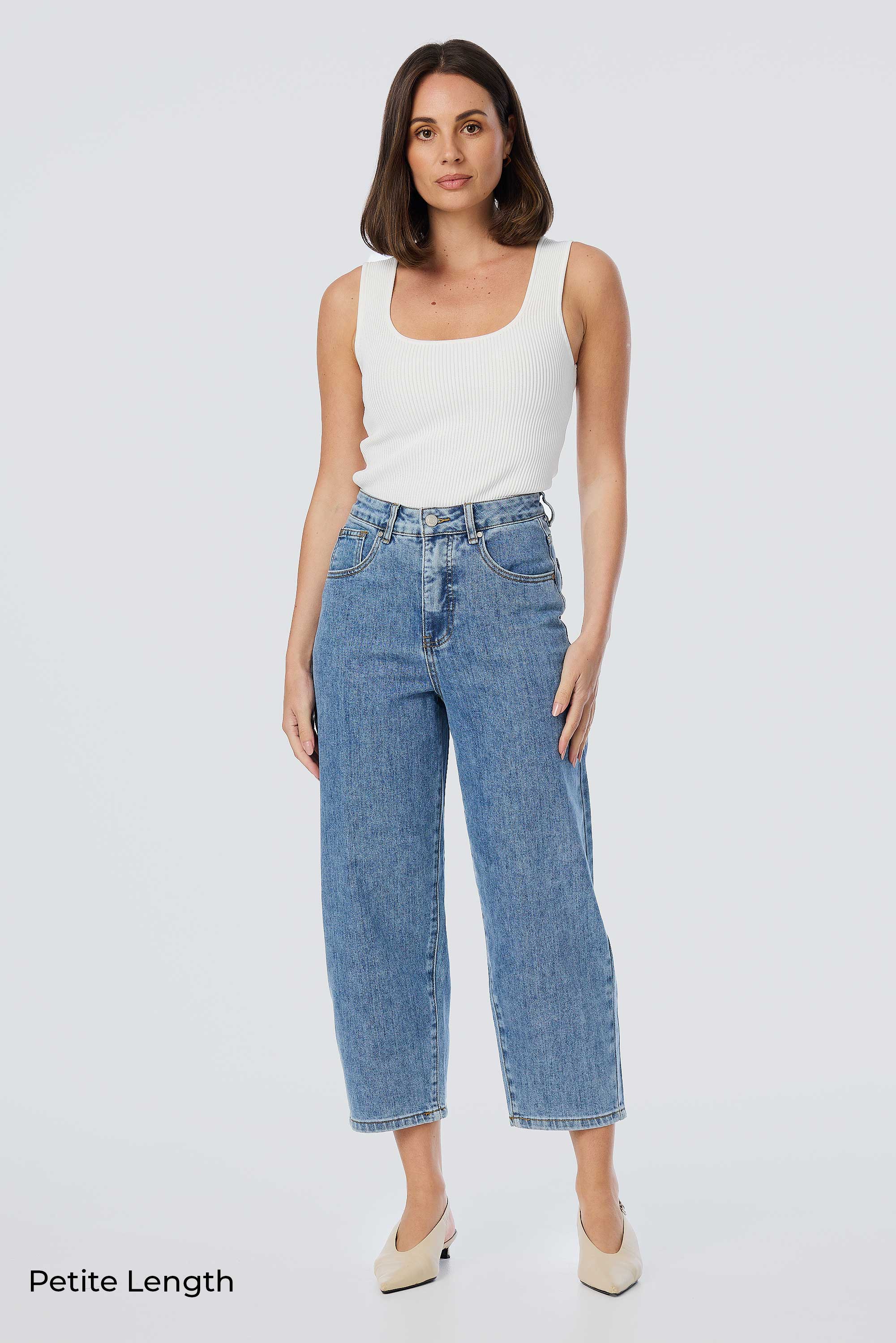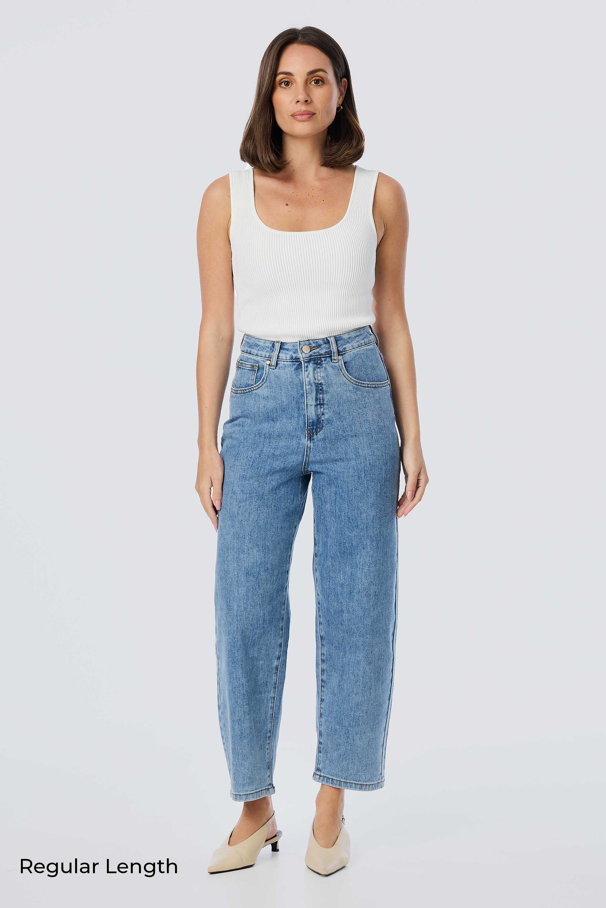 Experience our Signature Barrel Leg Jeans in Mid Blue Wash, crafted for timeless style and effortless ease, tailored to every shape and size. With a touch of stretch for comfort and premium fabric that holds its form, this is denim designed to endure. Find your perfect fit with our two lengths - regular and petite.