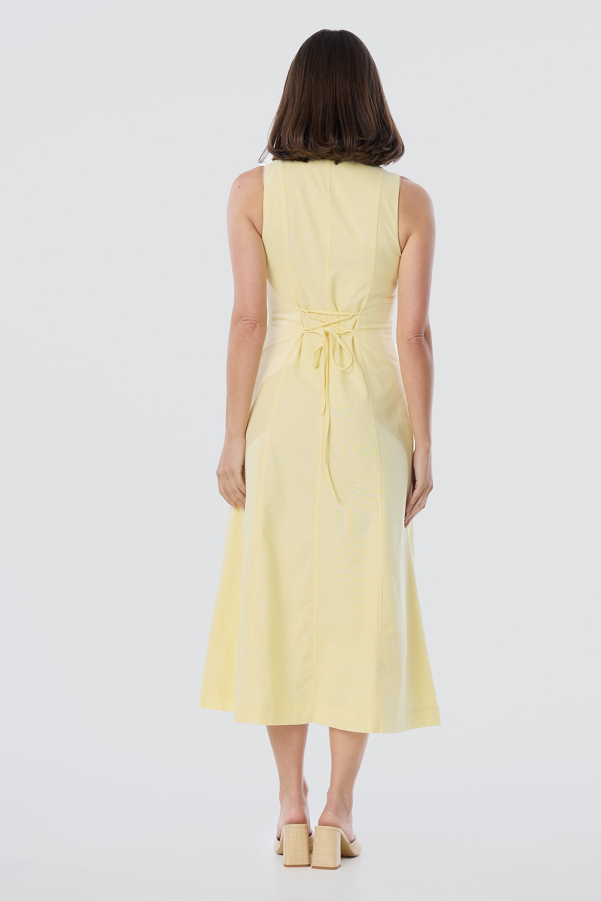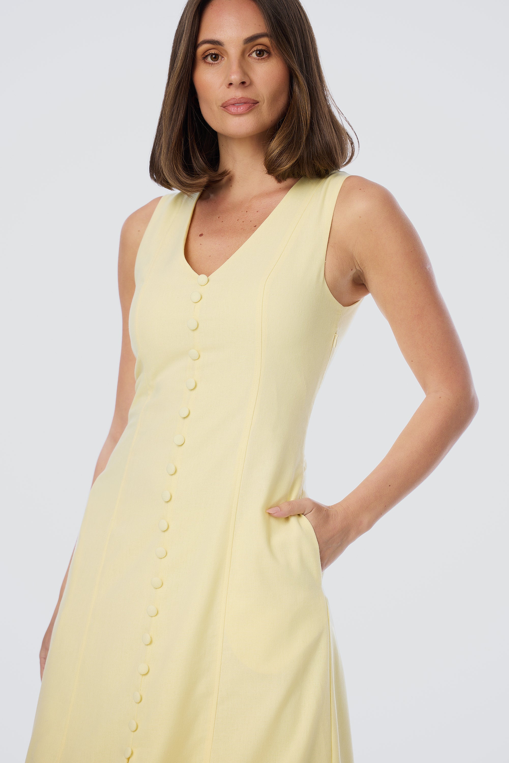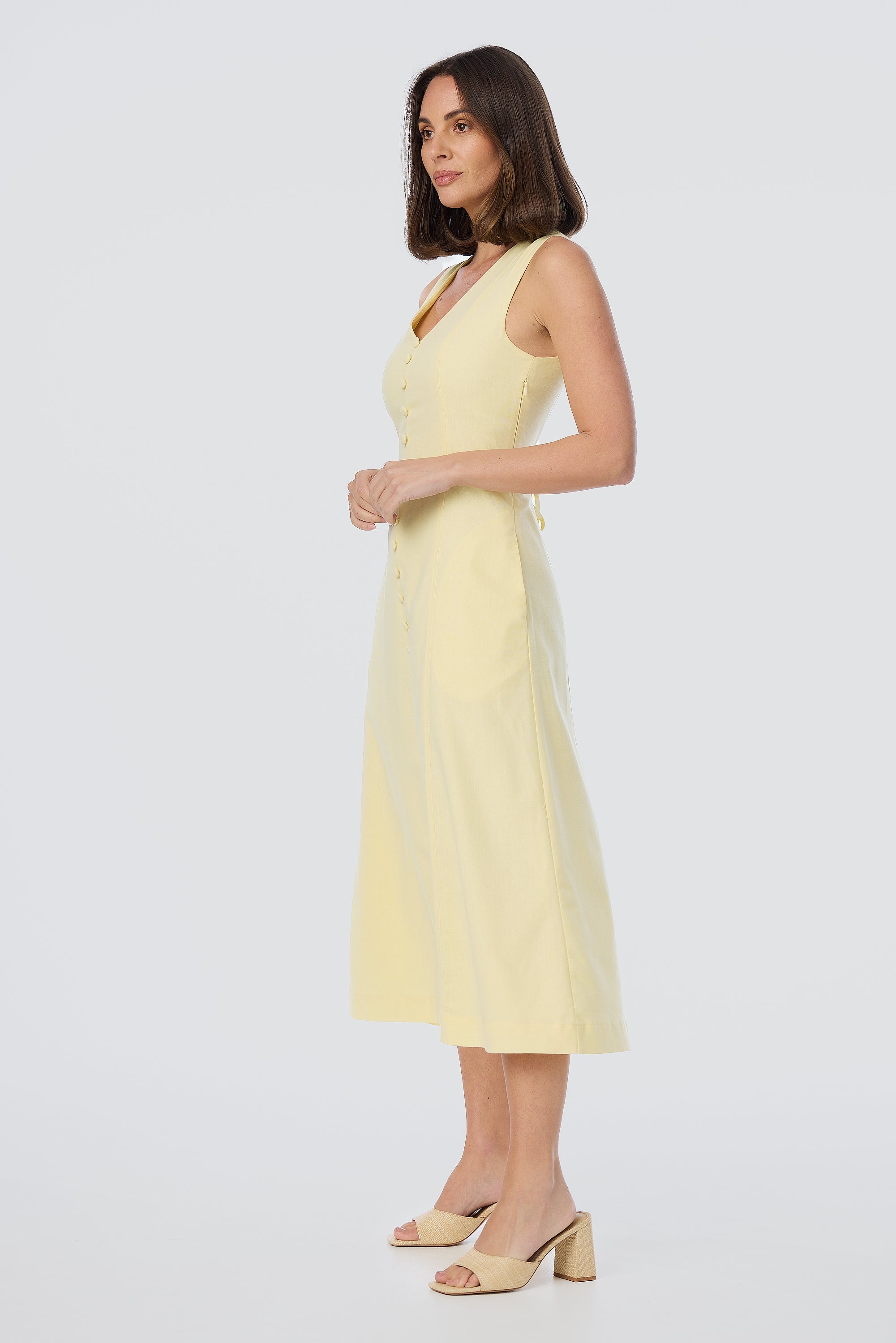 Refined and feminine, the Sleeveless Buttoned Dress in Panna Cotta balances structured tailoring with soft movement. The adjustable back waist tie enhances the silhouette, while full lining provides all-day comfort.