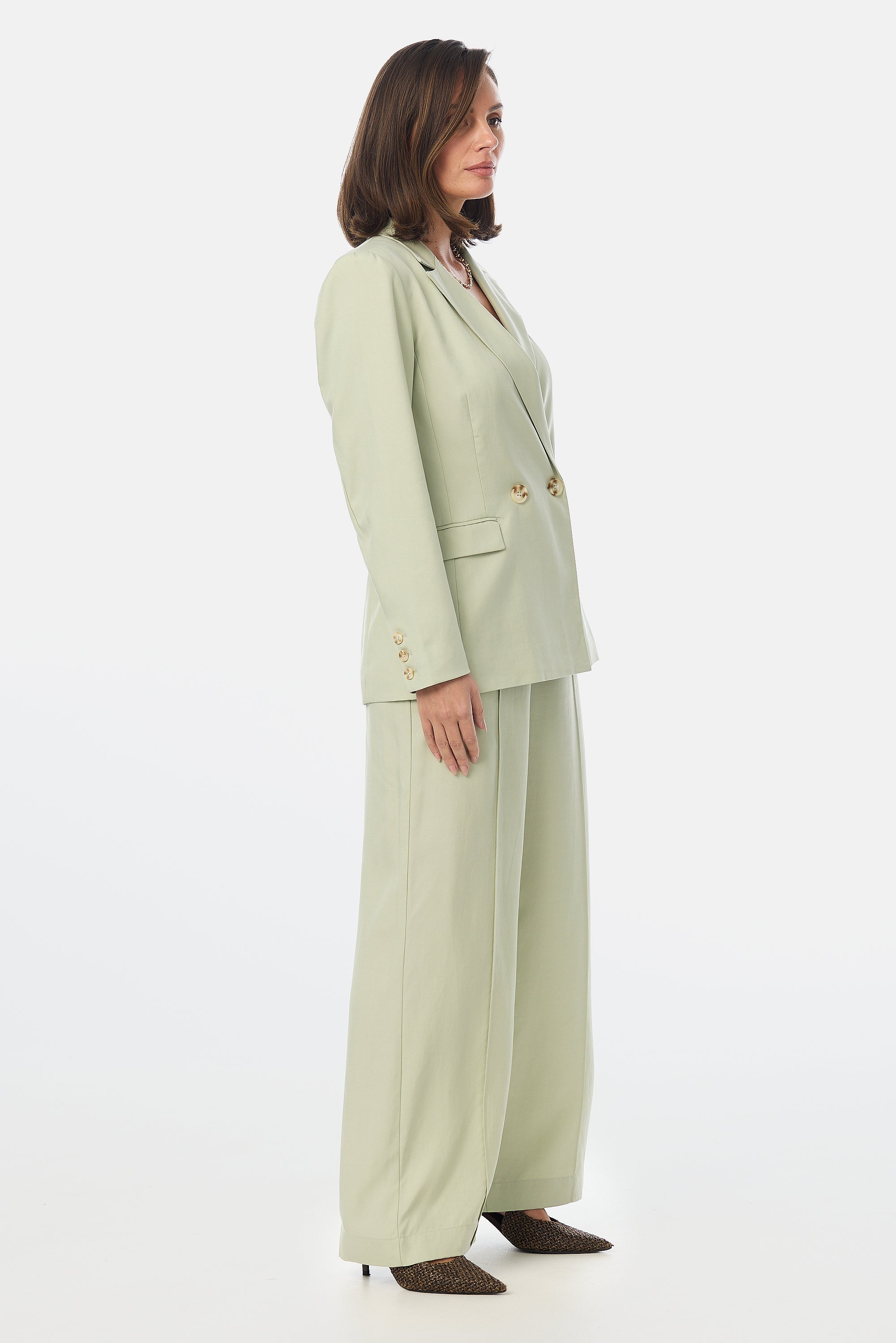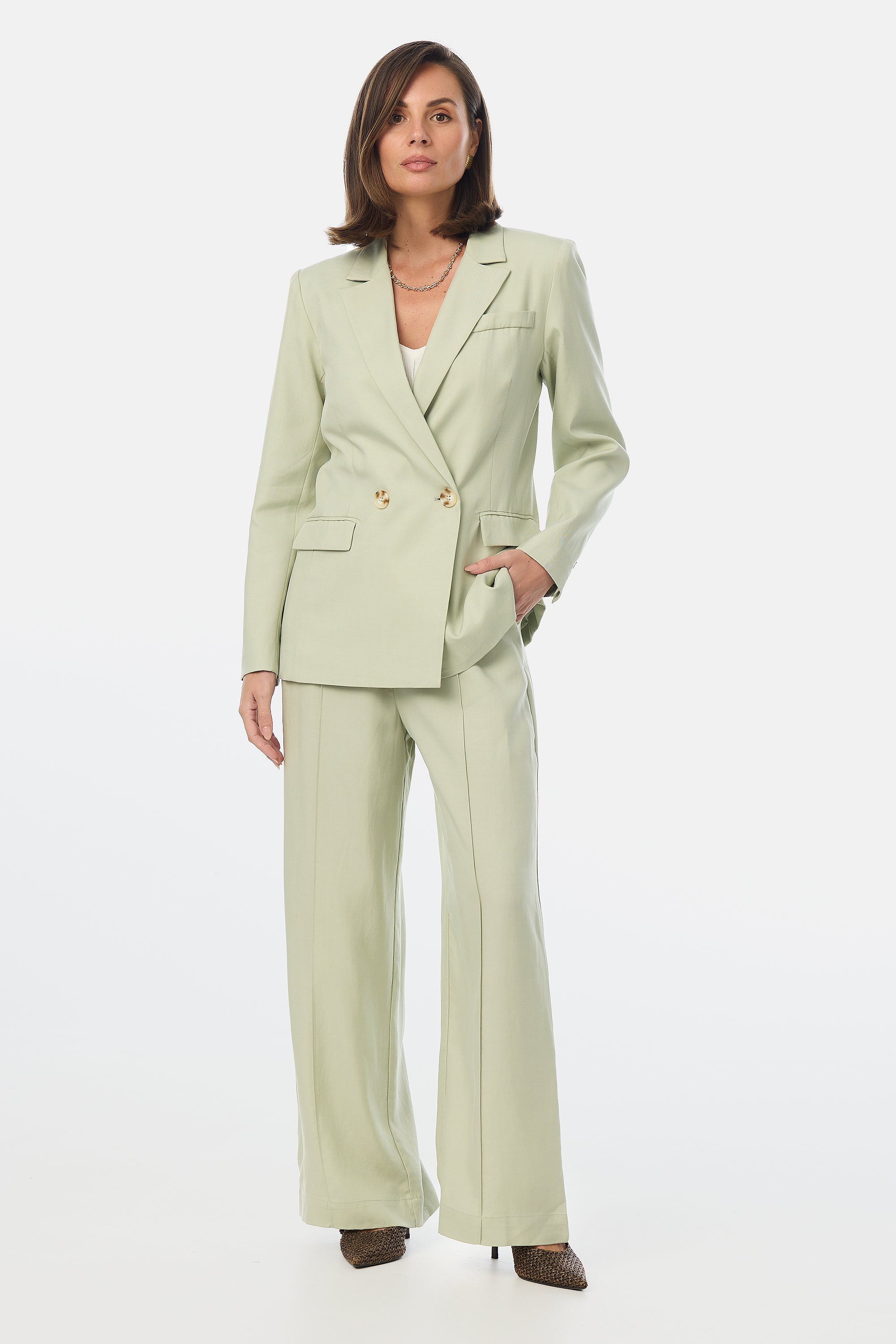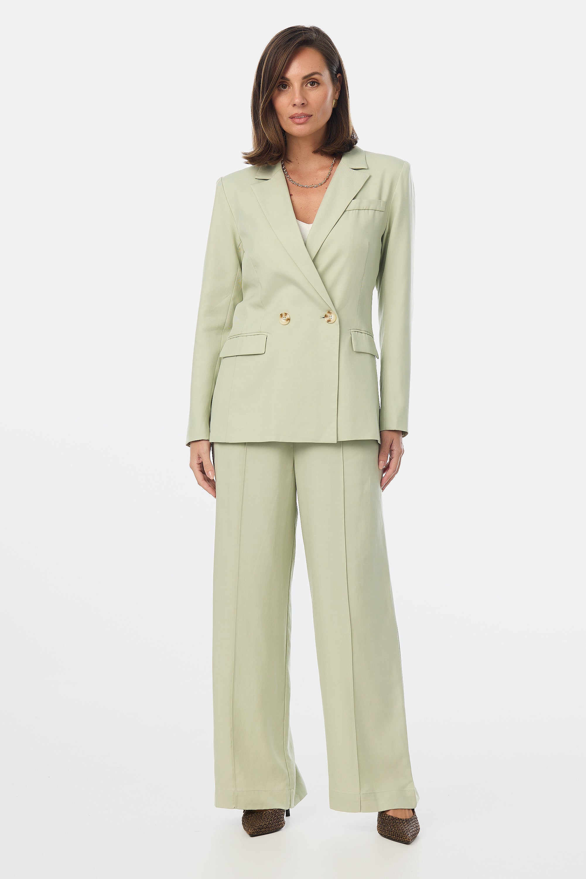 Designed to move with you, the Tailored Pintuck Pants in Pistachio feature a wide-leg silhouette and sharp front pintucks that elongate the leg. With side elastic panels for extra comfort, these suiting trousers are perfect for pairing with the matching Tailored Double Breasted Blazer or a tucked-in knit.