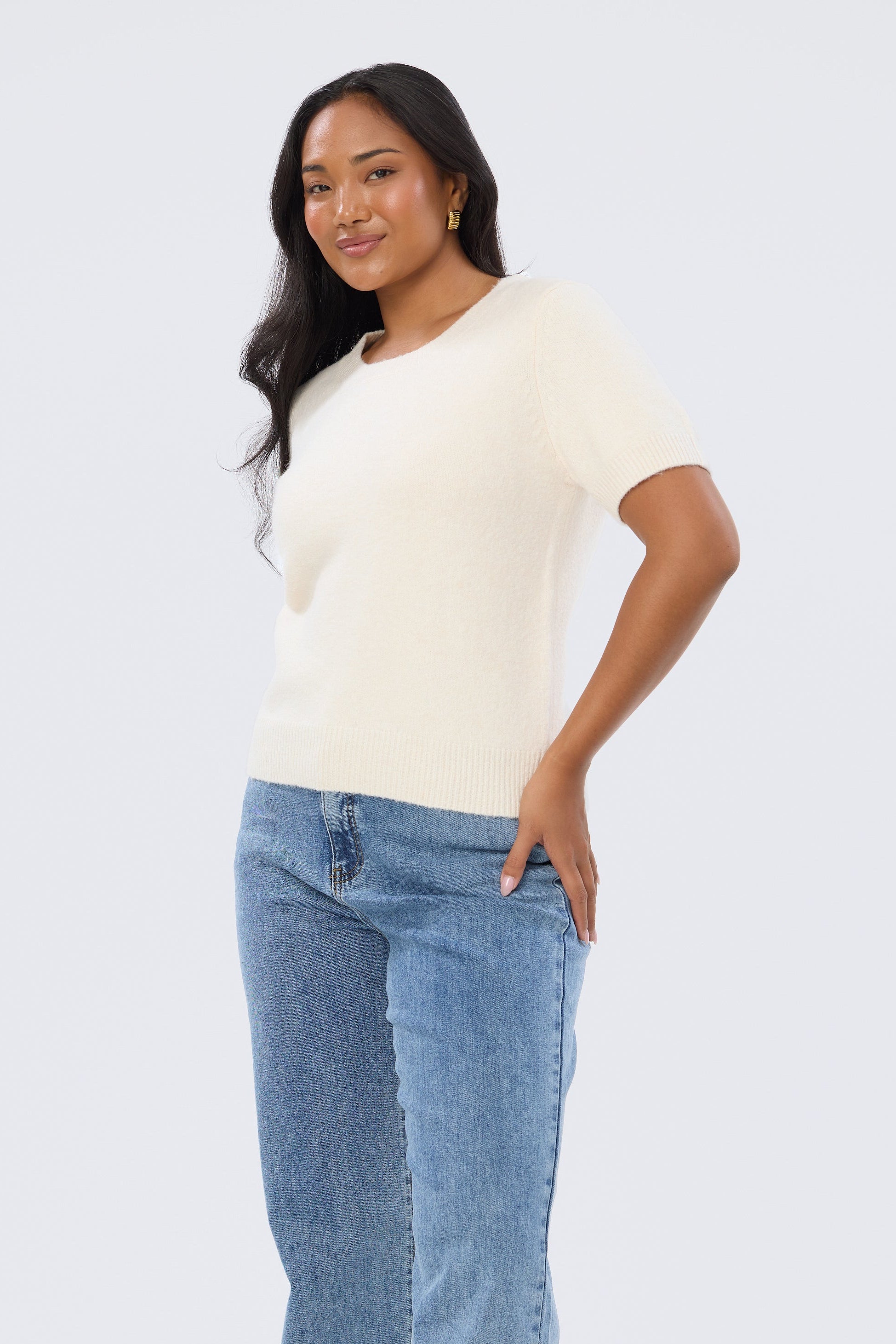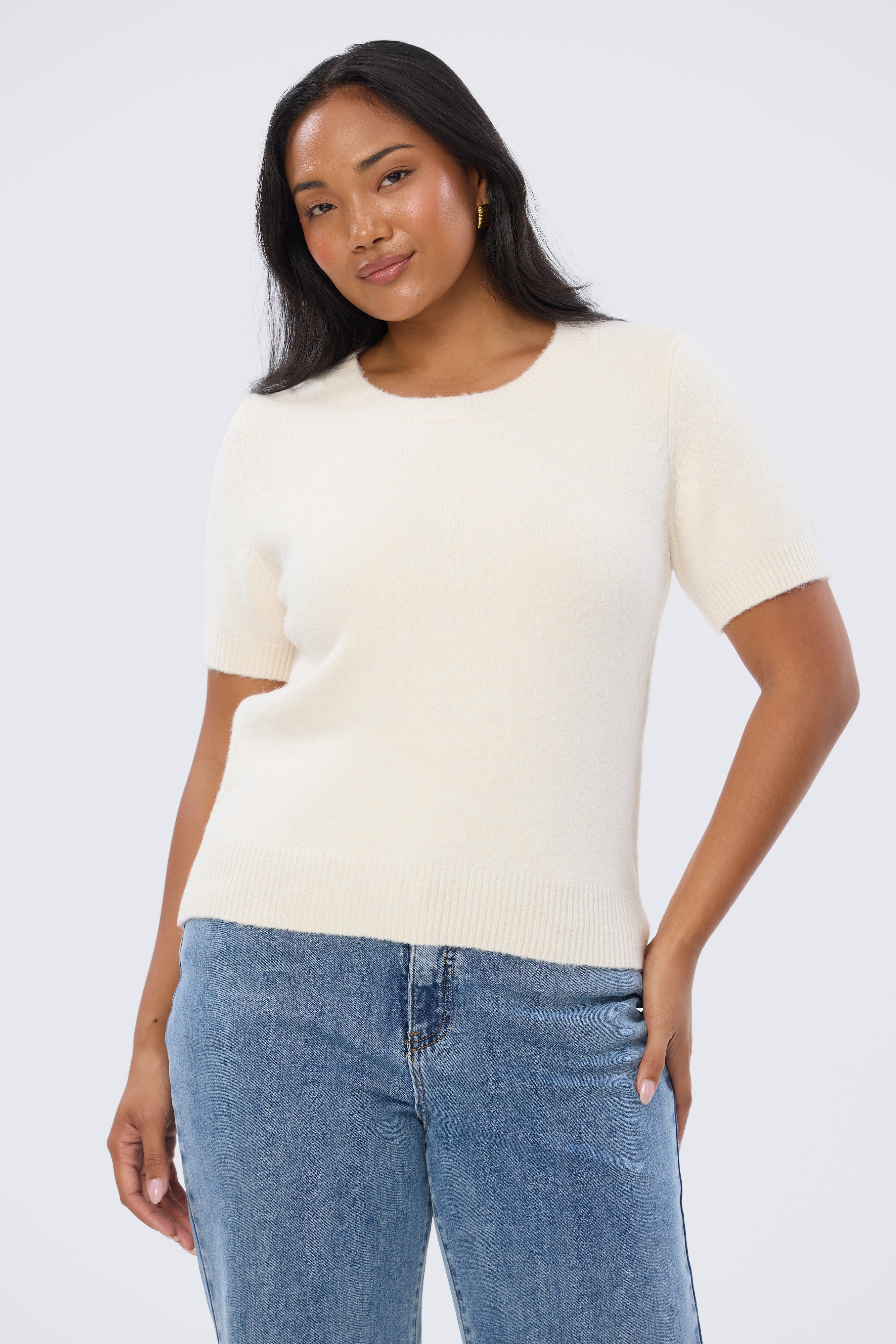 The Textured Short Sleeve Knit Top in Ecru is crafted from mid-weight textured knit for a comfortable, relaxed fit. With subtle rib detailing and a high round neckline, it’s a timeless, trans-seasonal piece to wear into the cooler months.