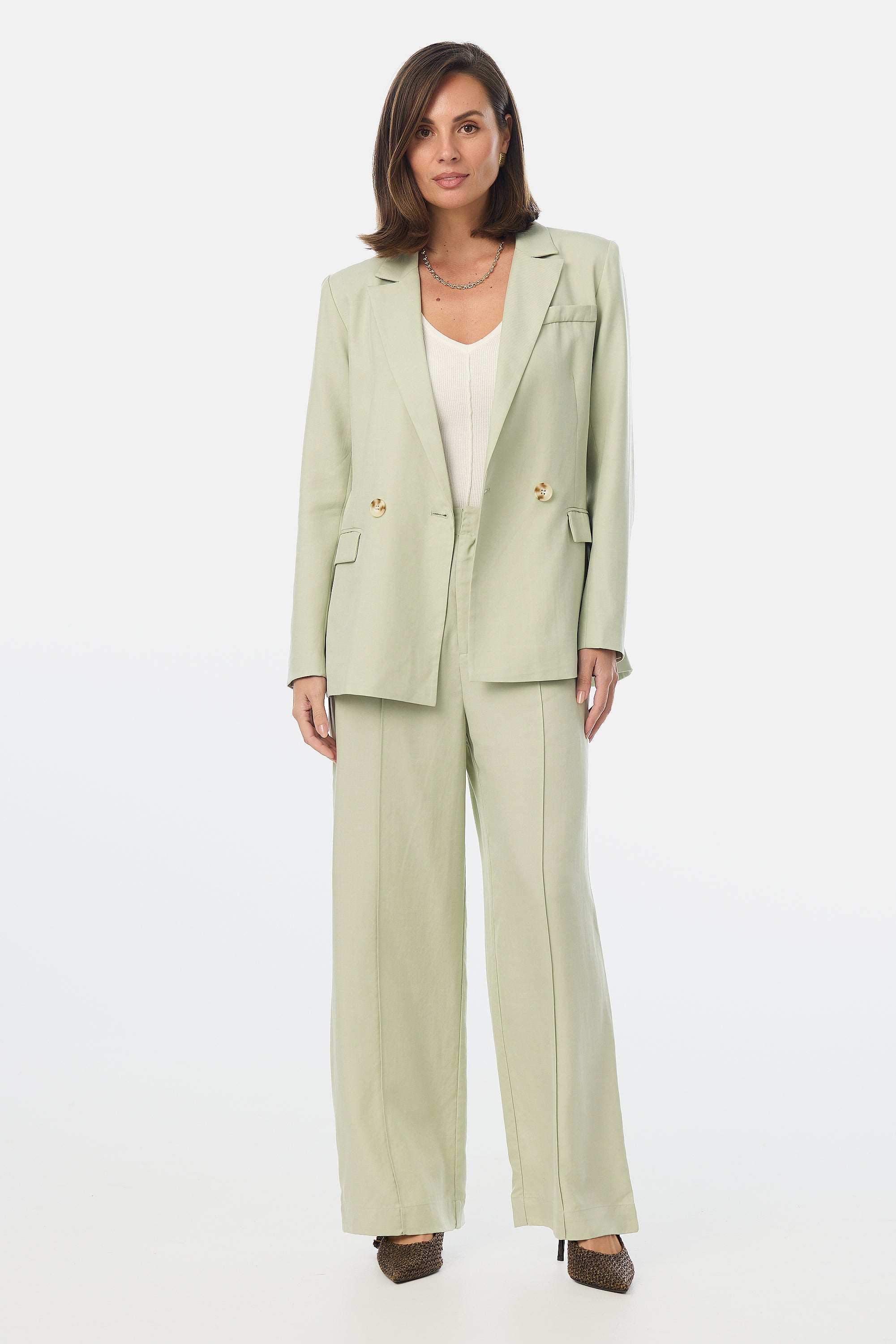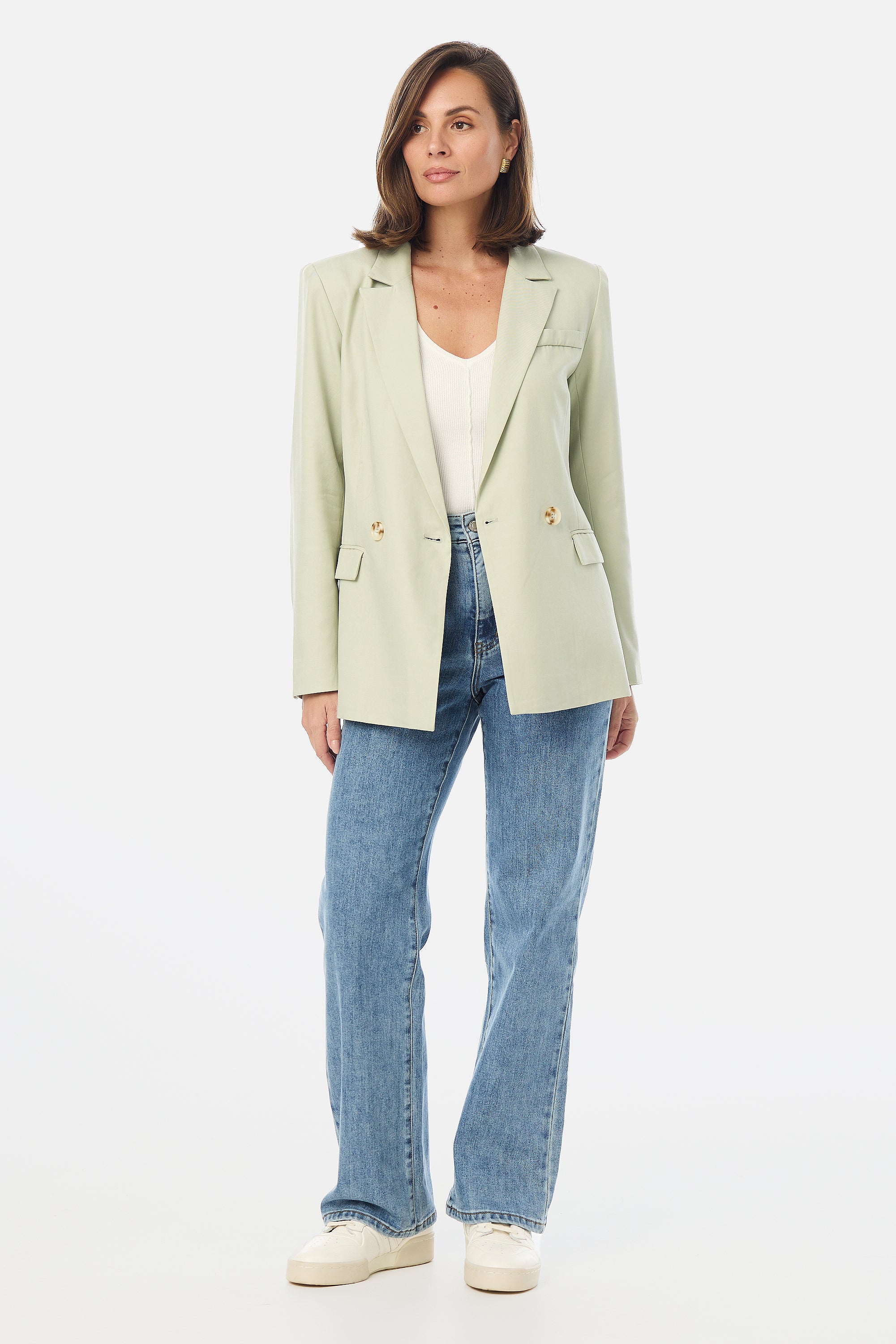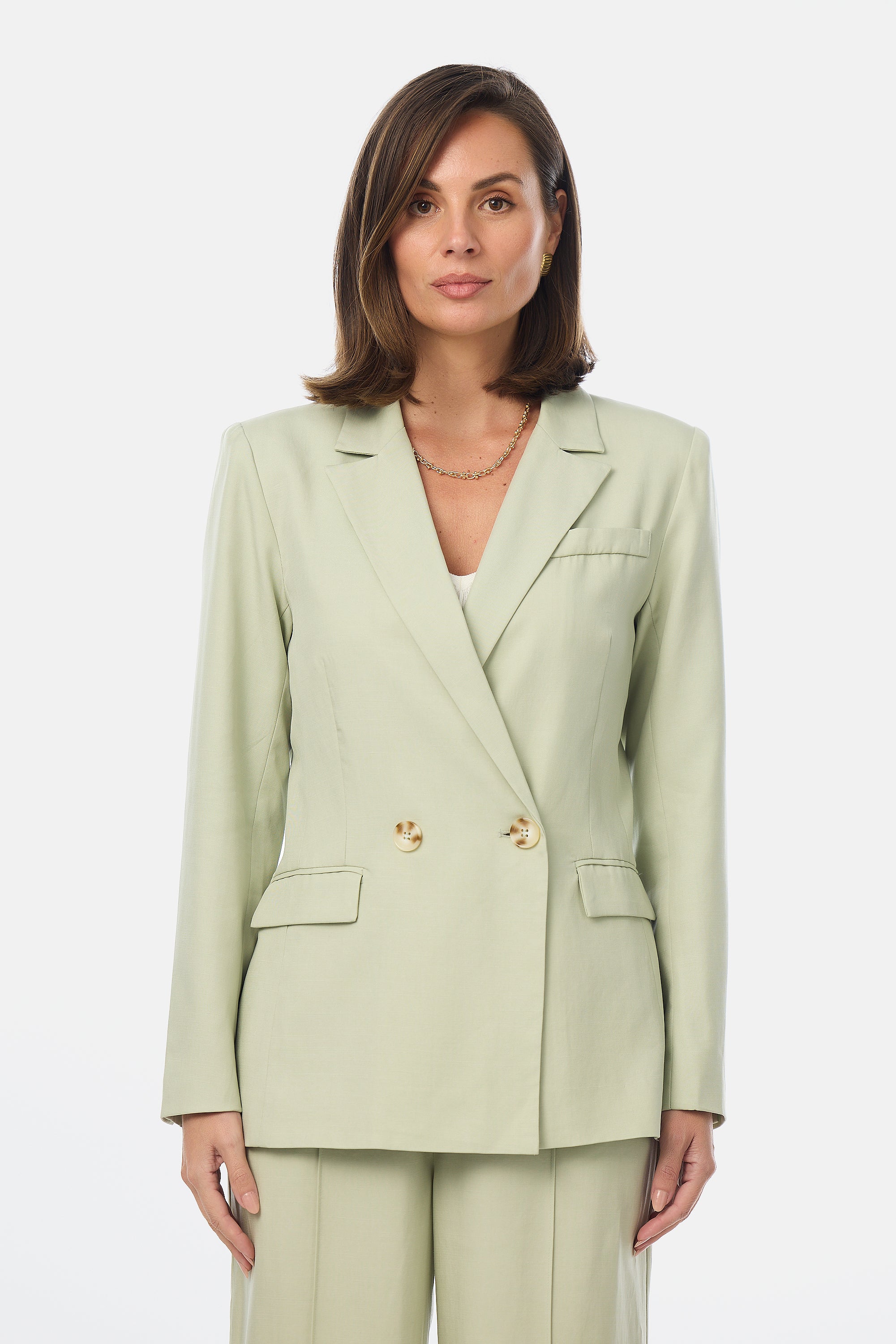 A fresh perspective on tailoring, the Tailored Double Breasted Blazer in Pistachio is your go-to for sleek layering. With its tailored shape, soft drape, and smart details, it works just as well styled with matching suiting as it does over denim.