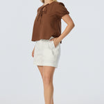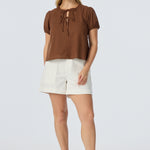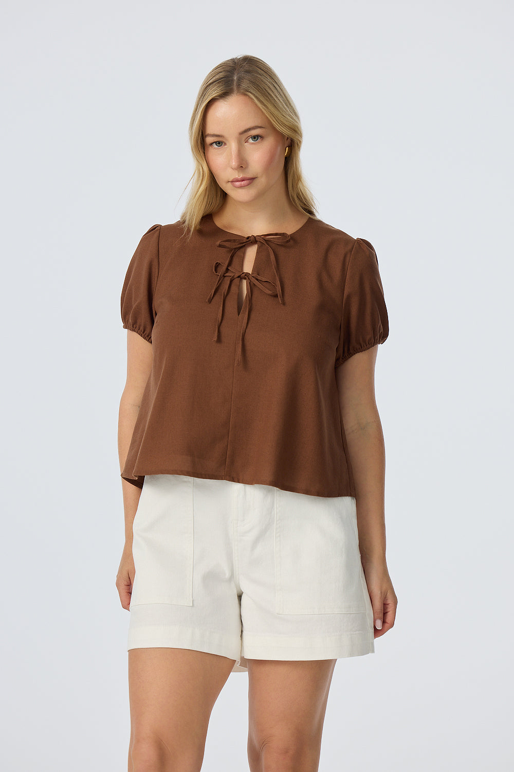 The Double Tie Front Top in Walnut features a clean keyhole neckline and twin front ties for a soft, feminine finish. With gathered sleeves and a relaxed silhouette, it’s an effortless piece designed to elevate everyday dressing.