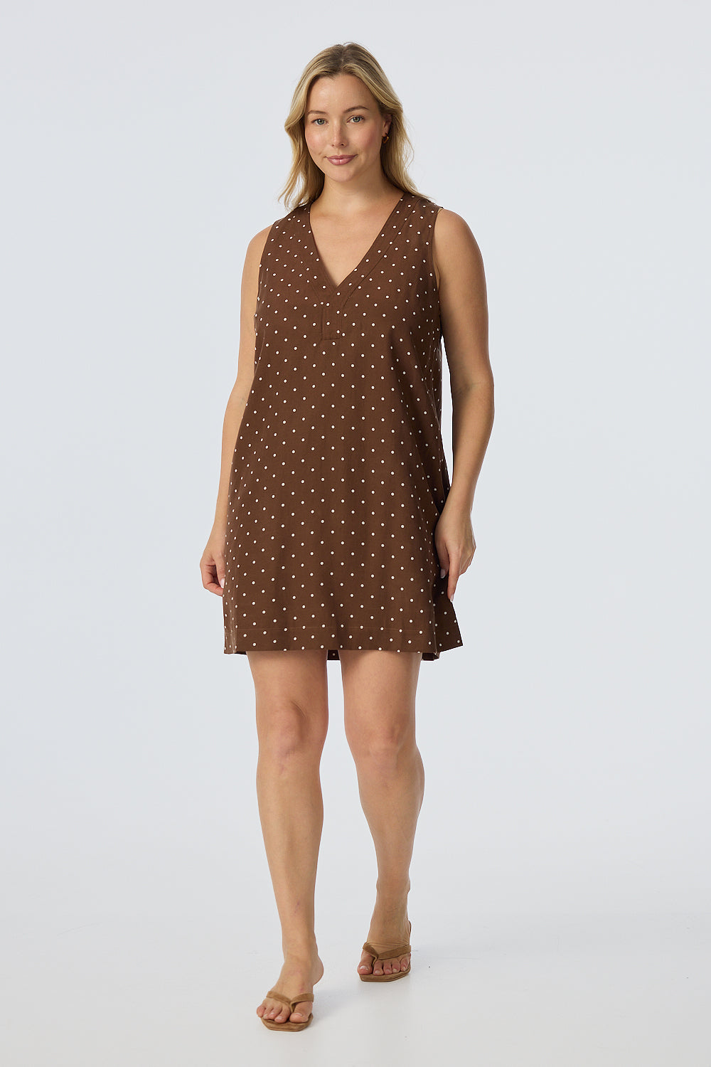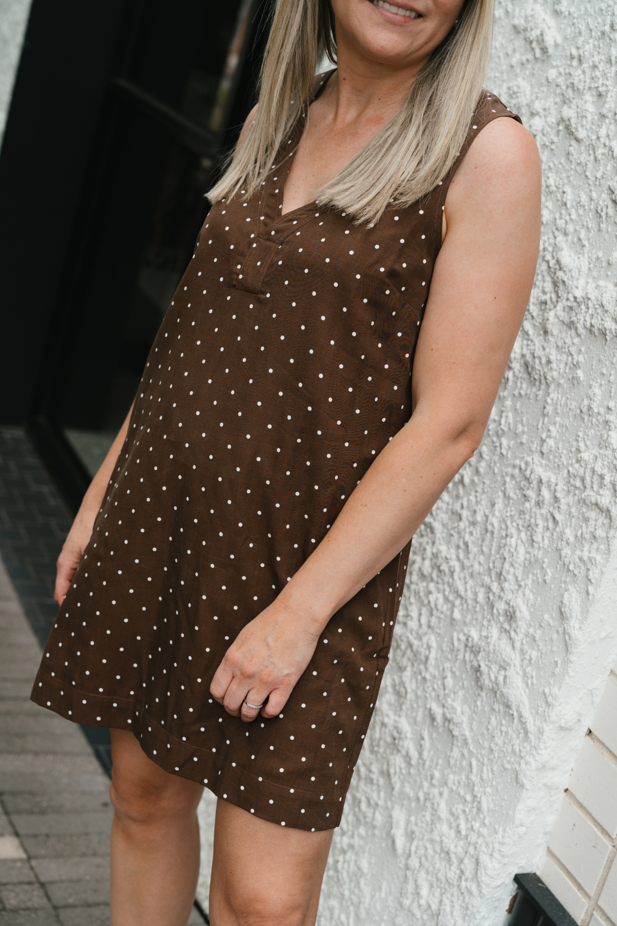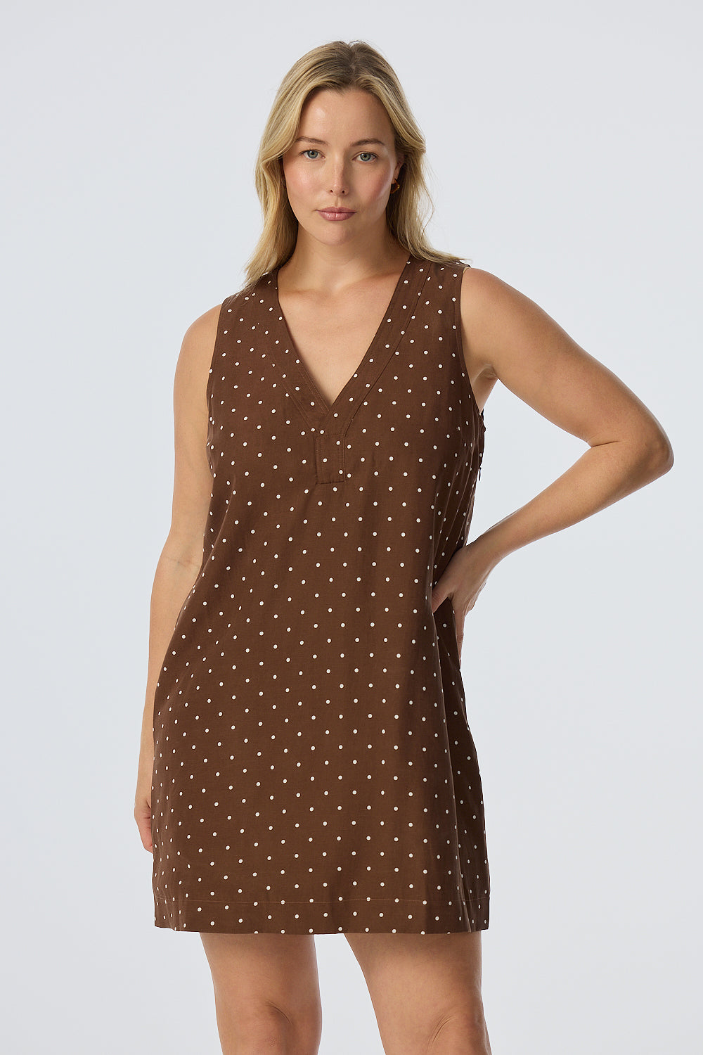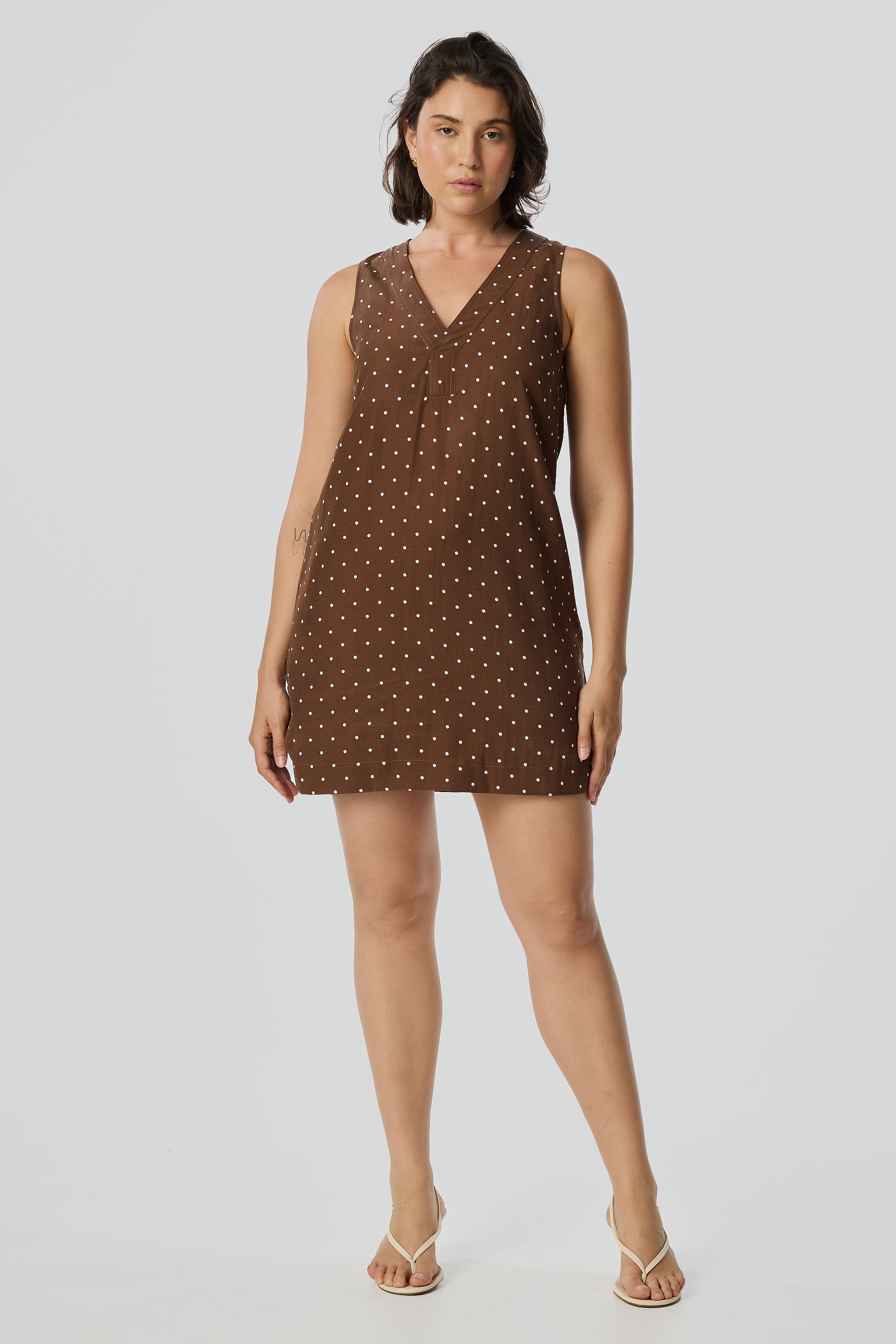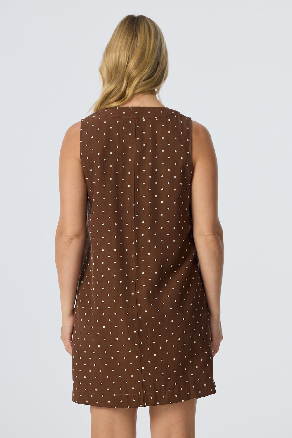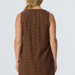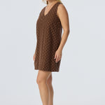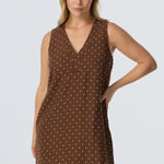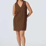 Relaxed yet elevated, the Placket Mini Dress in Walnut/White Spot combines soft structure with casual ease. With a V-neckline, wide placket detail, and sleeveless silhouette, it's an effortless all-in-one outfit in a mid-weight, fully lined fabric.