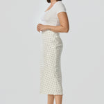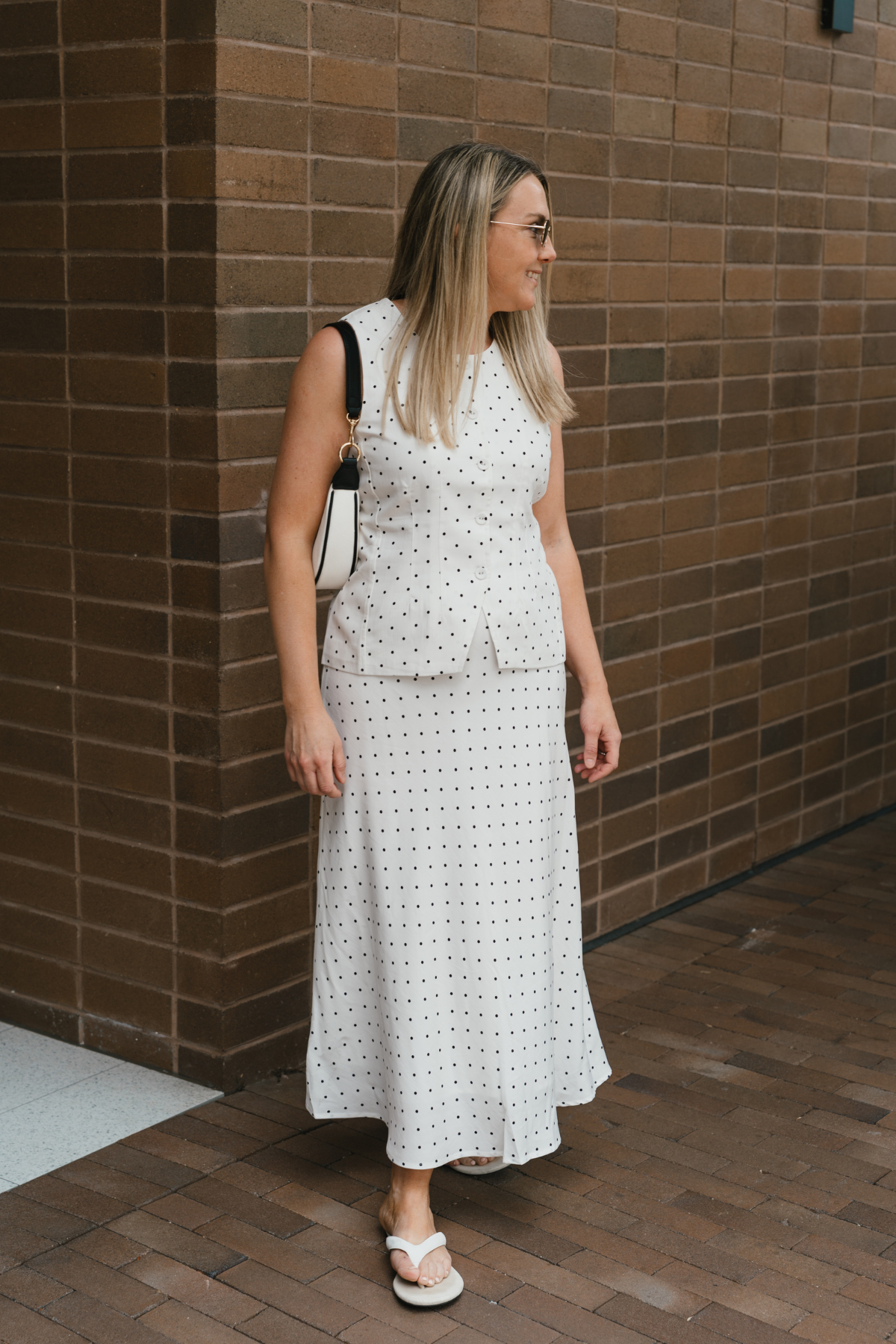 The Slip Midi Skirt in White/Black Spot sits at the natural waist and features internal back elastic and a bias-cut silhouette for a flattering fit. Fully lined and midi length, it pairs beautifully with the Adjustable Waist Vest in White/Black Spot, making it the perfect effortless outfit for casual events this season.