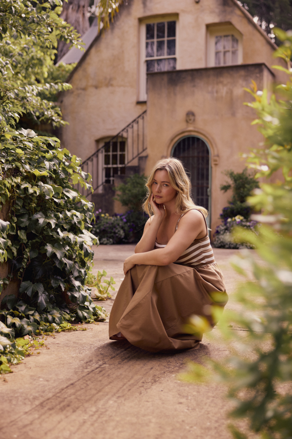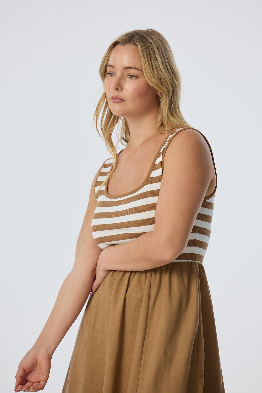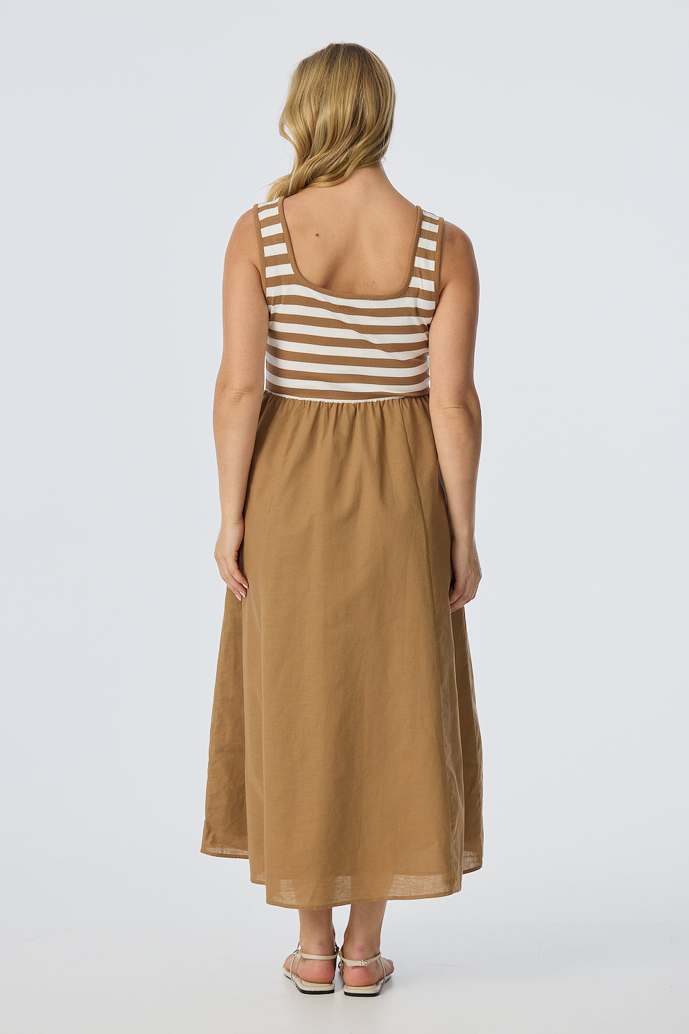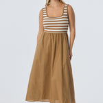 The Square Neck Gathered Dress in Biscotti/White Stripe features a flattering square neckline with contrast rib and an internal elasticated waist for shape. Cut in an A-line midi silhouette with inseam pockets, it combines a jersey bodice with a cotton-linen skirt for all-day comfort.